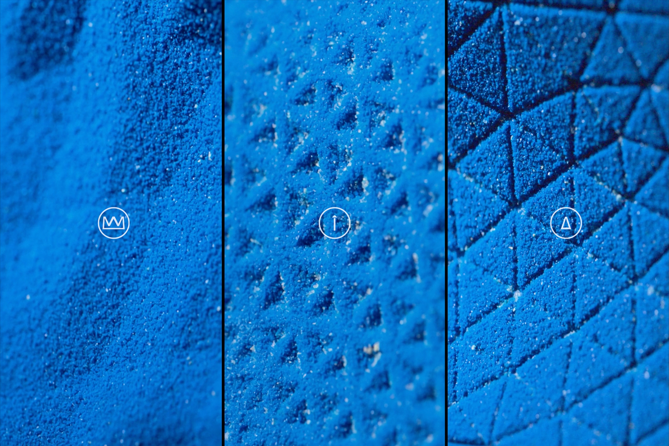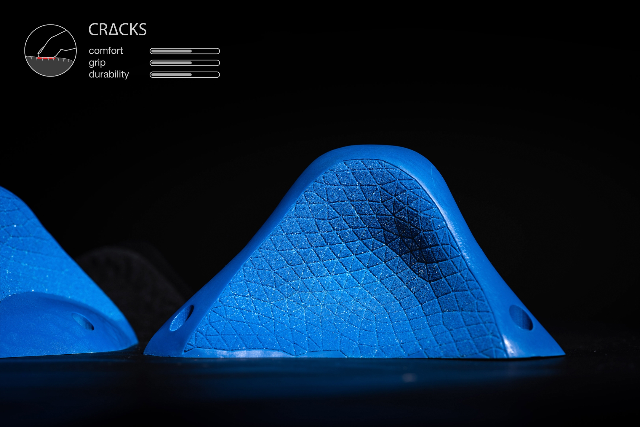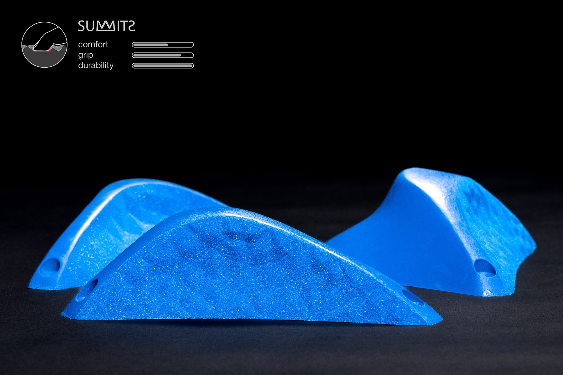 Innovation Climbing gyms need to regularly replace and throw away their used holds because they lose grip with time, gradually becoming smoother through friction and magnesia powder obstructing the pores. Our geometrical patterns greatly reduce the surface wear of the holds, making them more durable, ecological and economical for climbing gyms, who can keep their holds much longer.