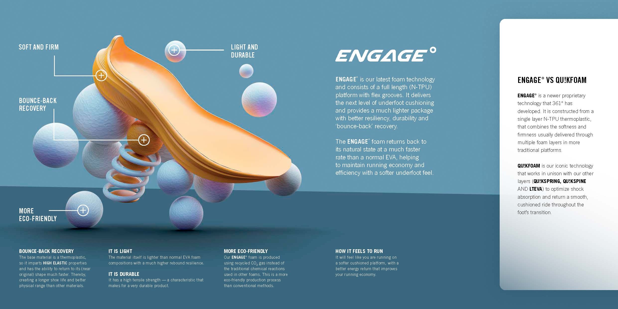 Innovation ENGAGE˚ is our latest foam technology and consists of a full length (N-TPU) platform with flex grooves. It delivers the next level of underfoot cushioning and provides a much lighter package with better resiliency, durability and ‘bounce-back’ recovery. The ENGAGE˚ foam returns back to its natural state at a much faster rate than a normal EVA, helping to maintain running economy and efficiency with a softer underfoot feel. Our ENGAGE° foam is produced using recycled CO2 gas instead of the traditional chemical reactions used in other foams. This is a more eco-friendly production process than conventional methods.