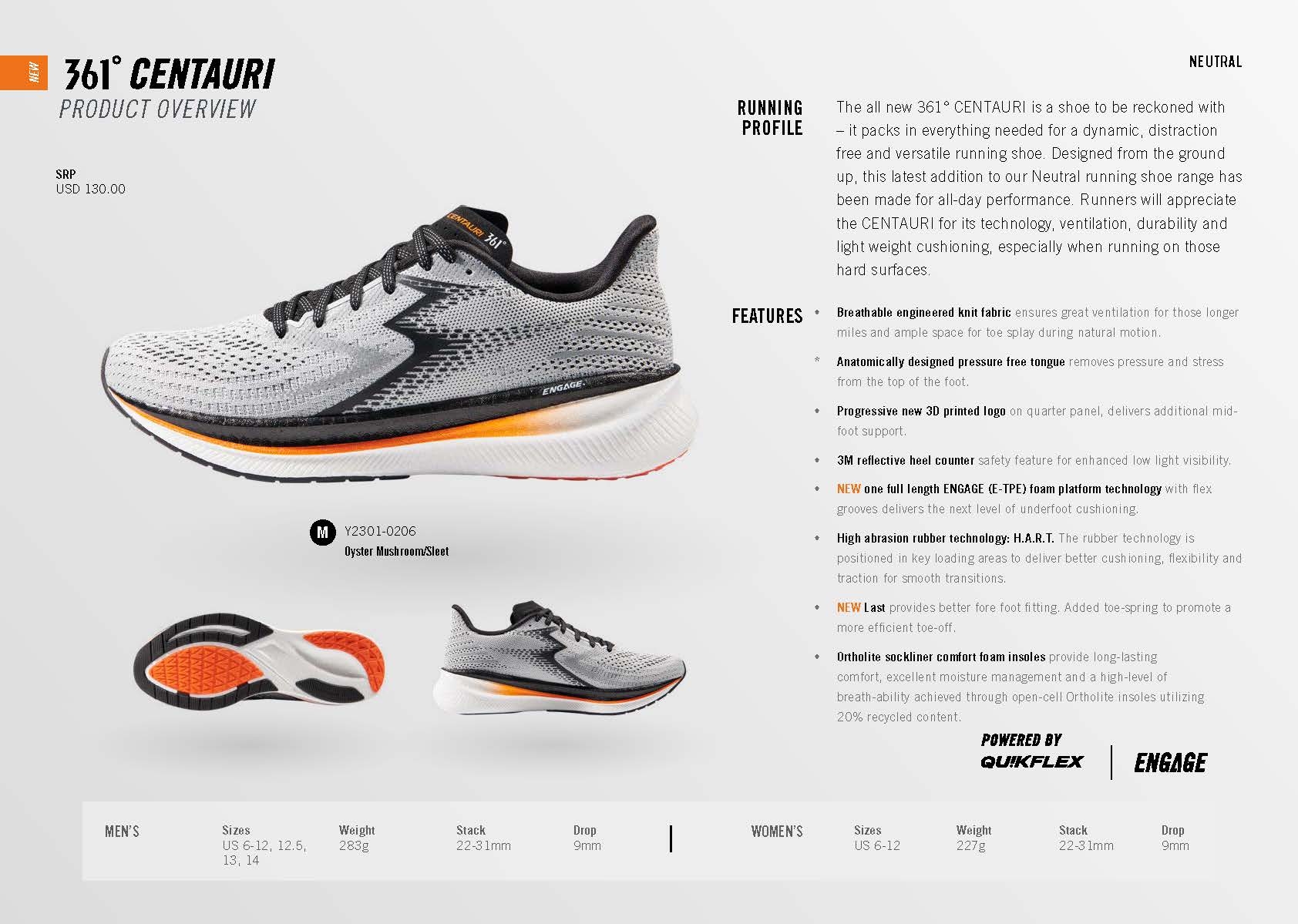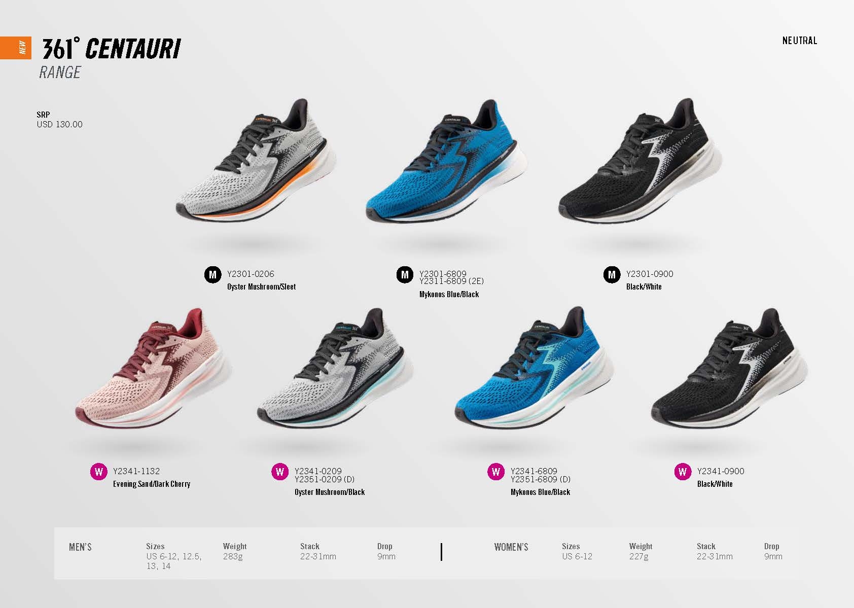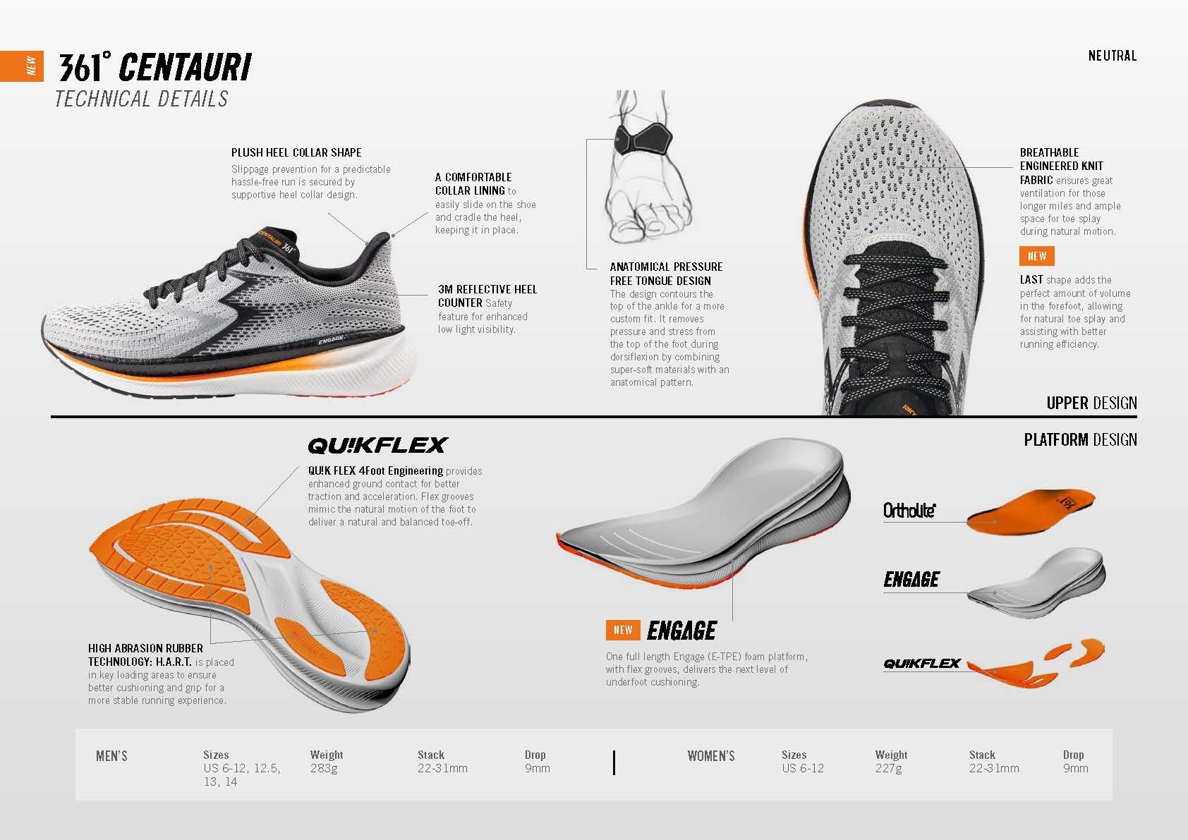 Description The all new 361° CENTAURI is a shoe to be reckoned with – it packs in everything needed for a dynamic, distraction free and versatile running shoe. Designed from the ground up, this latest addition to our Neutral running shoe range has been made for all-day performance. Runners will appreciate the CENTAURI for its technology, ventilation, durability and light weight cushioning, especially when running on those hard surfaces.