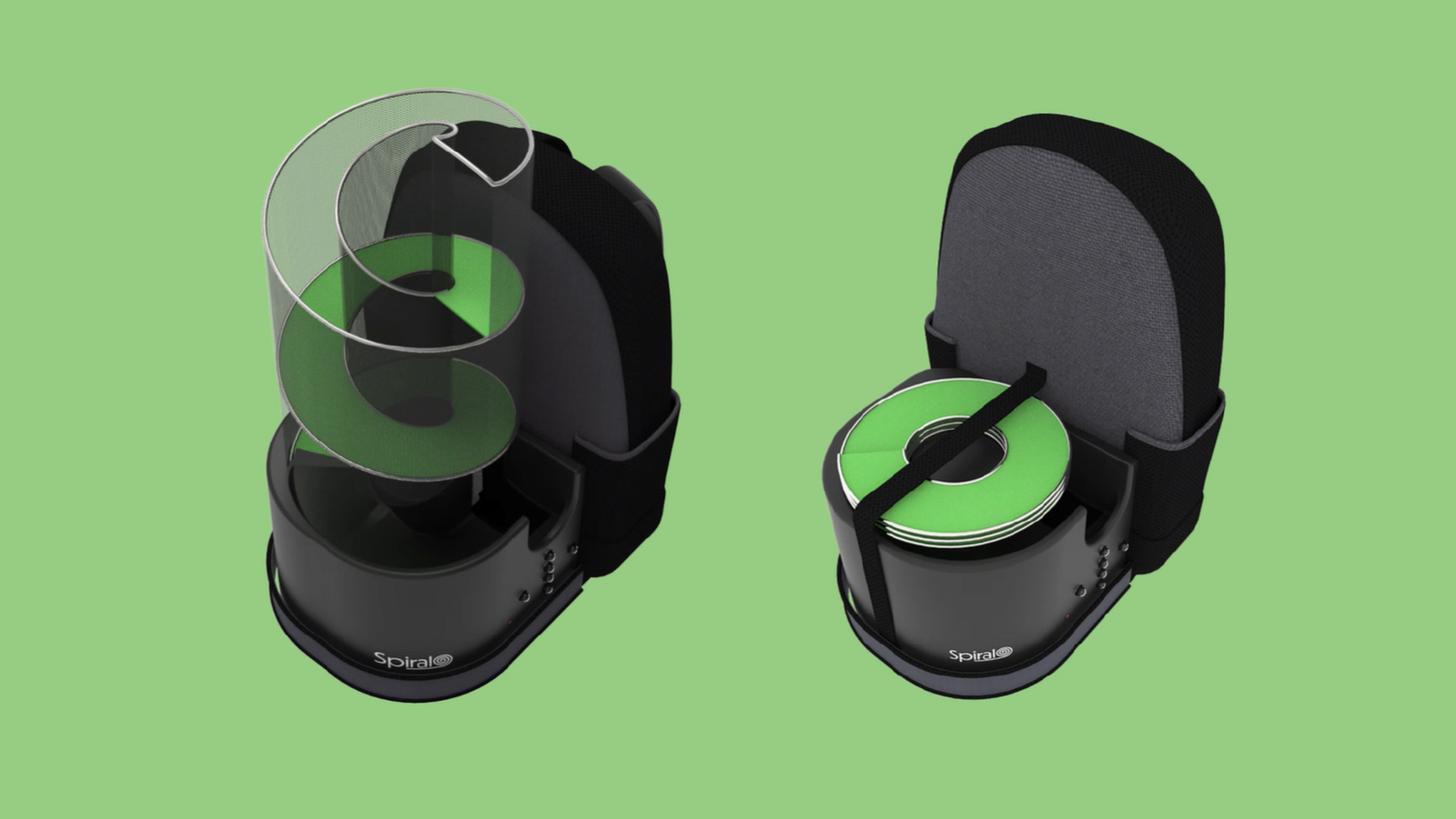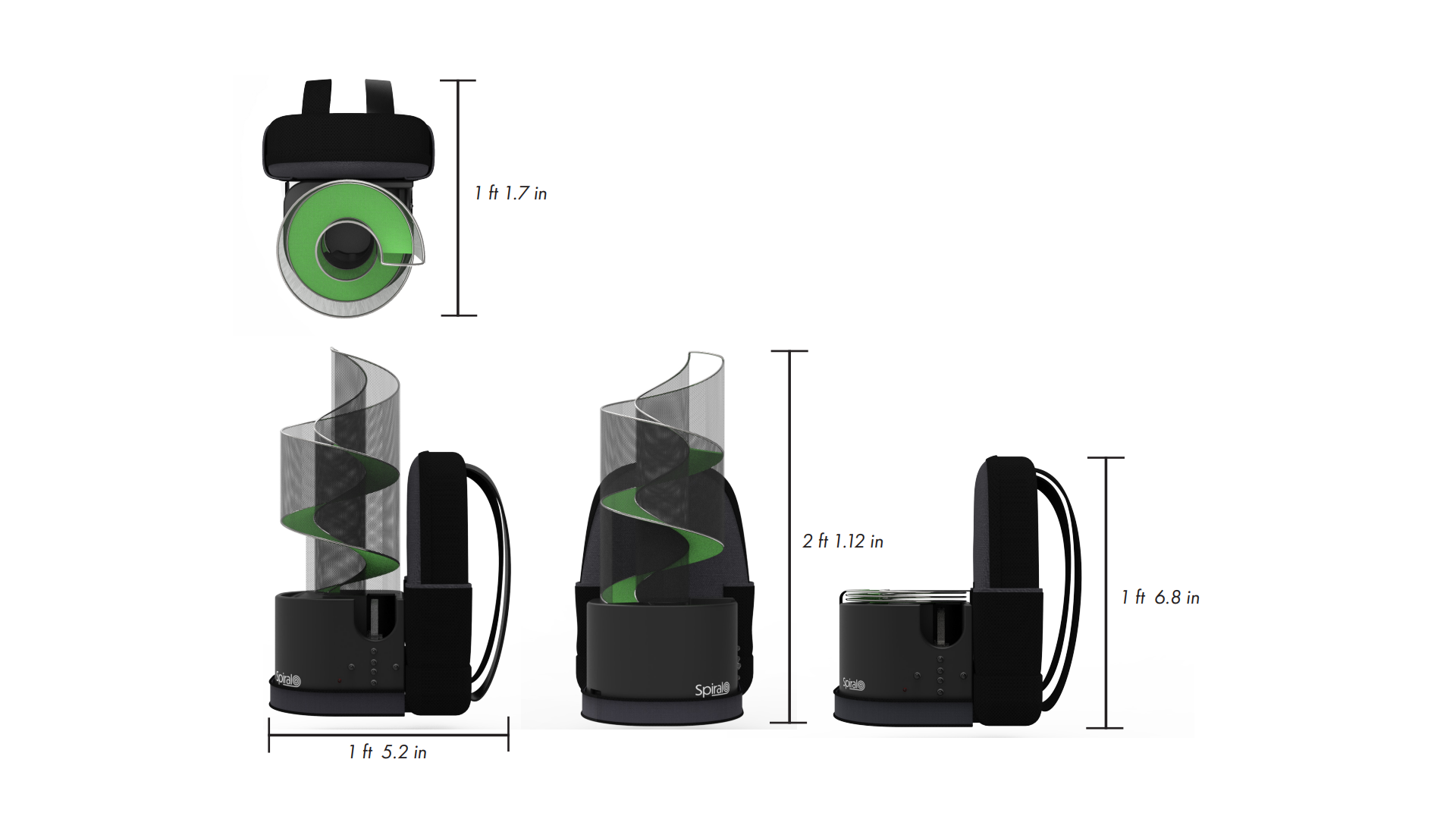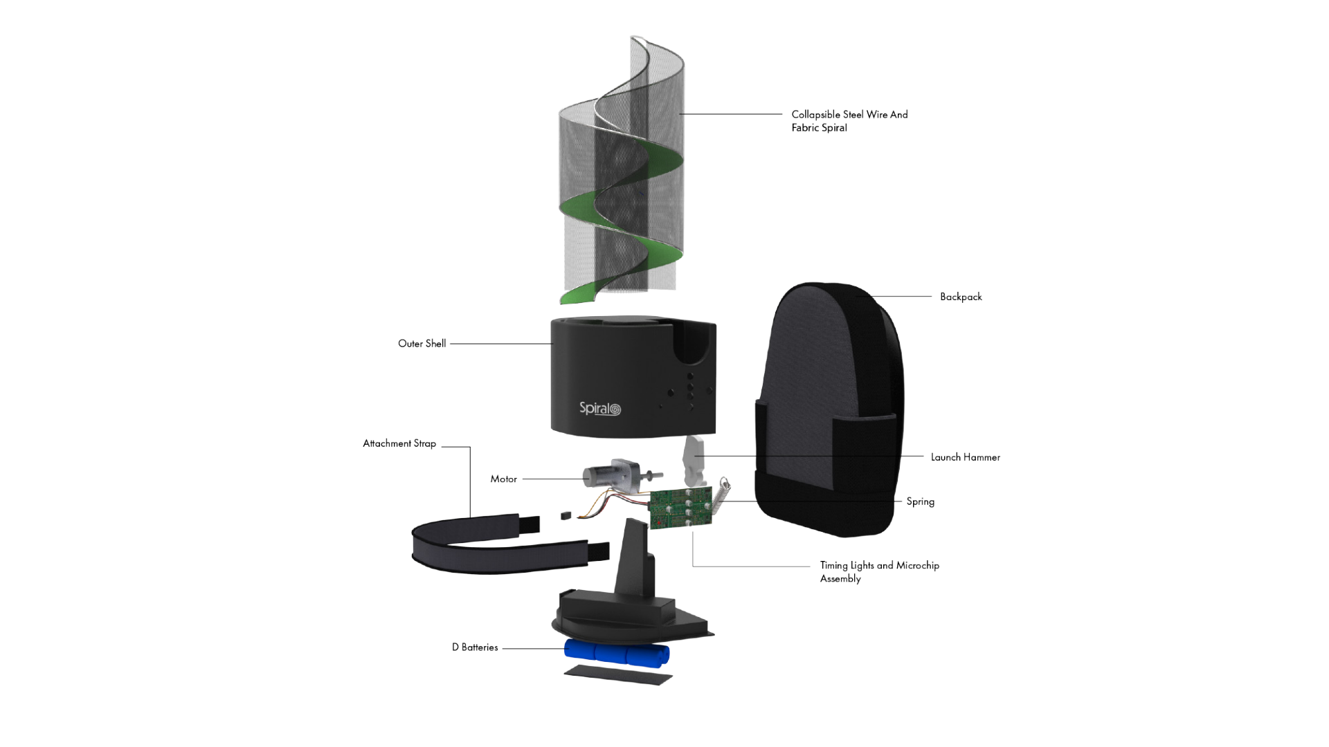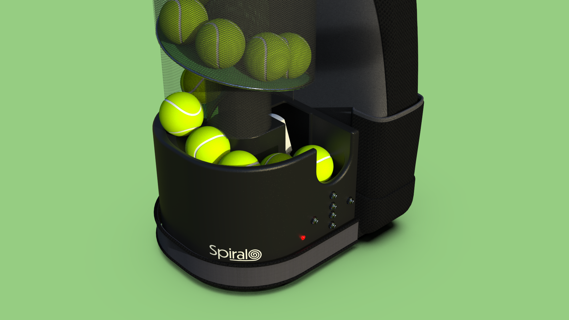 Description Spiral uses a long compactable curving path to feed the balls into the ball launcher. To the right of the device is a removable backpack attached to the main plastic body in which tennis balls and other tennis equipment can be stored. The collapsible spiral can be transported easily by strapping it down which also acts as the attachment. The device features a lights system that students can use to practice timing and footwork.