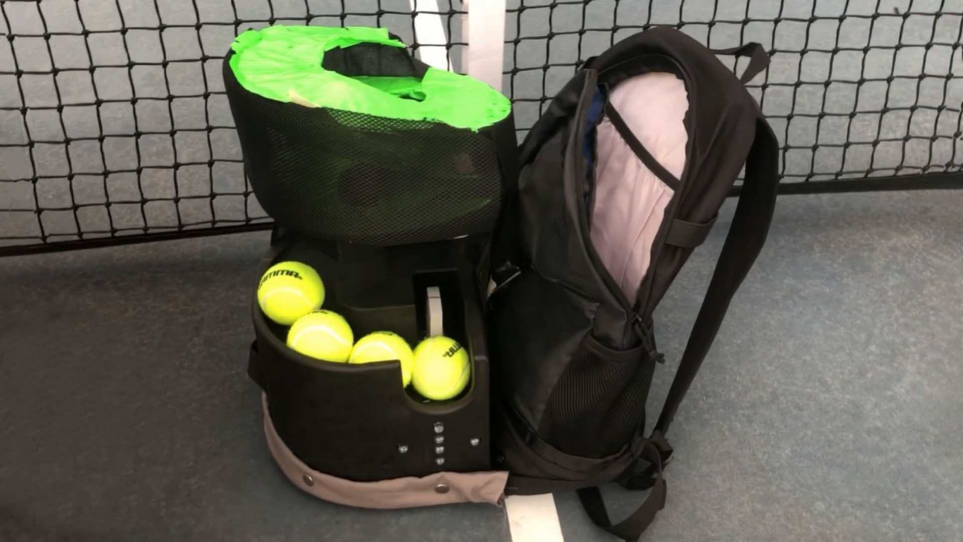 Product Detail The main body would be made of a high-impact plastic such as ABS. The color of the track would be a basic green to match the lightness and distinguished color of the tennis balls. The rest of the body would be various shades of black and grey. A durable fabric such as Econyl can be used for the bag. A mesh fabric covering would be used on the outside of the steel wire spiral so people would be able to see the balls rolling down the track, something many described as a delight in other tennis machines.