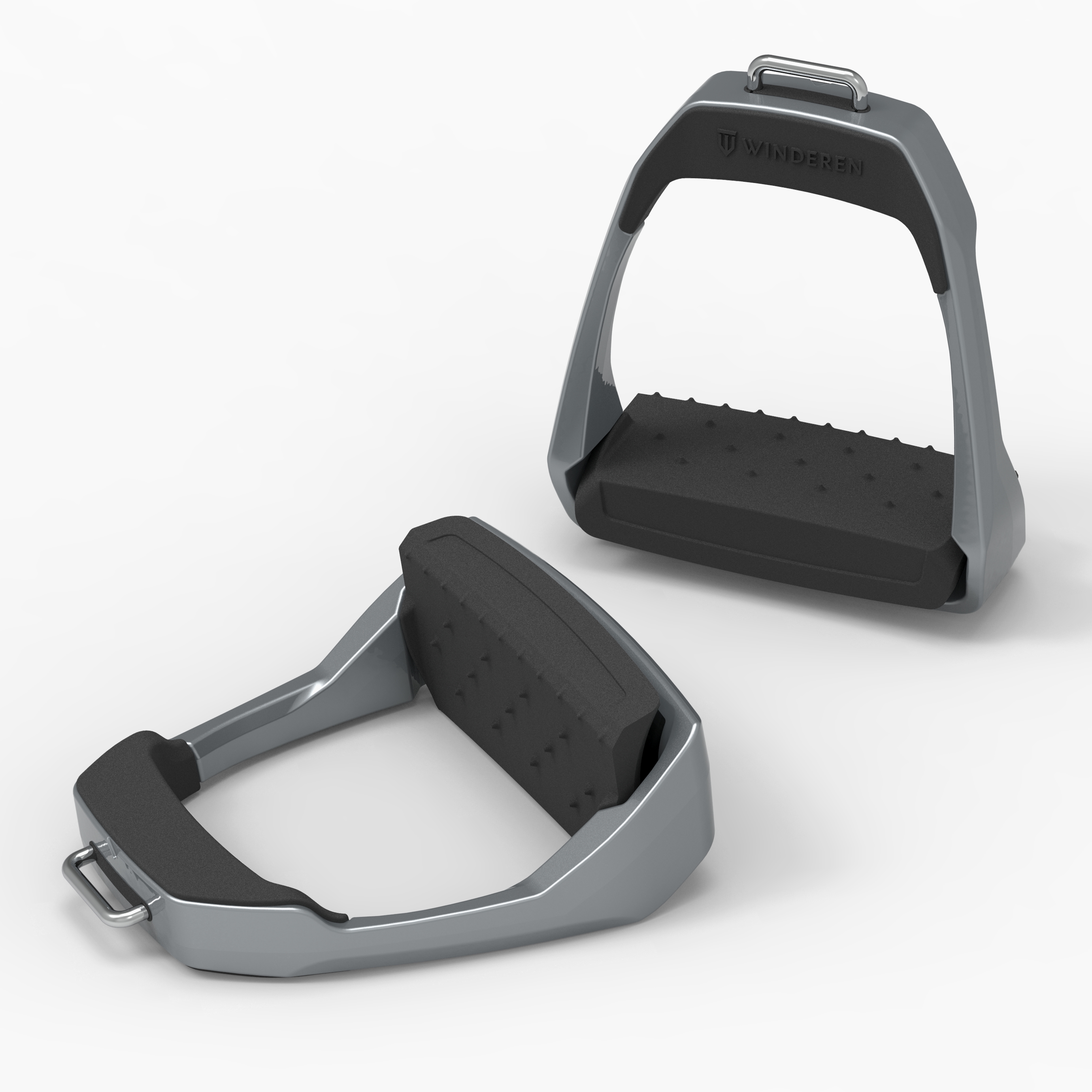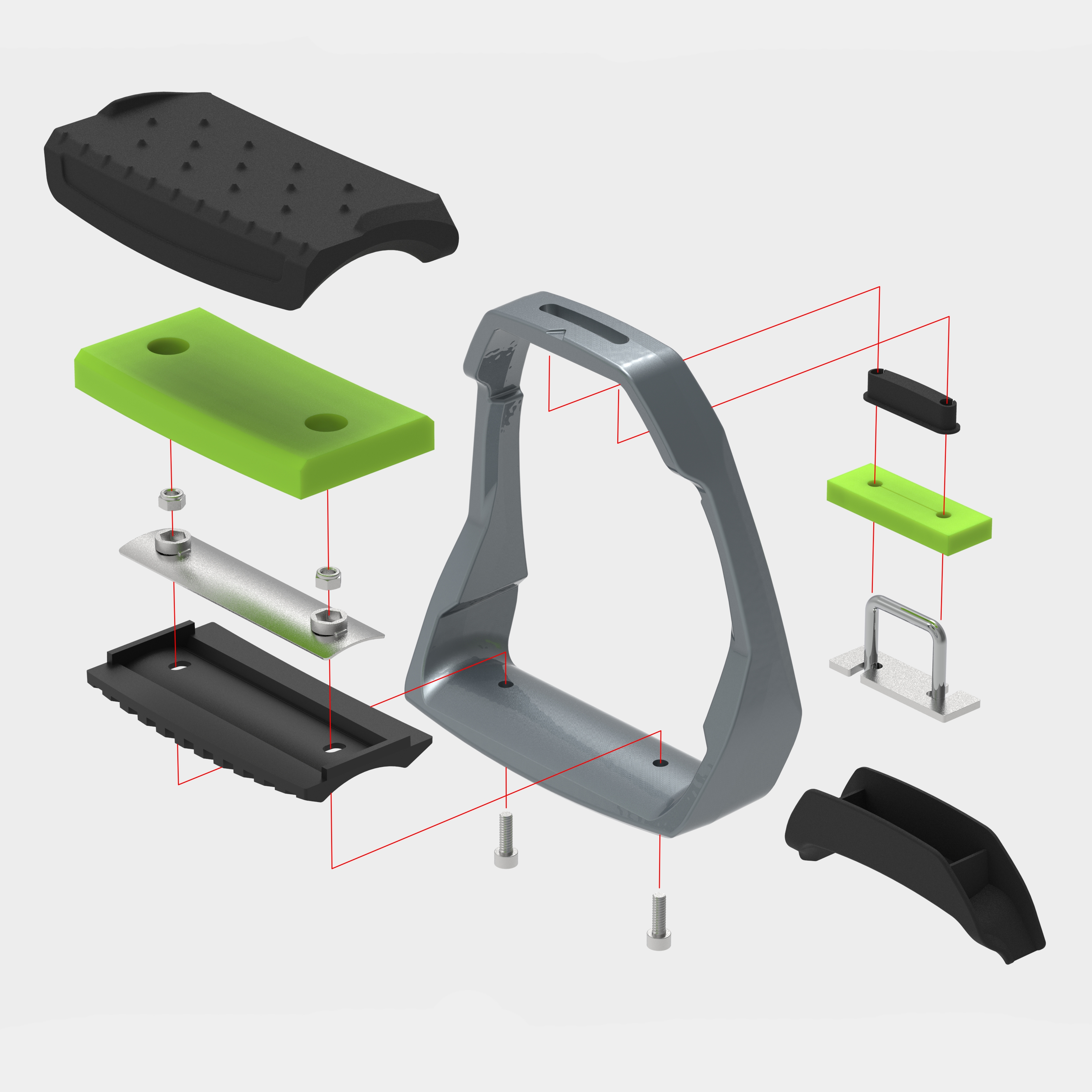 Description The project was developed in cooperation with the Winderen company, which has noticed the problem of injuries when horse riding, especially when jumping over fences, where the load on the joints is enormous. That’s why they asked us to design stirrups with two absorbers relieving the load on joints. After many experiments, we prepared the design brief together. Our goal was to convert the idea into an aesthetically pleasing design and safe and strong structure. Its dynamic form reflects the character of the equestrian sport. During design work, we had in mind the technological conditions of the manufacturer. In effect, the product includes a lower amount of parts.