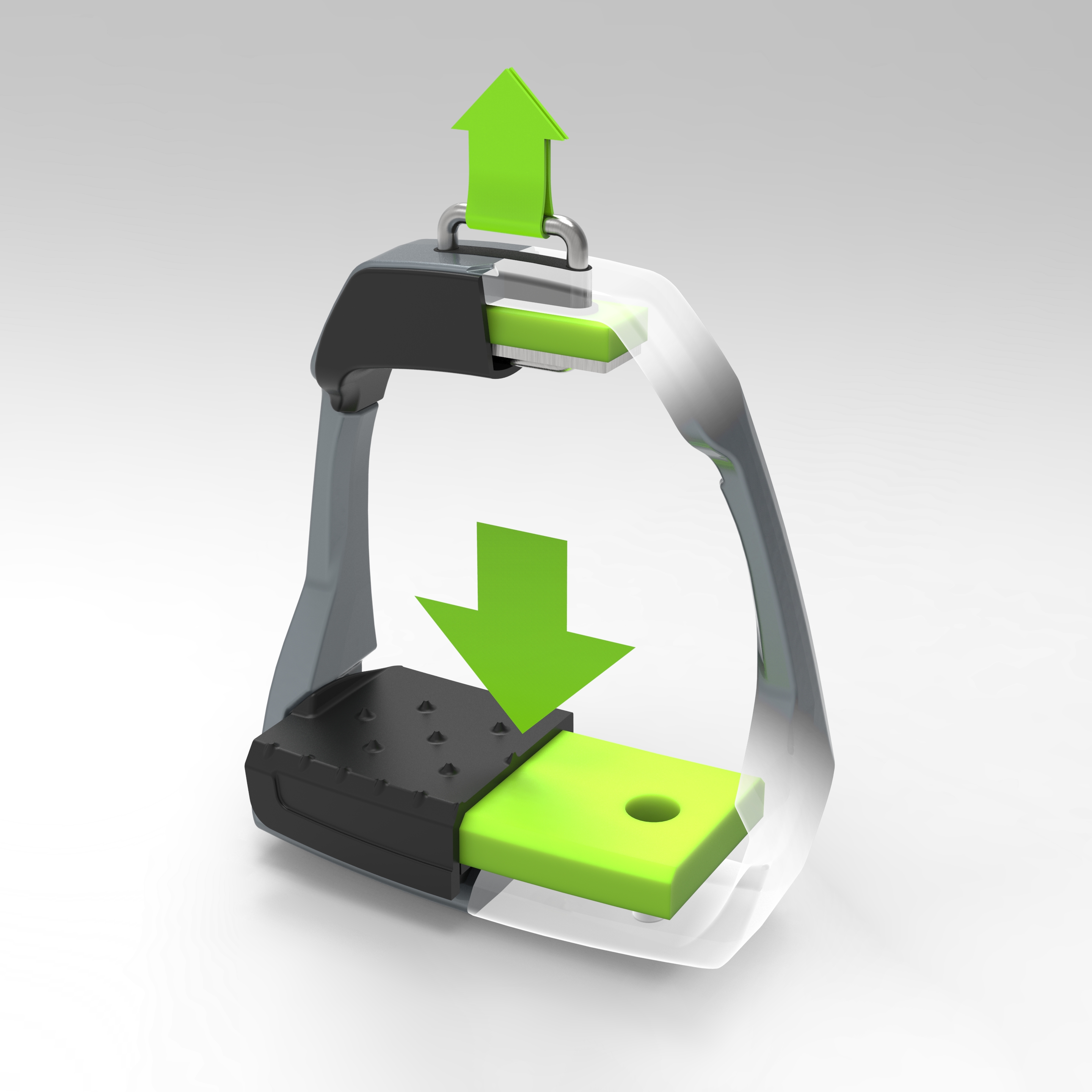 Innovation The first stirrup that protects the joints of knees and ankles from overloads while horseriding. Having two energy absorbers - the first one inside the foot pad, and the second one at the upper pendant. Foot pad angle is adjustable according to preferences of the user.