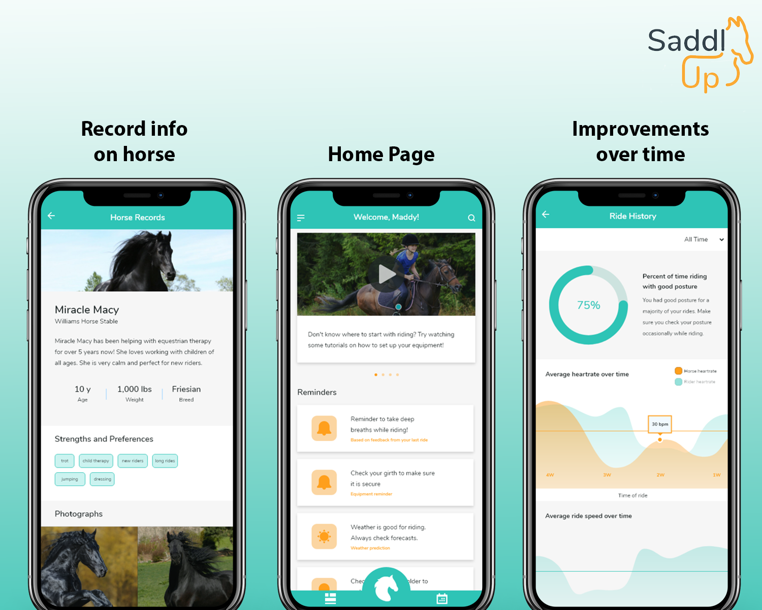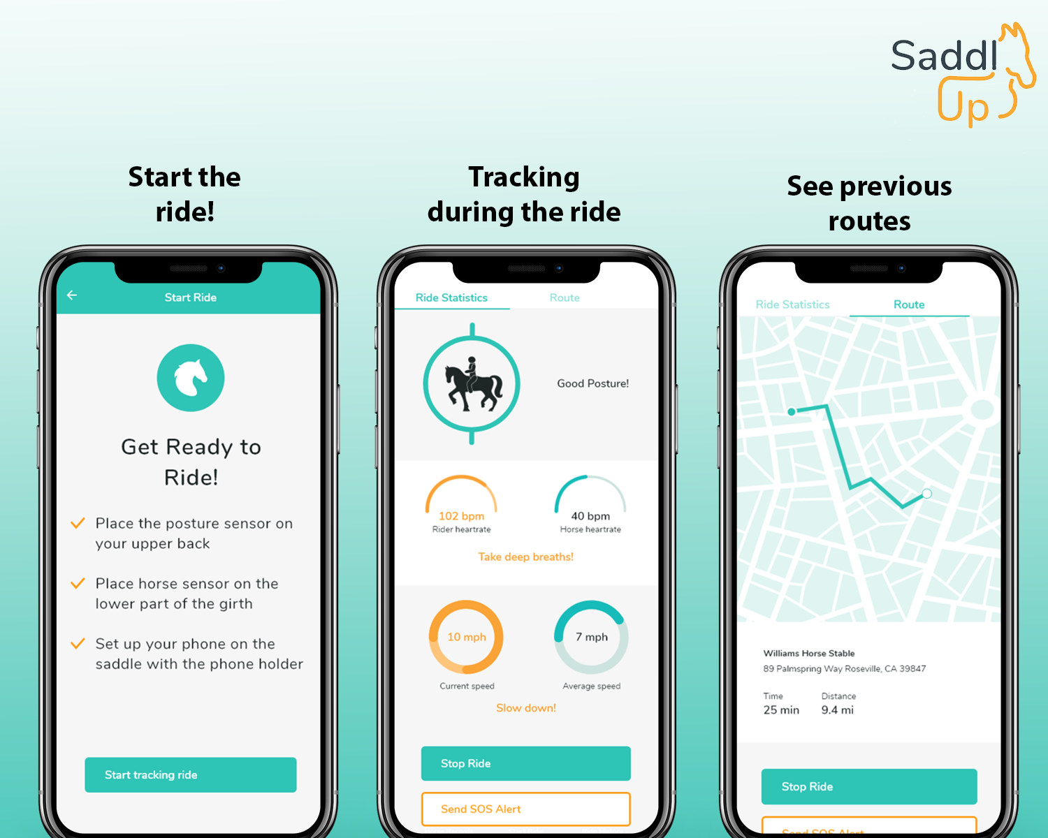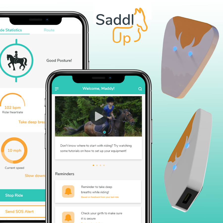 Innovation The SaddlUp app and sensor kit is an innovative yet practical way to make horseback riding more accessible to young riders, helping riders to improve their posture and balance while riding. Horseback riding provides many benefits to children, helping them improve their mood, their balance, and their self-esteem all while bonding with an animal. The problem is that horseback riding requires good posture or else there is a risk of the rider damaging their spine. Existing products may help new riders learn how to sit on the horse, but only SaddlUp provides real-time feedback to help users improve their posture as they ride. Simply attach the sensor to the collar of a shirt using the magnetic clip and then connect the sensor to the app via Bluetooth. Hit 'Start Ride' on the app, and then start riding! The sensor will track the rider's posture and provide simple haptic feedback via vibrations to alert the user when they need to change their posture. The app will track the rider's posture throughout the ride and provide them with a full report at the end so users can track their progress over time.