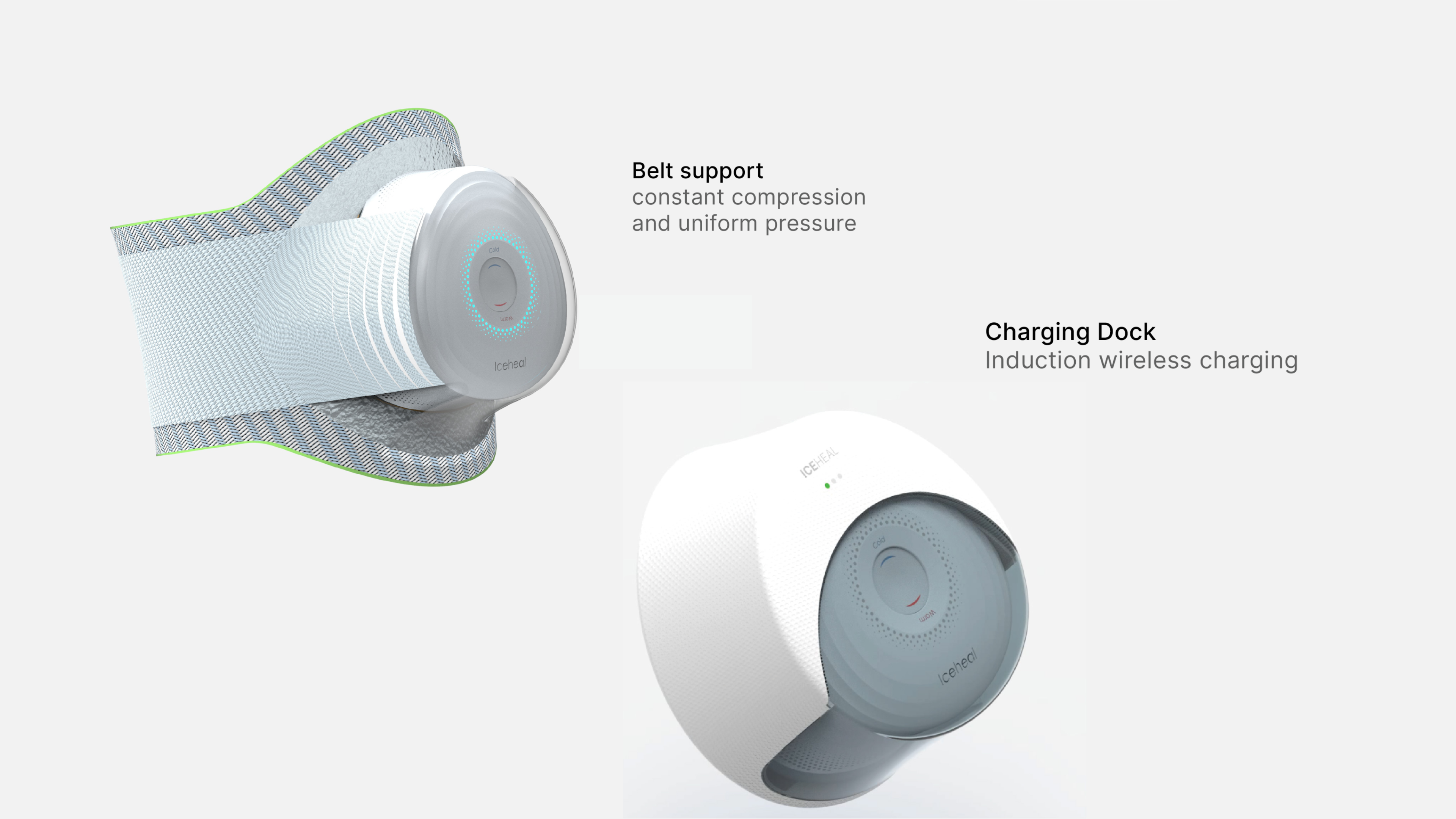 Often unknowingly, users tend to overuse the product, which concerns the physiotherapists. Inbuilt sensors turn off the device after 20 mins (time required for an effective therapy). ICEHEAL comes with a wireless charger and compression belt to help users experience it even while moving.