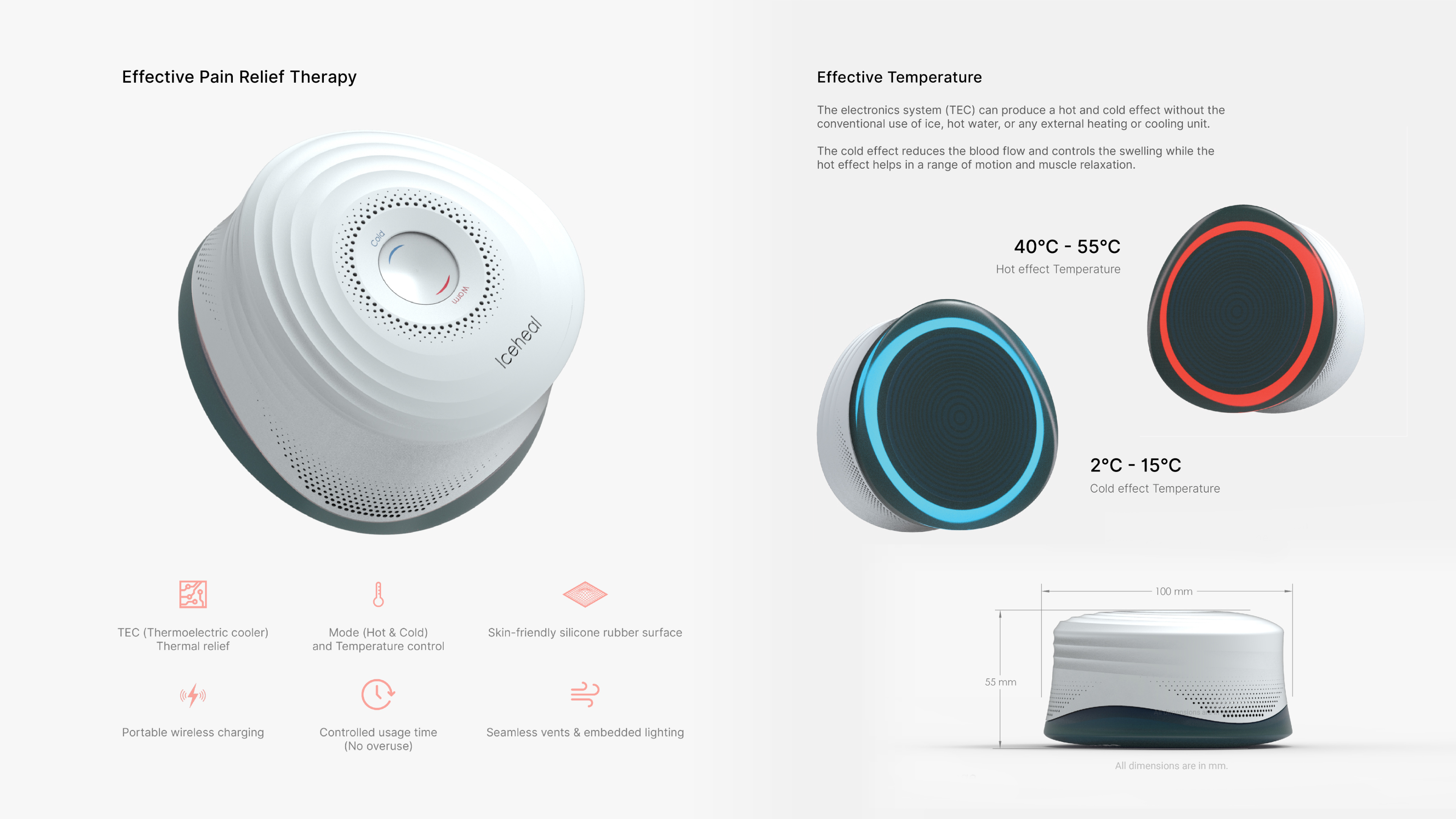 Innovation ICEHEAL is a portable rehabilitation device for quick pain relief & muscle conditioning. ICEHEAL delivers instant cold therapy (2-15°C) and hot therapy (40-55°C) with just a single click without using ice, hot water, or any external heating or cooling unit.