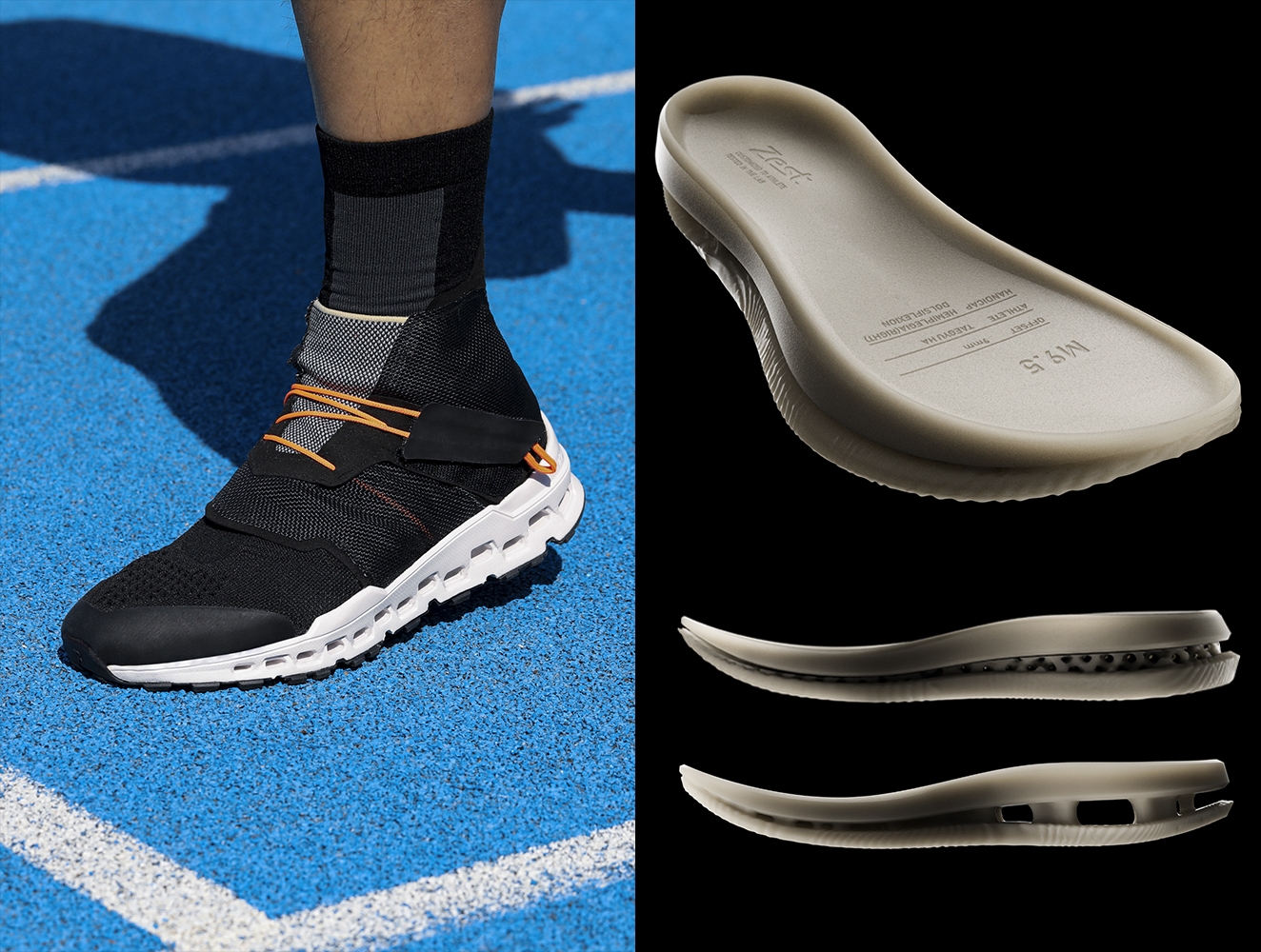 Although CP is one of the most common diseases, there is a lack of shoes for them. Slip-on shoes are unsuitable for exercise because they do not hold the foot well. Nowadays, some football boots are laceless shoes, but applying them to shoes for CP is not a correct solution. Moreover, because the opening is much narrower than a regular shoe, it is much harder for them to wear. Zest provides a high level of form-fitting suitable for running while wearing it easily and quickly with a unique structure. It replaces traditional shoelaces while still allowing for fine-grained fit adjustments. Additionally, professional disabled athletes who require a high level of performance might need custom footwear. With 3D knit and 3D print technology, Zest can be individually customized according to their physical abilities. Although it is a shoe for the disabled, in terms of design and aesthetics, it was important to emphasize functionality as with any other performance shoe.