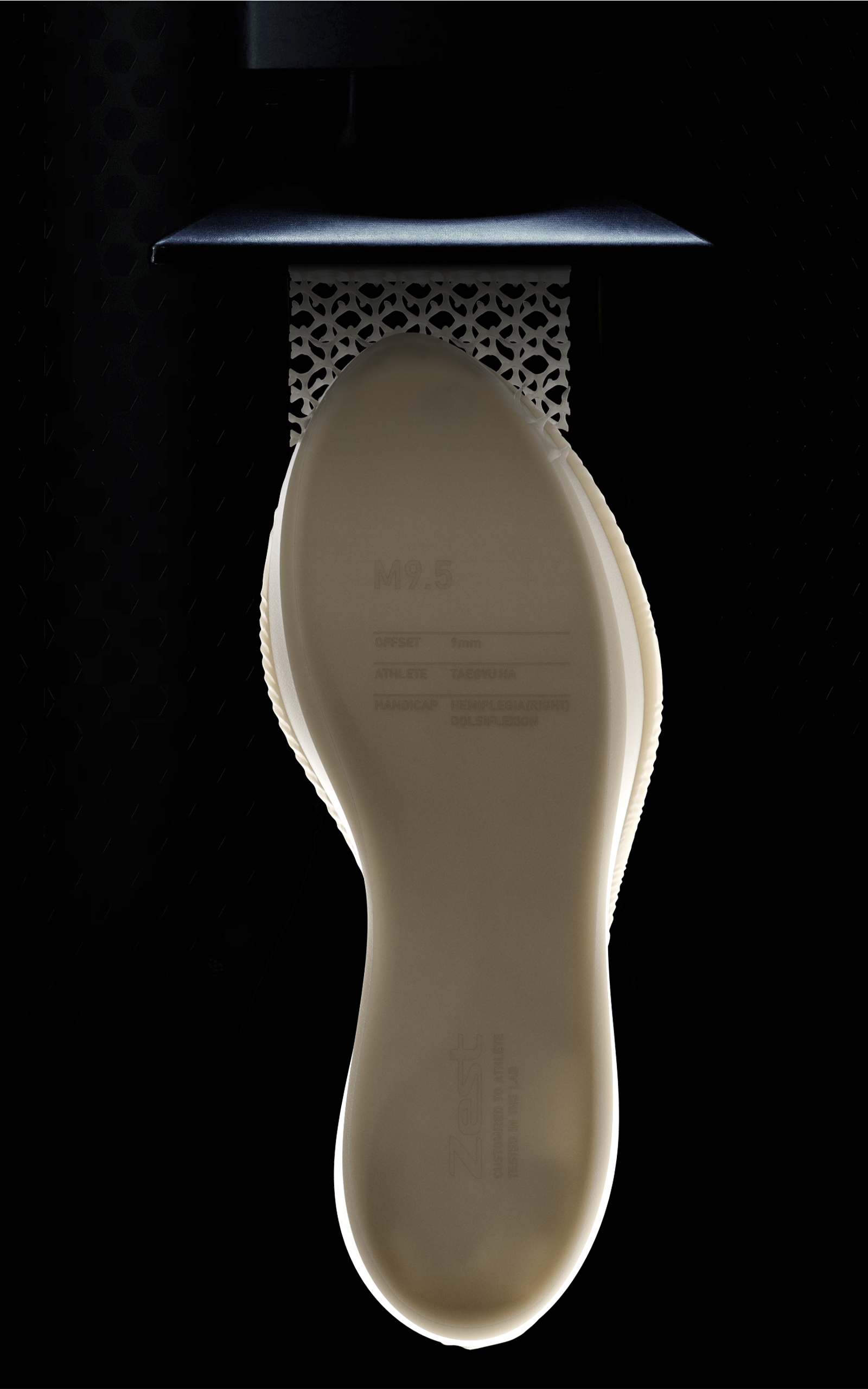 I designed a unique closure system based on feedback from people with CP. When people release the velcro, the opening becomes wider. Then people can slide their feet easily, like wearing slippers. Also, they can adjust their own fit precisely with the additional laced velcro. The upper part is made with 3D knit with a 16-gauge flat knit machine. With 3D knit technology, the pattern can be customized to each person with CP based on the 3D scanned data. Also, the knitted pattern is made of TPU yarn so that it can be used in lightweight and ventilated structures compared with ordinary knitted fabric made of polyamide or polyester. The sole part is made with 3D printing technology and engineered with a generative design tool based on the test result from people with CP. Most of them have different physical abilities. With the generative design tool, people with CP can get their unique sole that meets specific requirements following their physical ability.