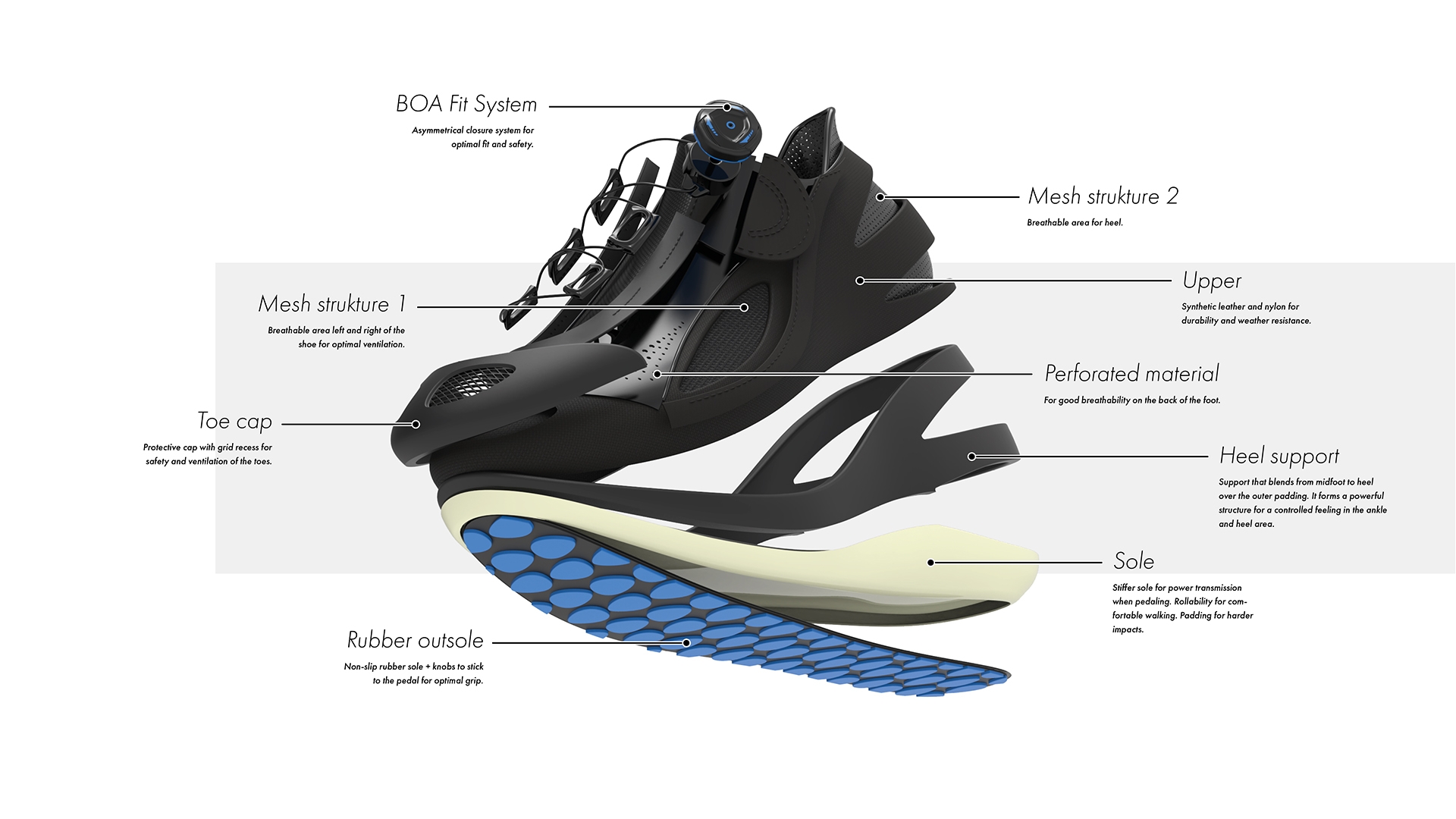 Product Detail The shoe is made of weather-resistent materials, such as nylon and synthetic leather. The shoe’s mechanical structure and perforated materials allow for surrounding ventilation and a breathable shoe. Its construction and “Boa Fit” closure system ensure that it fits tightly, enhancing its performance. The rubber sole sticks to the pedal, for optimal grip. Stiffer than your average sole, it allows for optimal power transmission while pedaling, while offering enough rollability for comfortable walking.