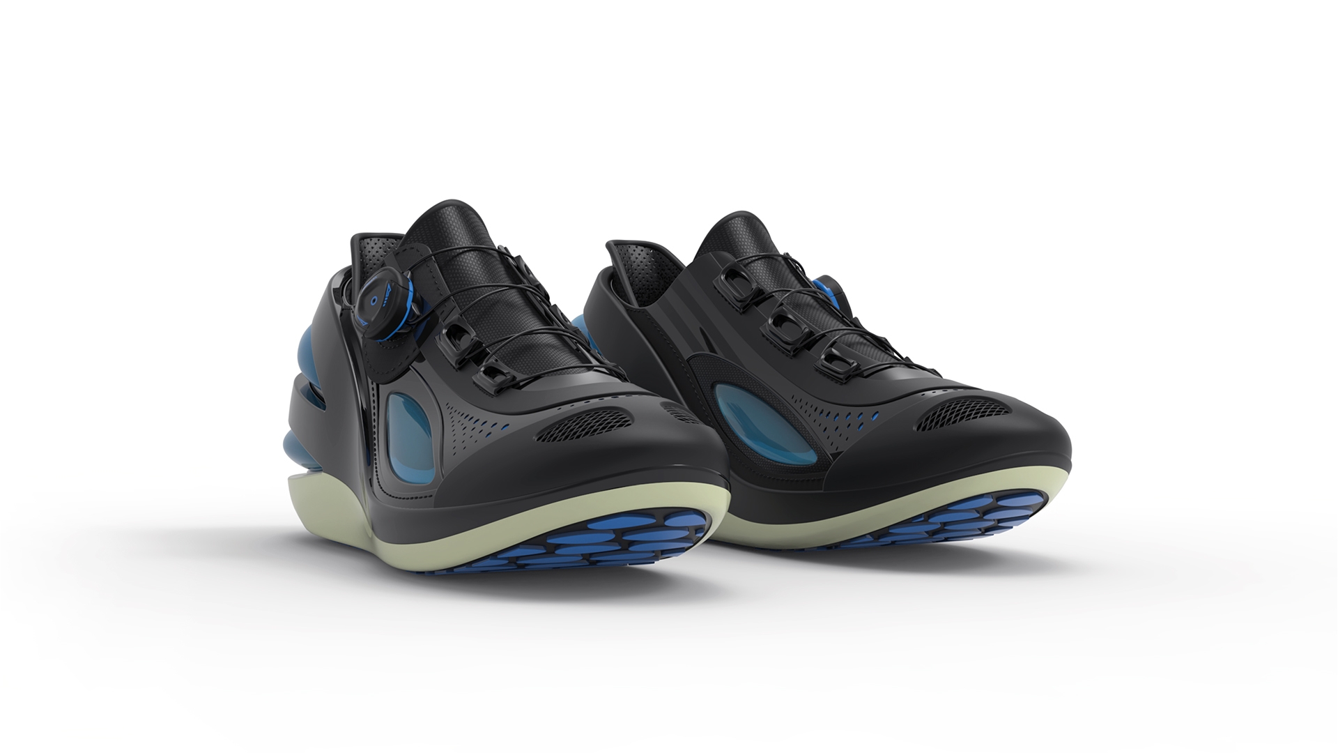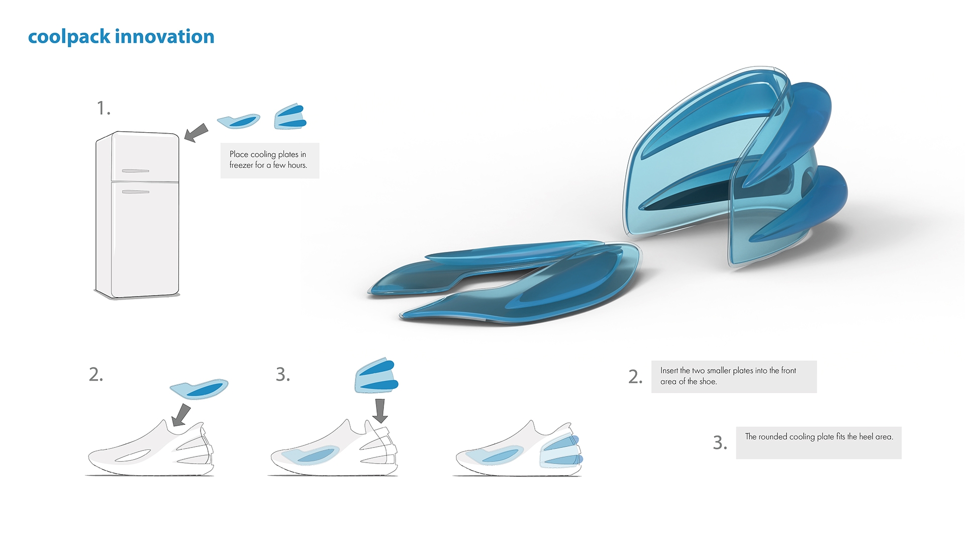 Innovation The shoe has insertable cooling plates that keep the feet pleasantly cool at a temperature of approximately 14°C and for a period of up to 4 hours. The plates are adapted to the shape of the foot. They are elastic, which does not impair performance. The “coolpacks” are chilled in the freezer and are removed from the freezer to be worn. The shoe can also be worn without the packs, in which case underlying mesh structures hidden by the packs while the packs are inserted, will keep the feet ventilated.