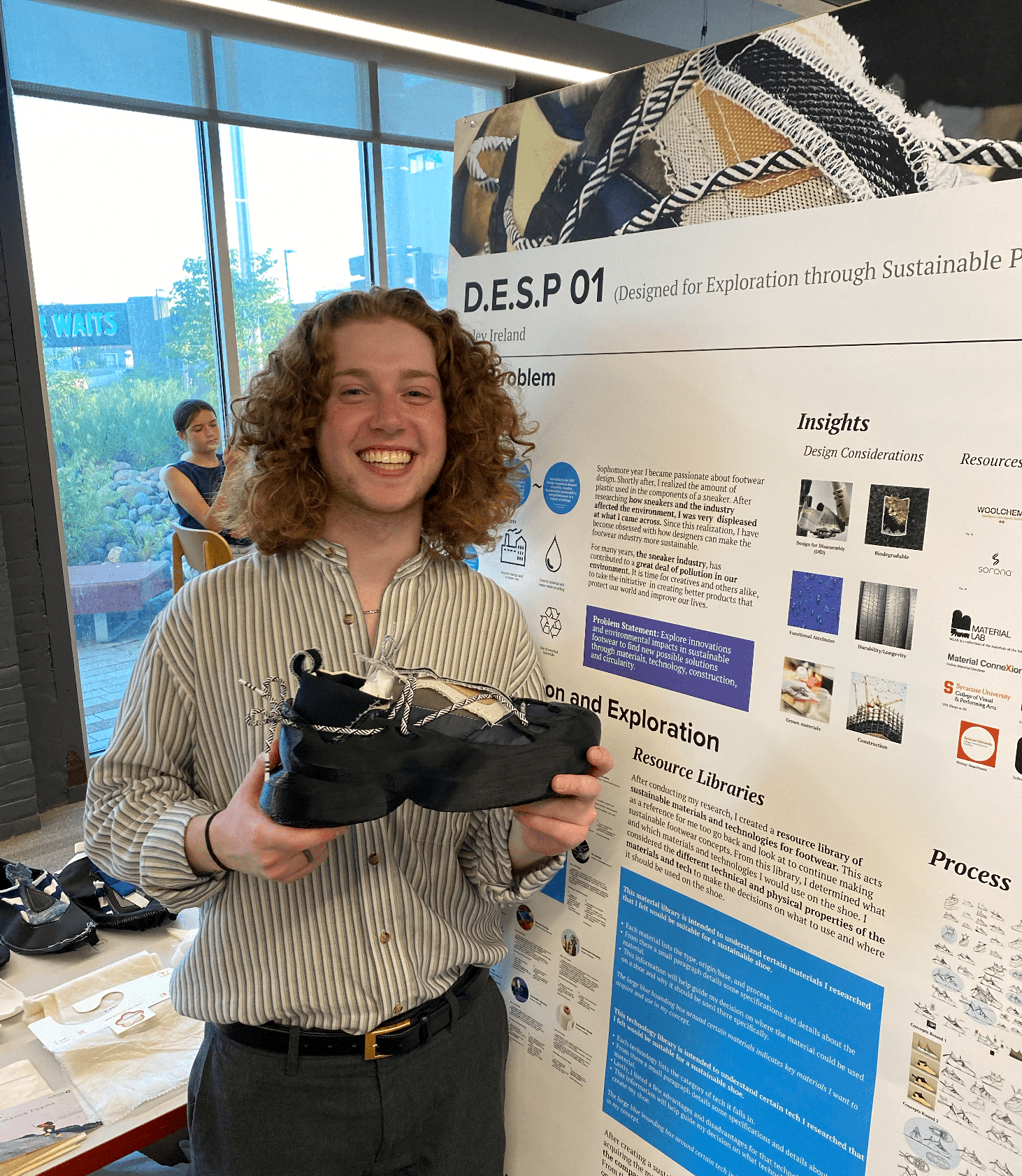 Description D.E.S.P 01 is a sustainable shoe concept designed for disassembly. Using no adhesives, this shoe is completely stitched together and can be take apart with three parts: the midsole, reclaimed shoelaces, and the upper. The midsole is flexible TPU, which can be melted down and re-used infinitely. The upper is made up of several different materials ranging from BANANATEX to SeaCell to Dimpora. All of these sustainable materials are sewn together, once you take apart each individual pattern, they can either be recycled, re-used, reclaimed, or compostable/biodegradable. One step at a time, D.E.S.P is a concept driven to save our planet and rethink the footwear industry for the better.