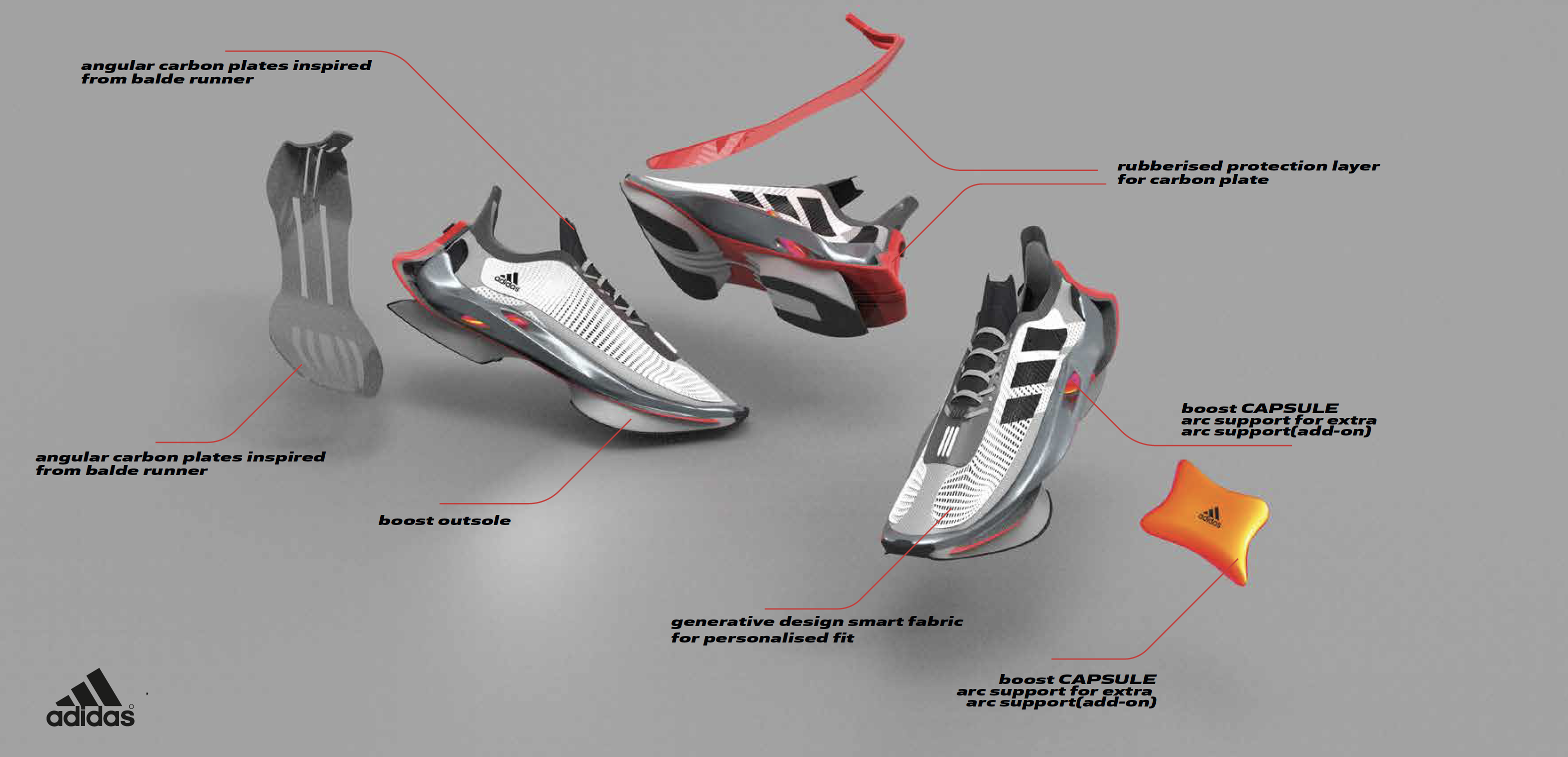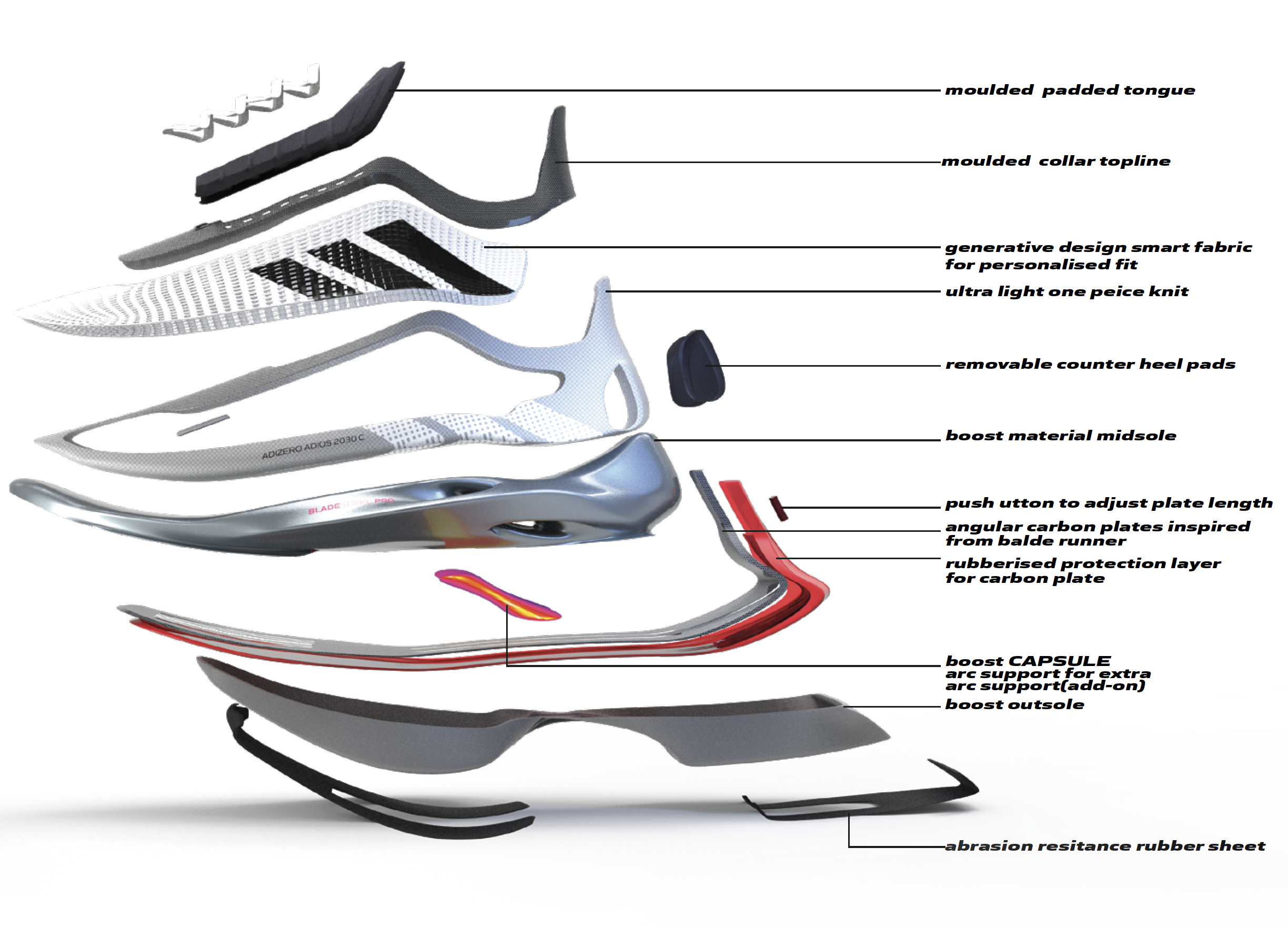 Description This concept has been reimagined as an update for the current Adidas Adios Pro2 series. It features an adjustable carbon fibre plate inspired from Paralympics runner blades which the user can adjust for core running or for a simple warmup just before running. It houses an advance inflatable boost capsule system on the foot arc area which can be set to different arch support needed by different users based on their requirement and their running patterns.This arc system will benefit many flatfoot runners as well to accomplish their daily run.