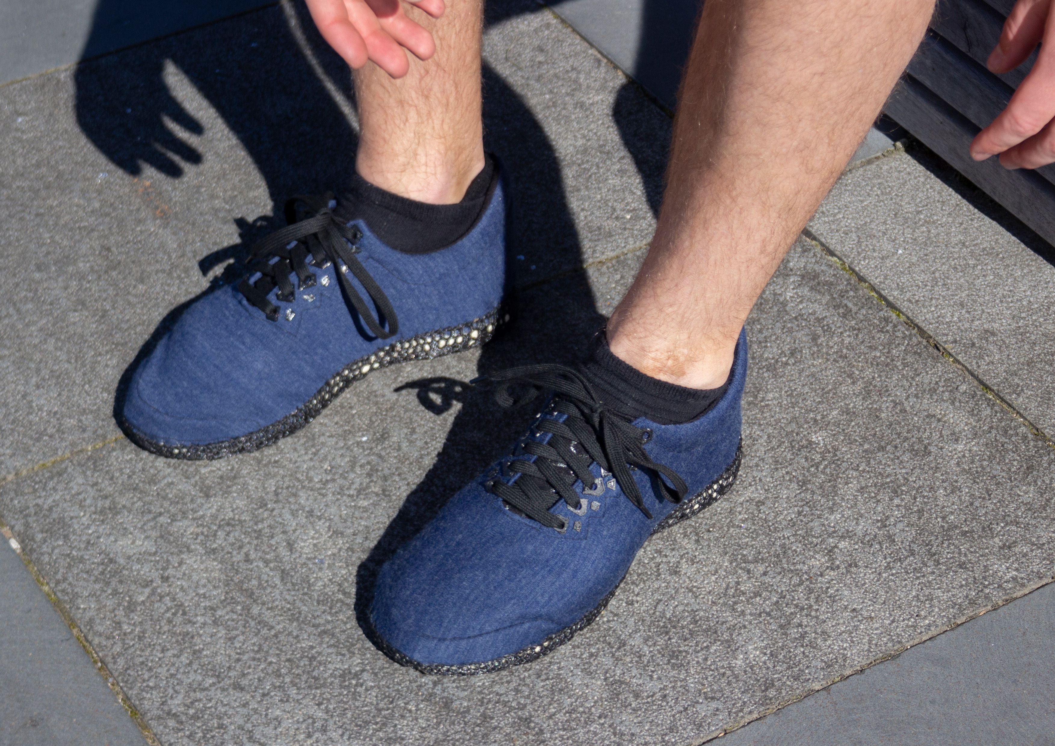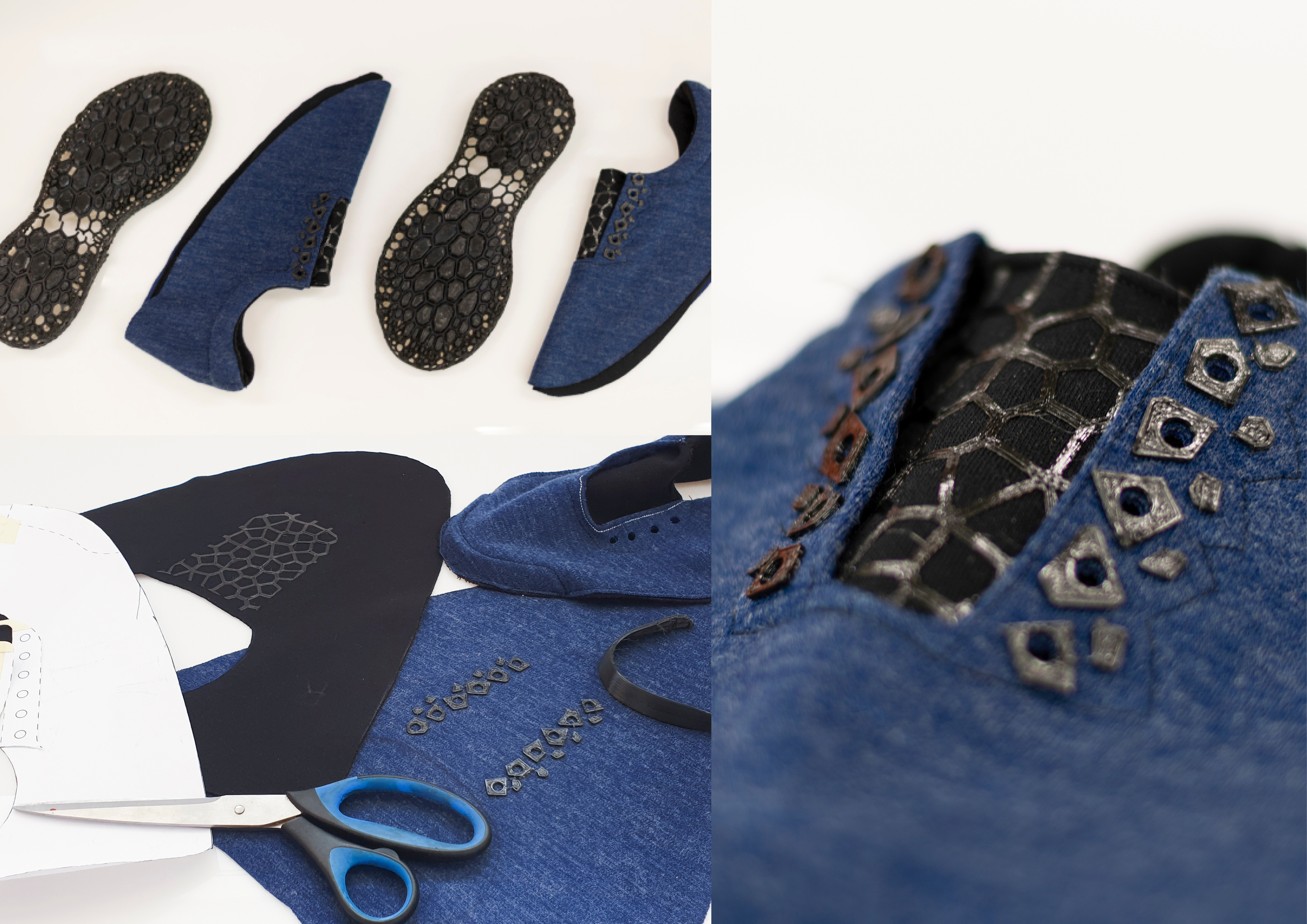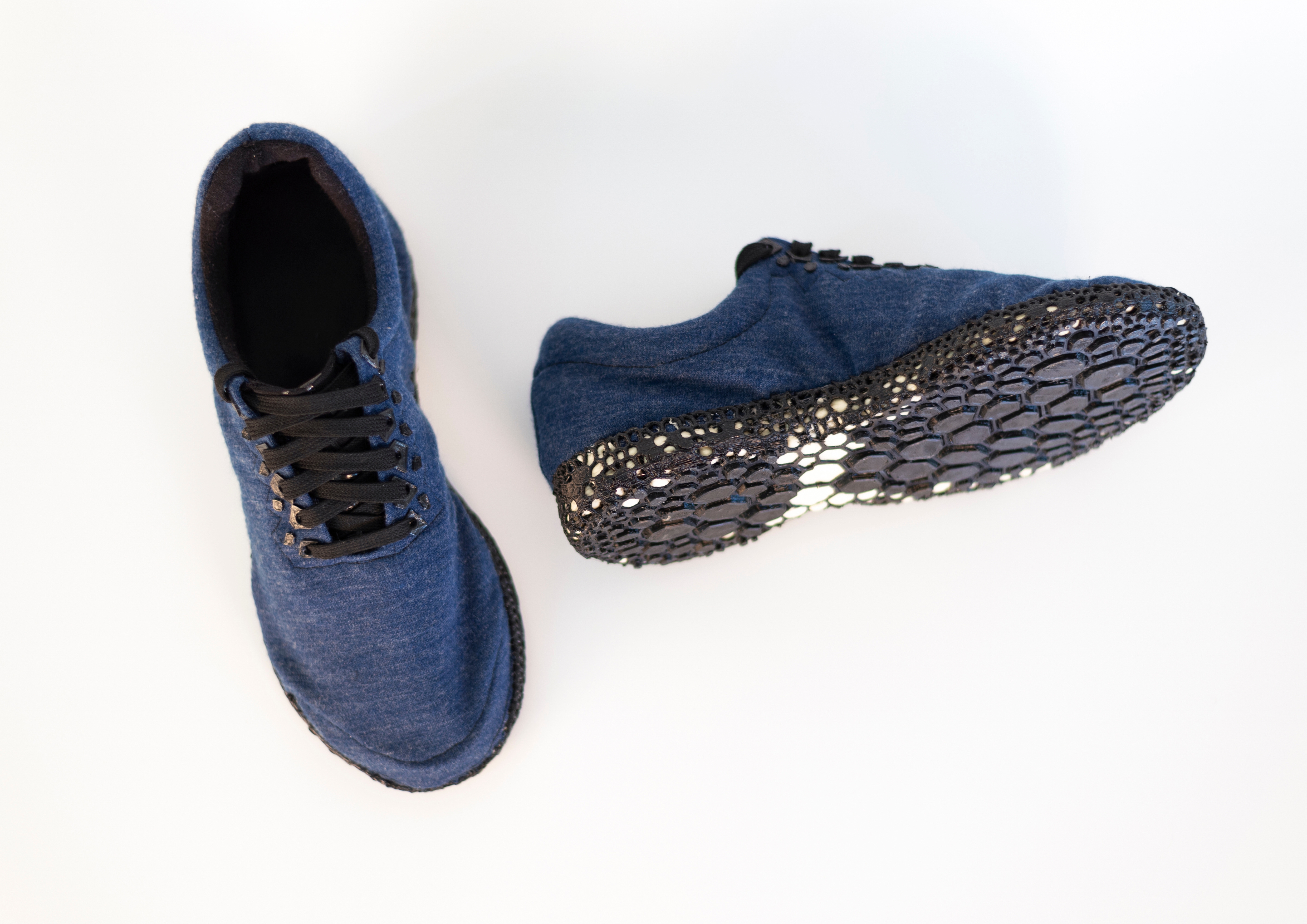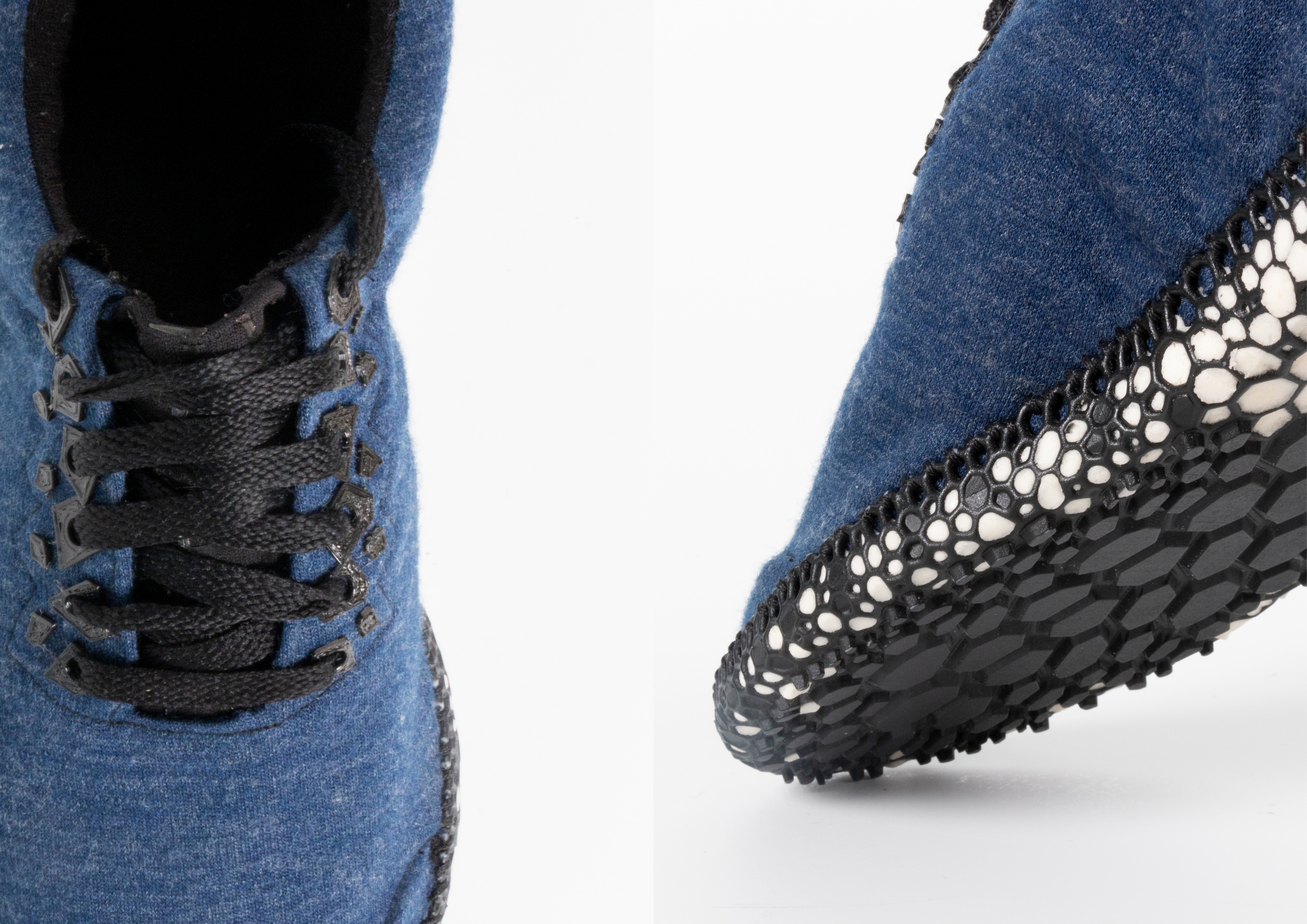 The merino wool upper is sewn from 2 pieces, the underlayer is fully covered giving a sock-like fit with a 3D printed Voronoi detail on the tongue reducing stretching overtime. Lacing eyelets are also printed onto the outer layer of fabric. 3D printed heel and toe caps are inserted between the merino layers and sewn shut with plant fiber reinforcement to add strength and structure. The upper is then stitched onto the sole of the shoe using a linen twine following along the edge of the Voronoi midsole pattern.