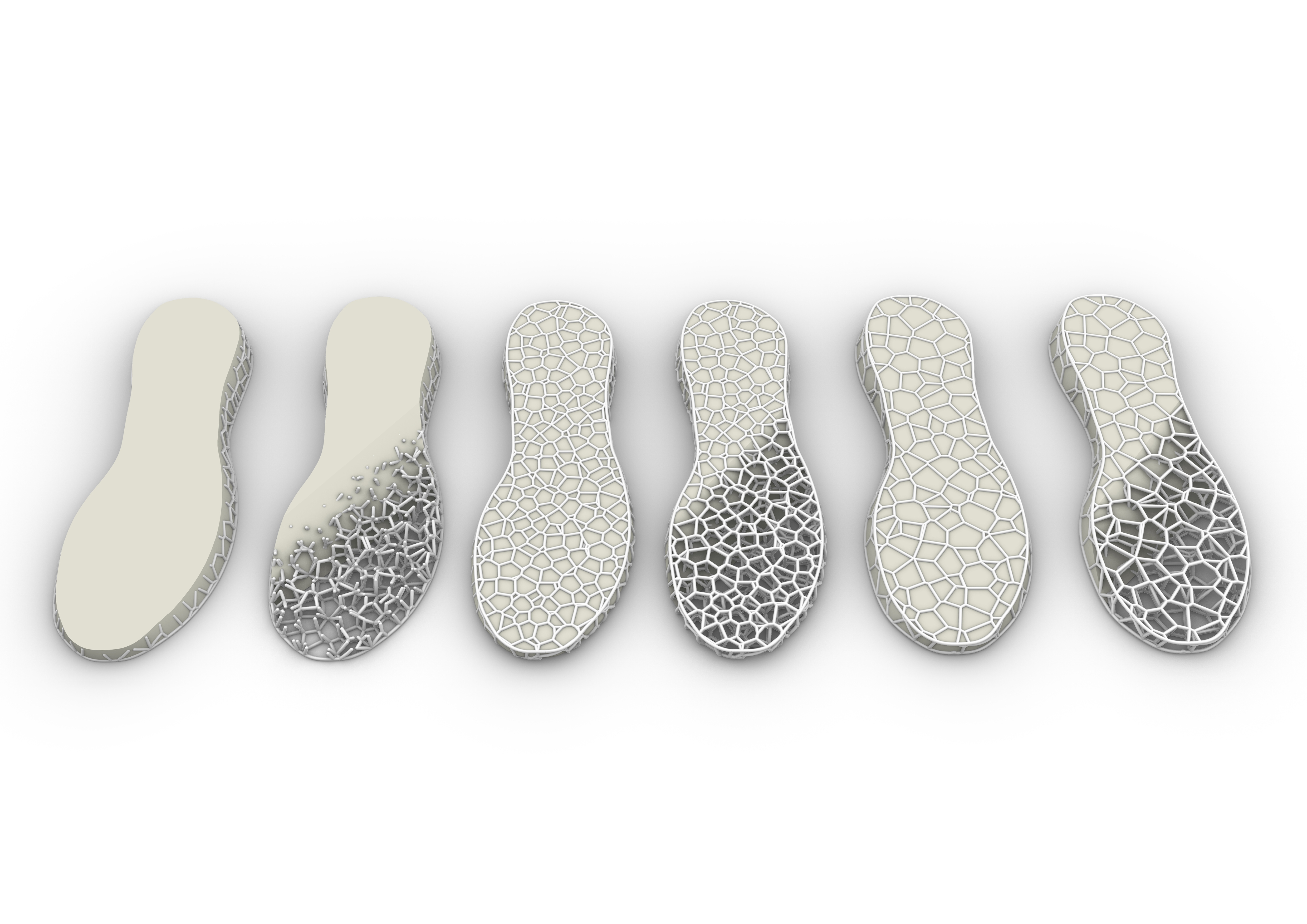 Scanning and 3D printing technologies are used to tailor the shoe to the compression and force distribution needs of each foot. By obtaining a scan of the individual foot the Voronoi structure is made to attract cells to the areas in need of most support and repel for areas in need of flexibility.