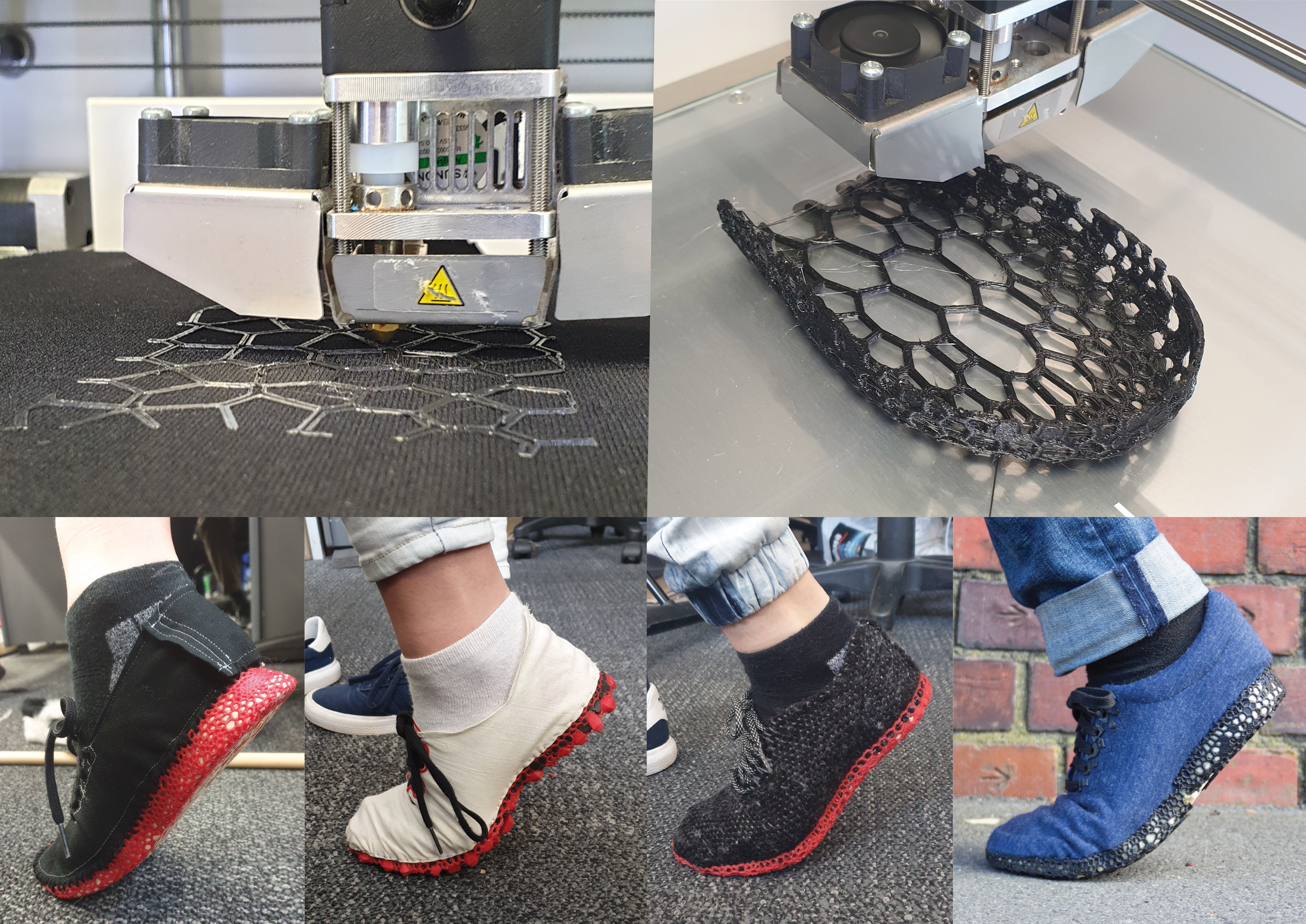 This printed sole structure also provides the ability of attaching the upper without glues and chemicals. Using traditional stitching methods to follow along the edge of the midsole using the incorperated empty cells.