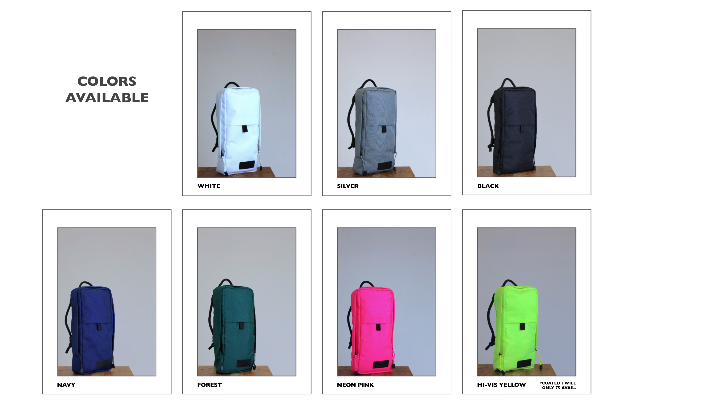 I'm making it available in a range of colors that will continue to grow as suitable materials become available. I started the line with classic Nylon colors such as Black, White, Forest, Navy, Silver, Neon Pink, and Hi-Vis Yellow. At the moment exploring more Hi-Vis and Reflective colors as safety sku's.