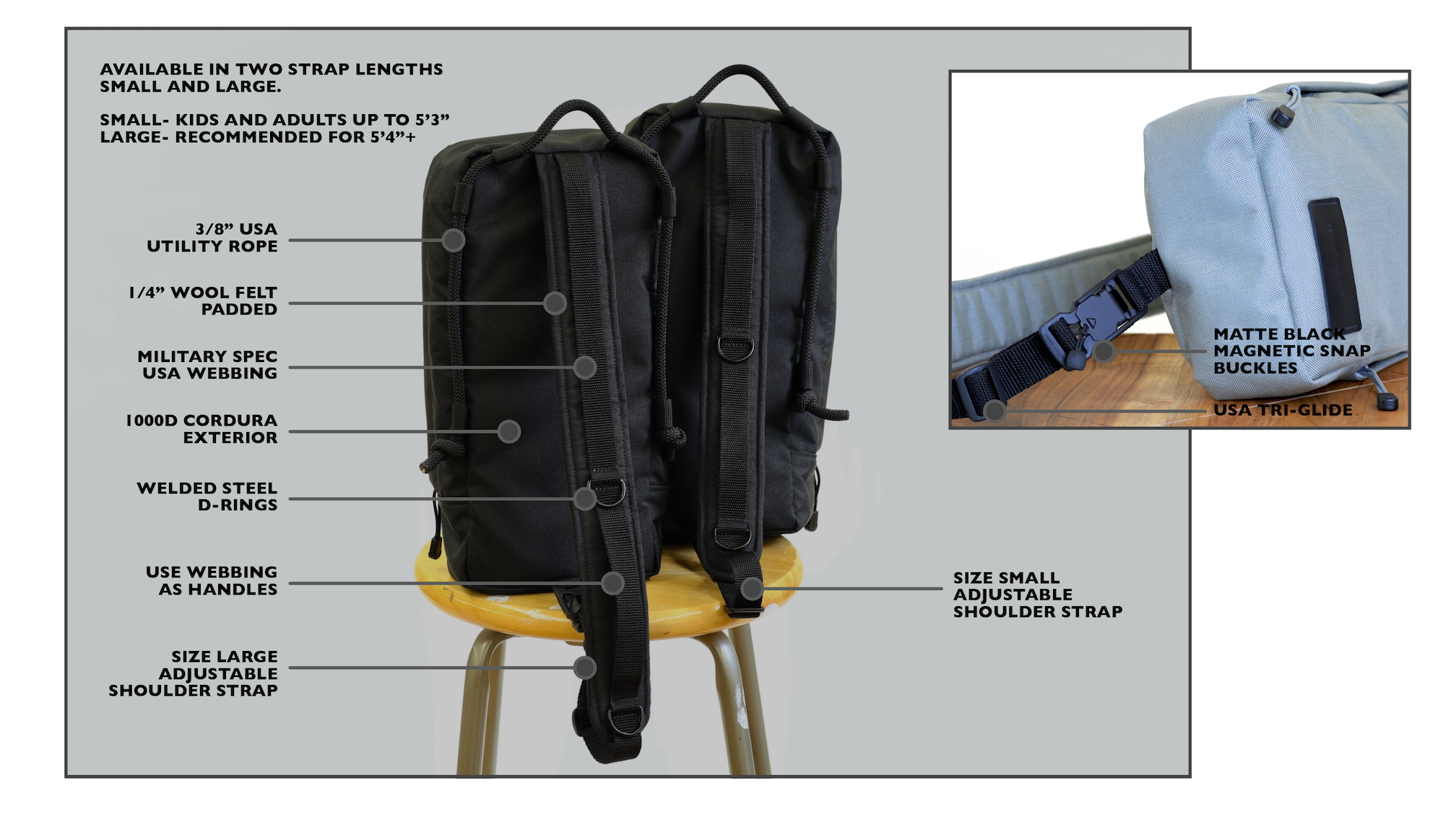 The shoulder strap is padded with a long lasting natural 1/4" industrial wool felt and adorned with two welded steel D-rings.