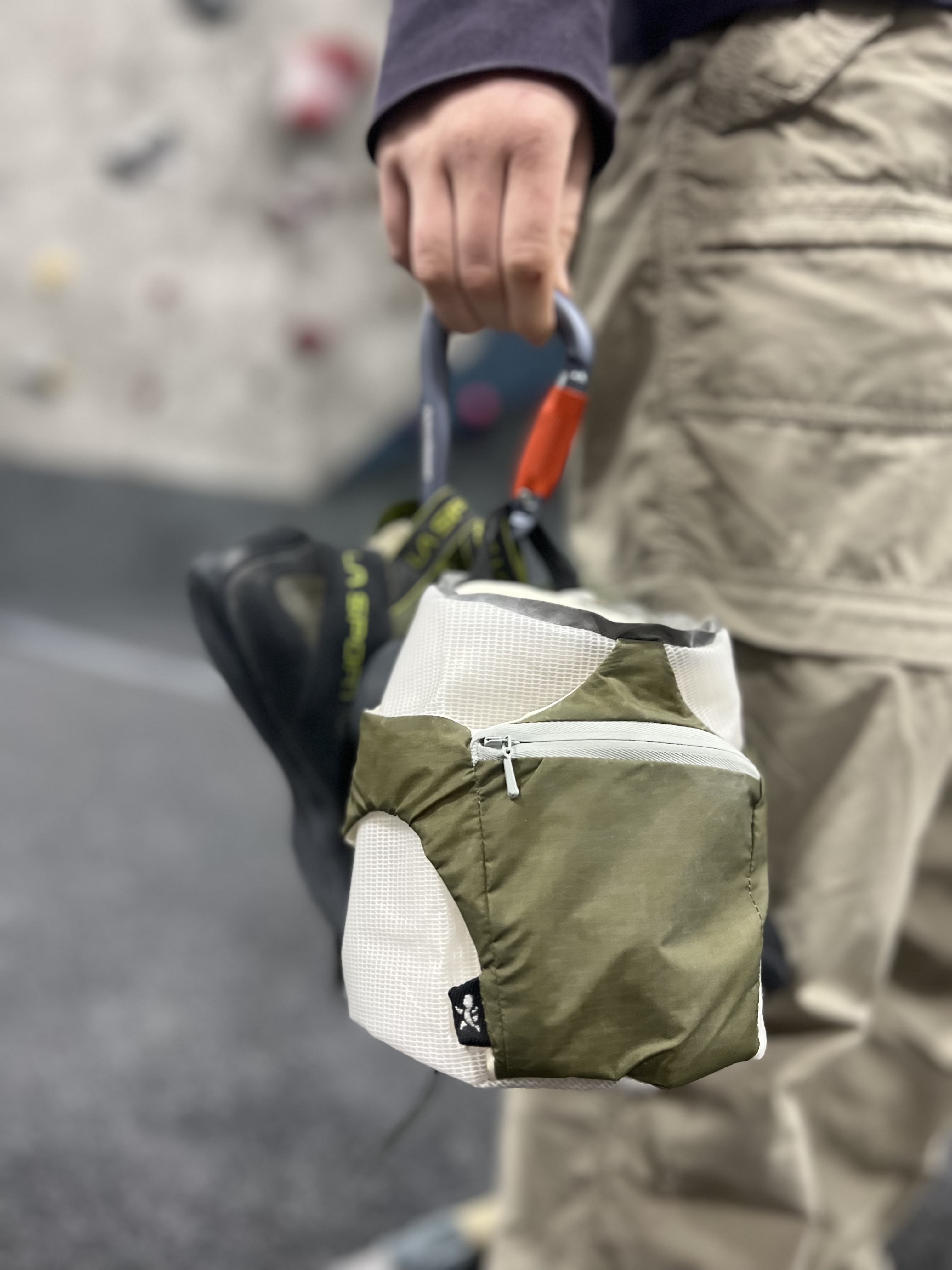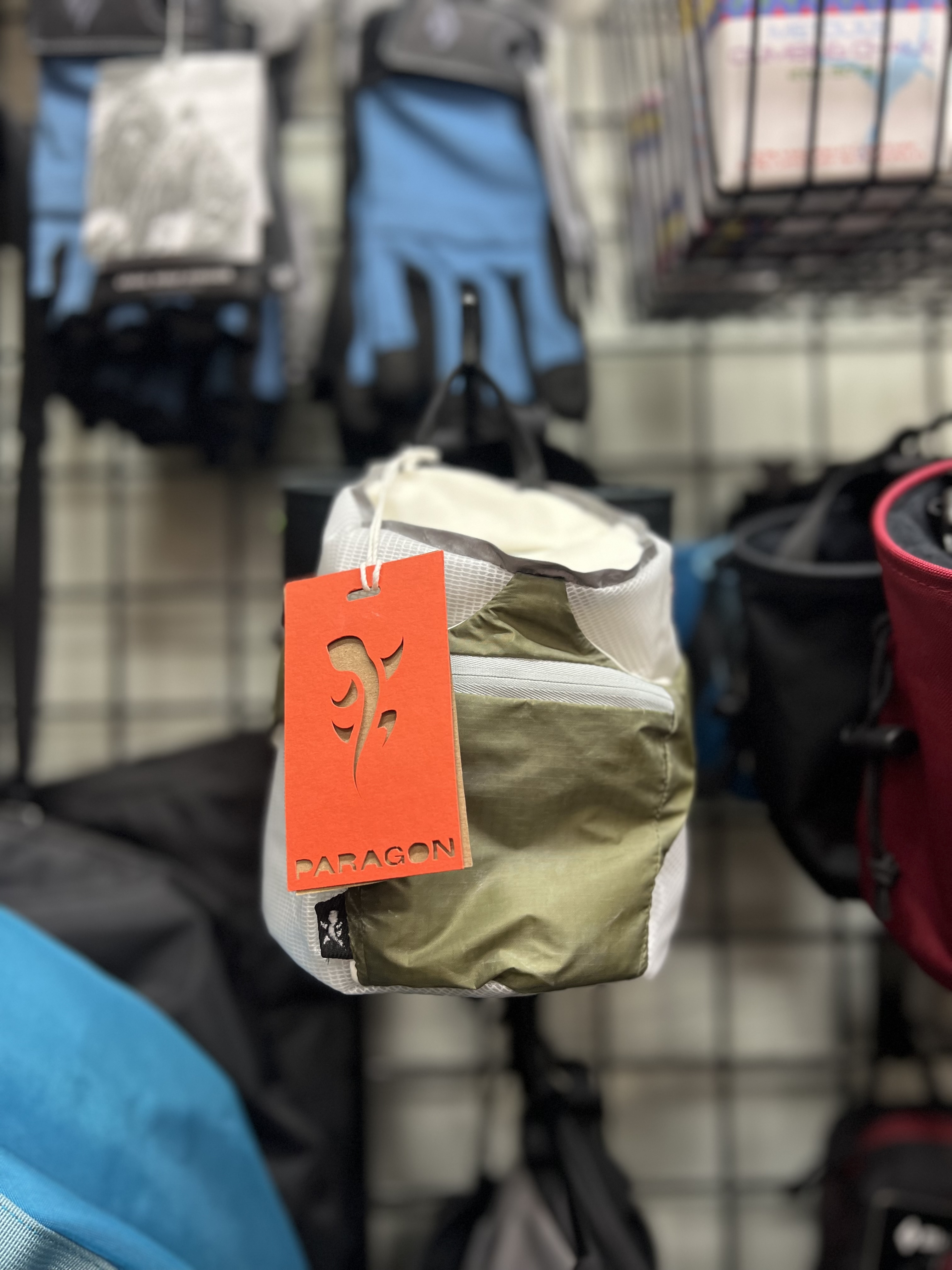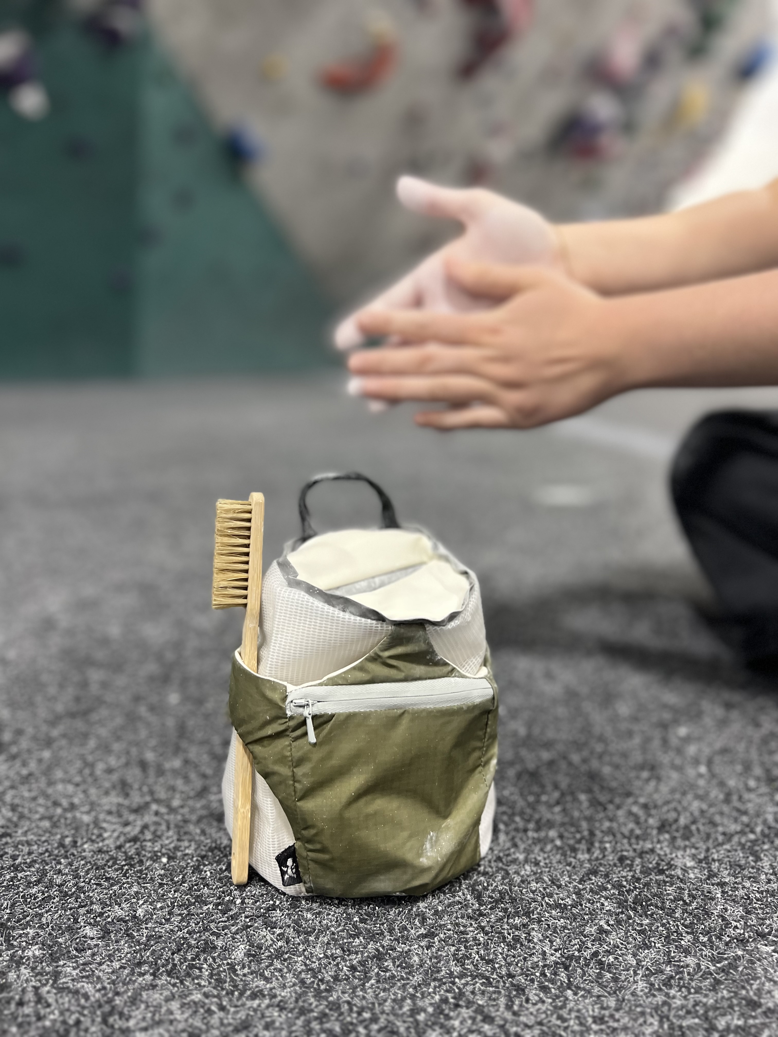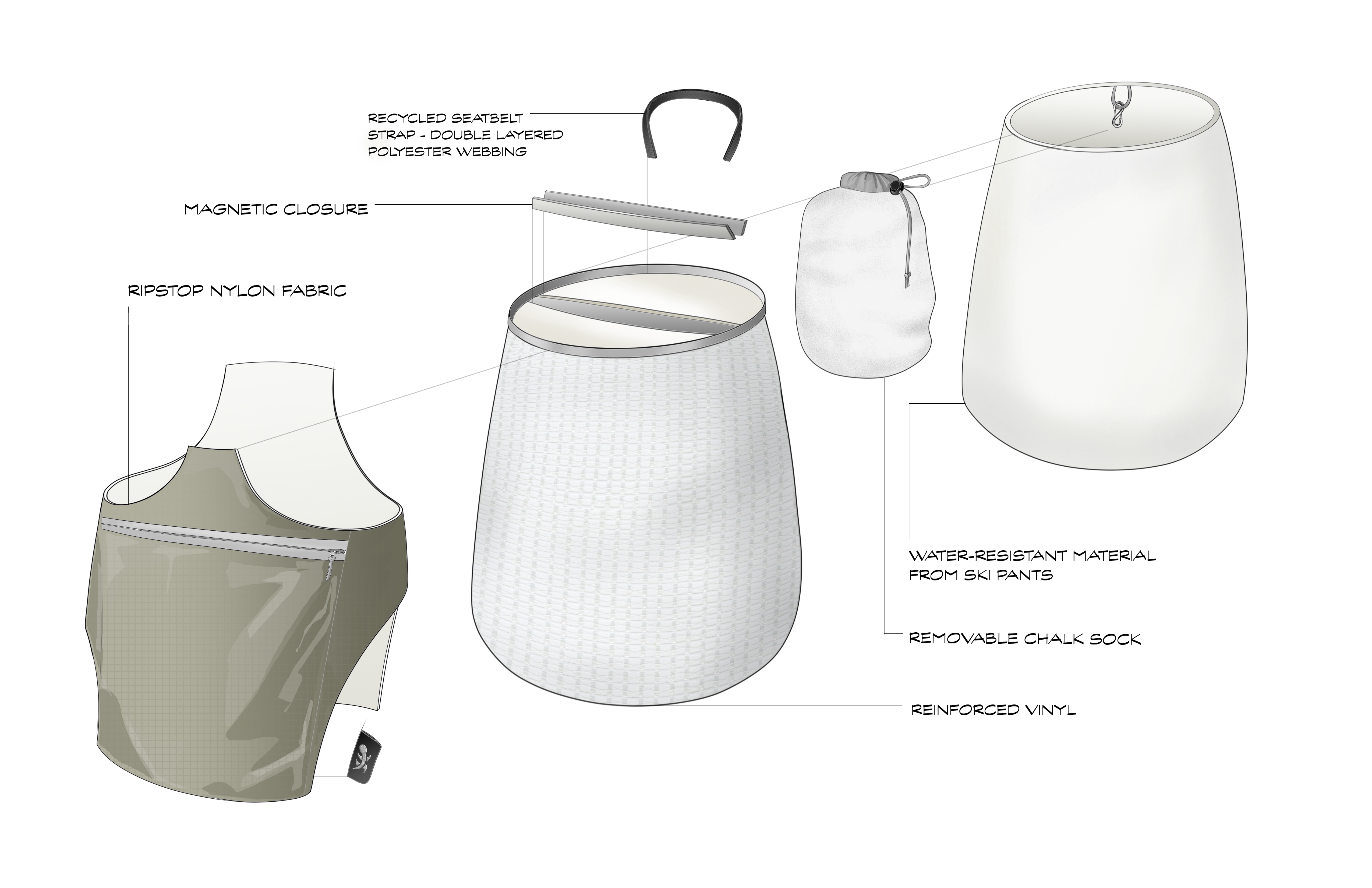 Innovation The Tarsus Chalk Bag was designed with the intention of minimizing chalk spillage and making the chalking process more efficient by using magnetic closures. This makes it so that the user can open the bag in less time than a typical drawstring method without having to manually close the bag, since the magnets naturally close together. This chalk bag takes other features such as a phone pocket and multiple brush loops that are often found on chalk buckets, and applies them to a regular chalk bag. Waterproof materials were selected so that the surface can be wiped clean and even withstand wet conditions both on the interior and exterior of the bag.