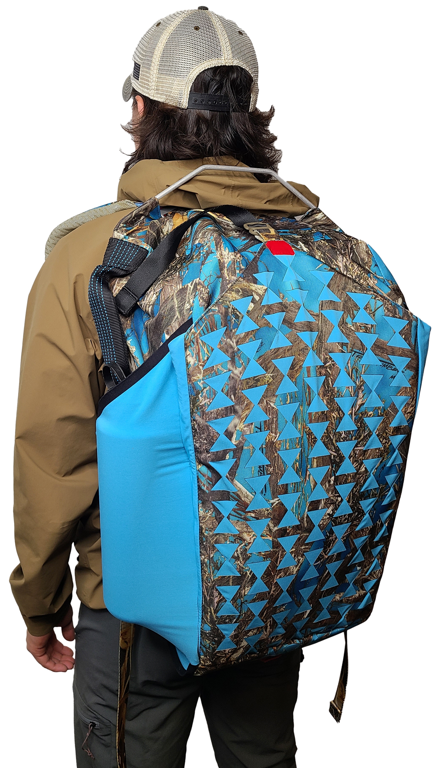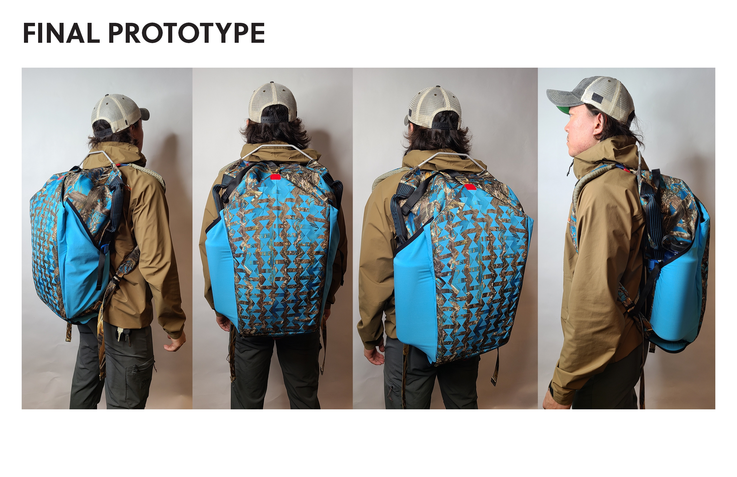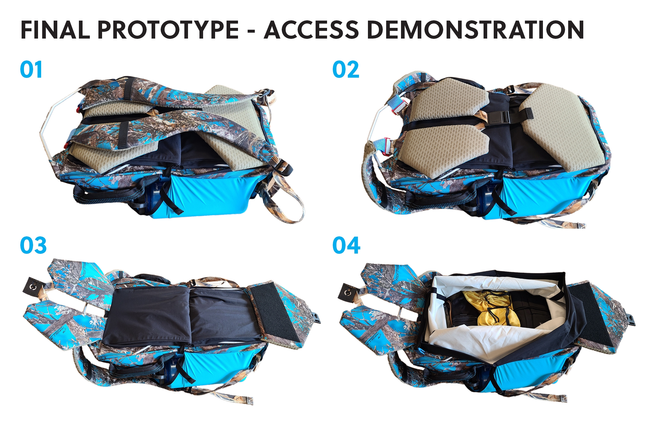 Innovation This bag was designed to have an innovative folding waterproof rear-access opening so the user can place the bag down in muddy/wet/dirty conditions and have full view of their equipment, unlike traditional waterproof bags that use top access or single zip designs. To accomplish this, a new z-shape roll closure technique was designed and explored. Additionally, a unique and custom semi-internal frame was designed and implemented to allow for maximum access without sacrificing support. To protect equipment, the back quick stash compartment was constructed of a foam that was cut with an auxetic pattern to improve stretch and gear accommodation while protecting the main interior from the ground when put down. The backpack straps were made completely removable for stowage during travel and for future upgrades or maintenance. Strap attachment in unorthodox positions was explored, most notably with the bottom of the straps terminating in the bottom of the bag, making it easier to take the bag off due to the lower strap termination. Roll closure straps act as side compression straps as well. A top strap allows for overloading the bag. Side stretch pockets and handles complete the design.