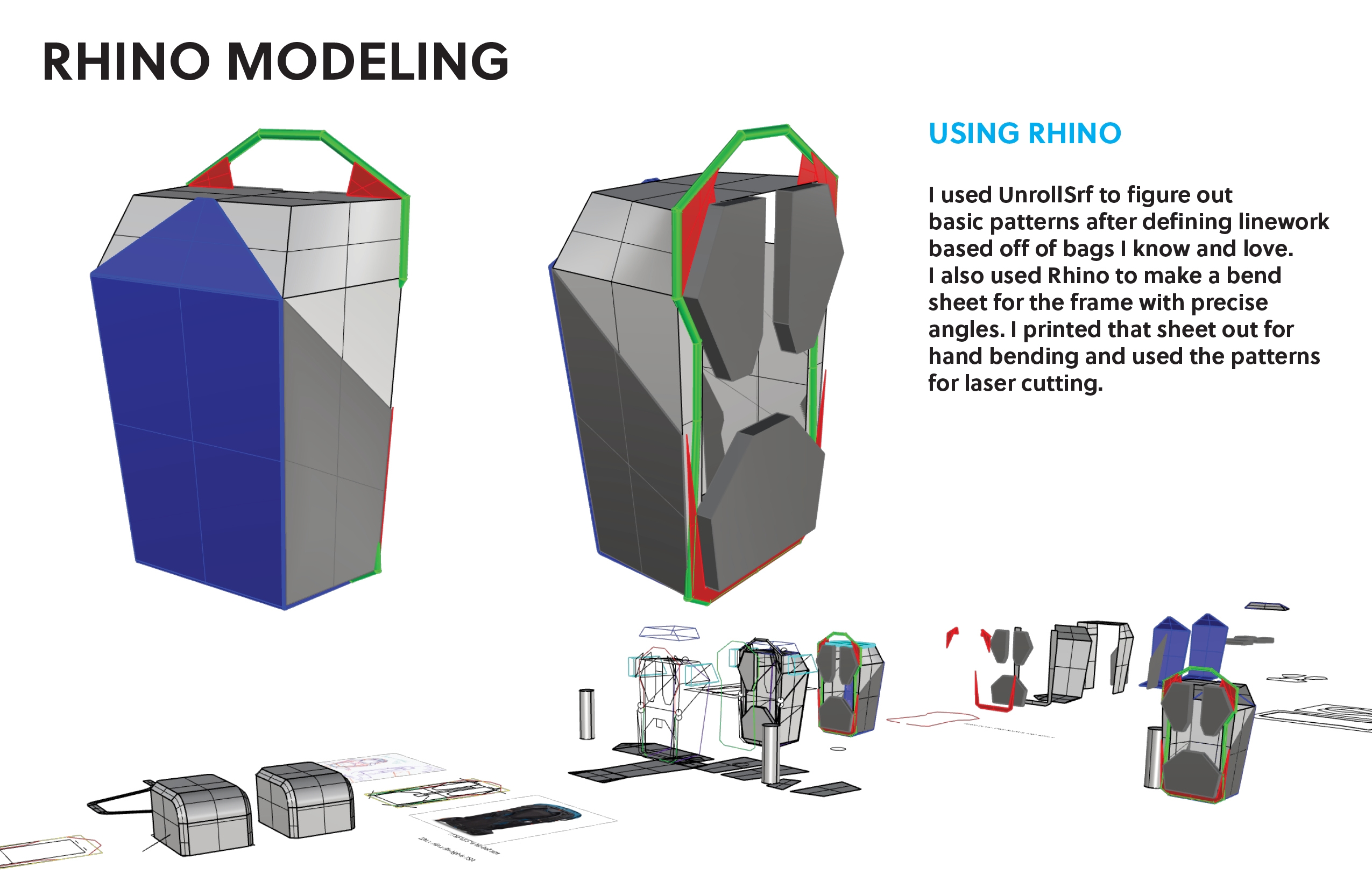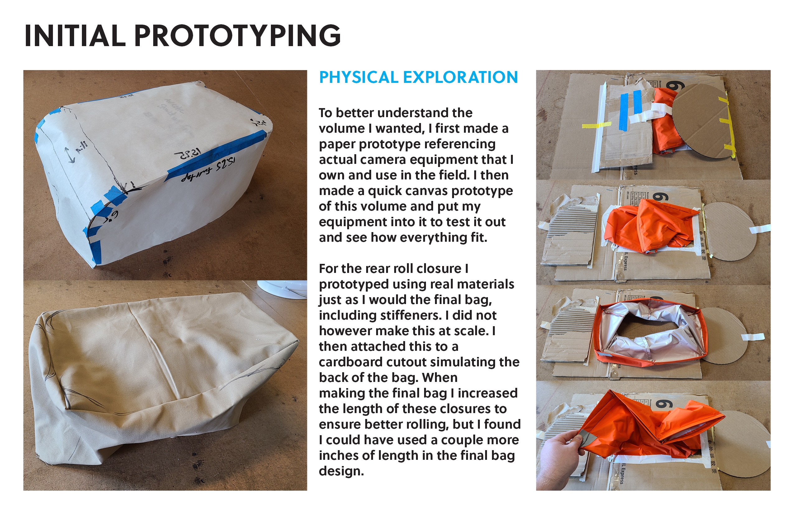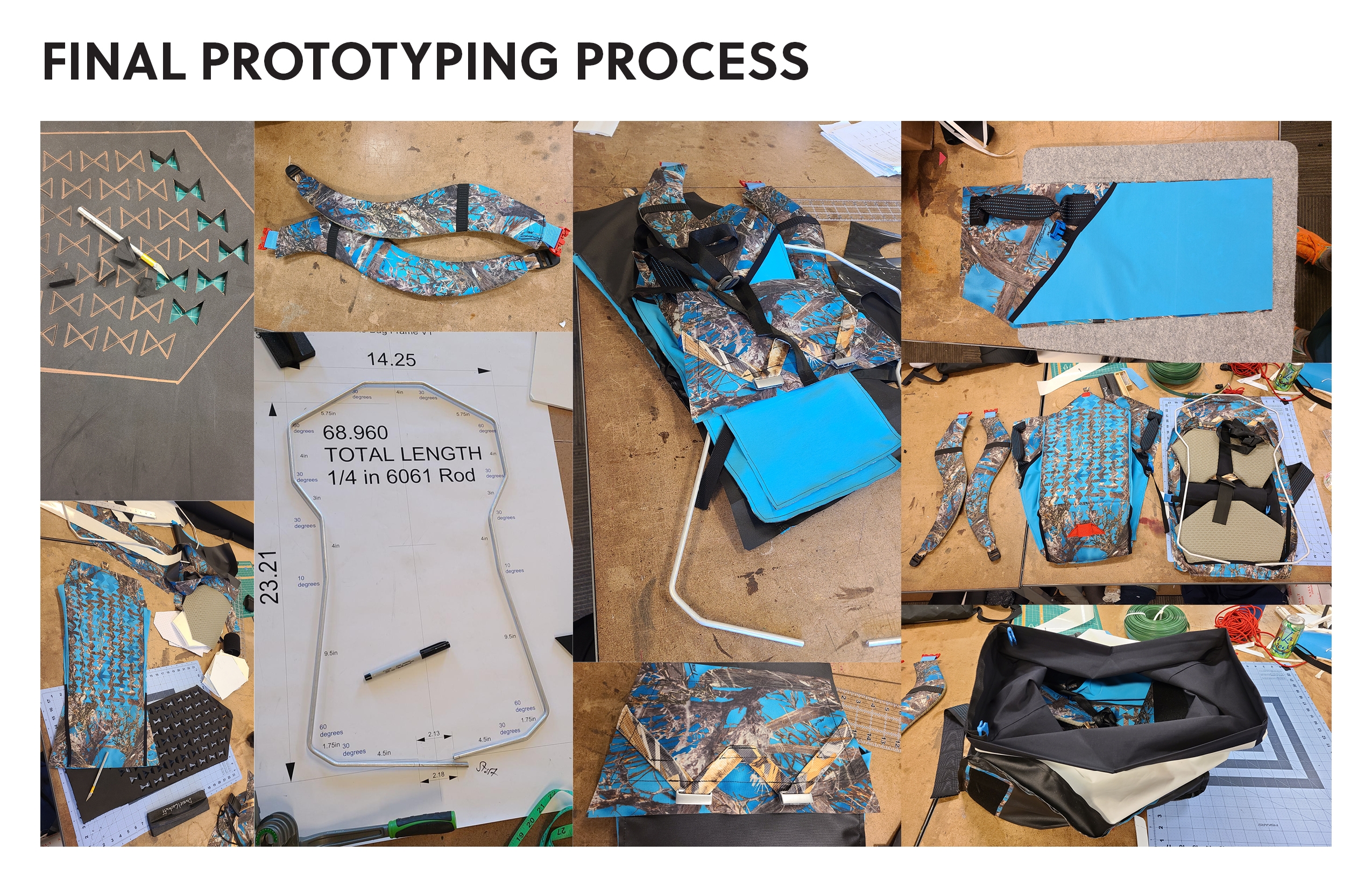 Innovation This bag was designed to have an innovative folding waterproof rear-access opening so the user can place the bag down in muddy/wet/dirty conditions and have full view of their equipment, unlike traditional waterproof bags that use top access or single zip designs. To accomplish this, a new z-shape roll closure technique was designed and explored. Additionally, a unique and custom semi-internal frame was designed and implemented to allow for maximum access without sacrificing support. To protect equipment, the back quick stash compartment was constructed of a foam that was cut with an auxetic pattern to improve stretch and gear accommodation while protecting the main interior from the ground when put down. The backpack straps were made completely removable for stowage during travel and for future upgrades or maintenance. Strap attachment in unorthodox positions was explored, most notably with the bottom of the straps terminating in the bottom of the bag, making it easier to take the bag off due to the lower strap termination. Roll closure straps act as side compression straps as well. A top strap allows for overloading the bag. Side stretch pockets and handles complete the design.