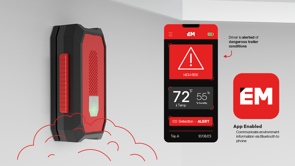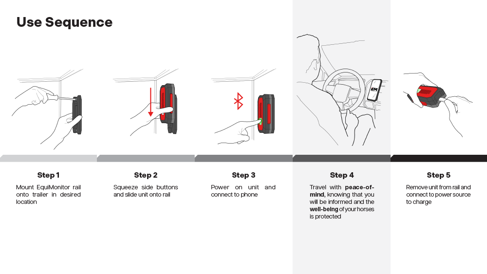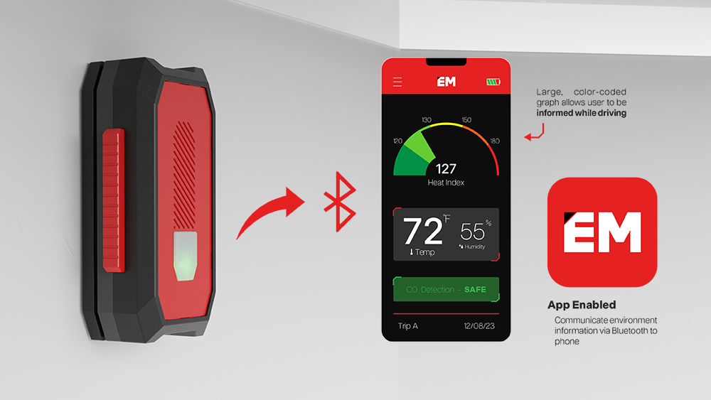 Description EquiMonitor is designed to increase equine health and user peace-of-mind during the trailering process for high-level rodeo contestants. The design fills a gap in the equine-care market; no horse-trailer-specific environment monitors were found in investigation. The rechargeable detection unit is mounted on a rail that is screwed to the horse-trailer structure. Via Bluetooth, information including temperature, humidity, and carbon monoxide levels is transmitted to an app on the user's phone, allowing the user to monitor the trailer environment and be alerted when the conditions are unsafe.