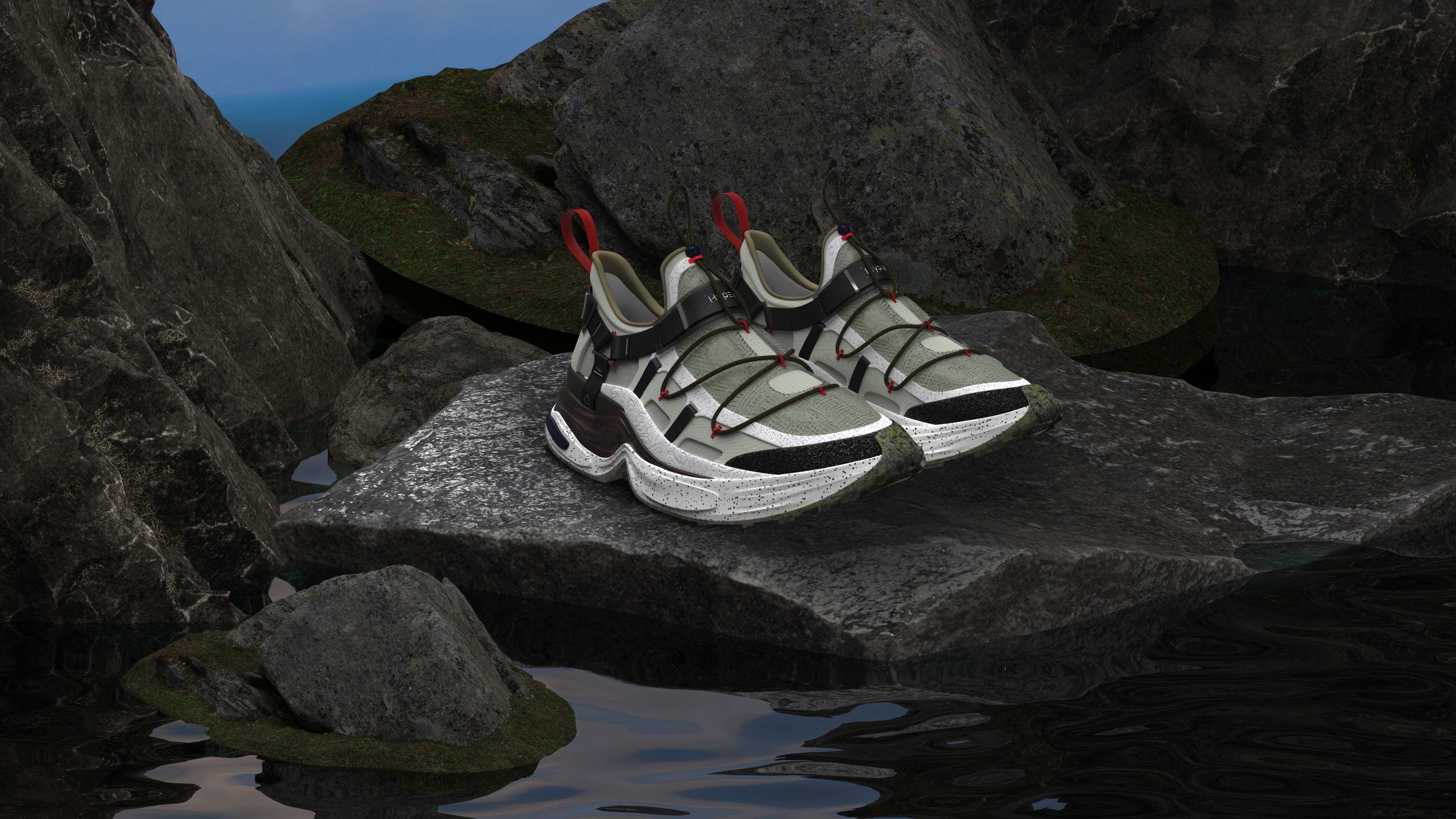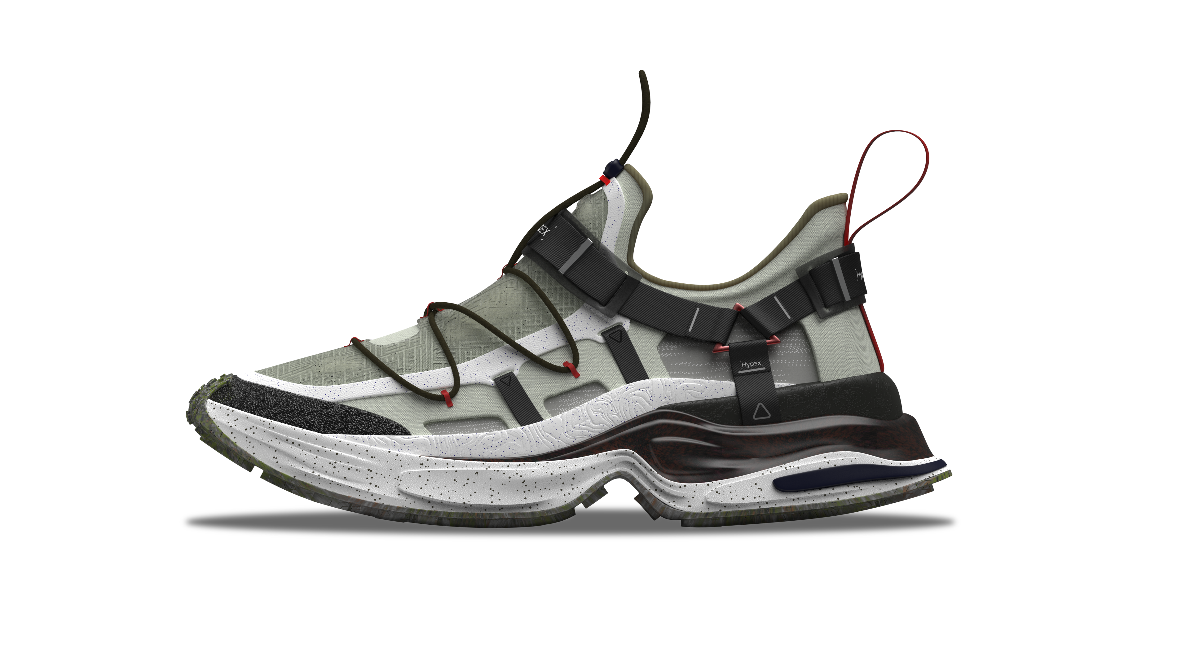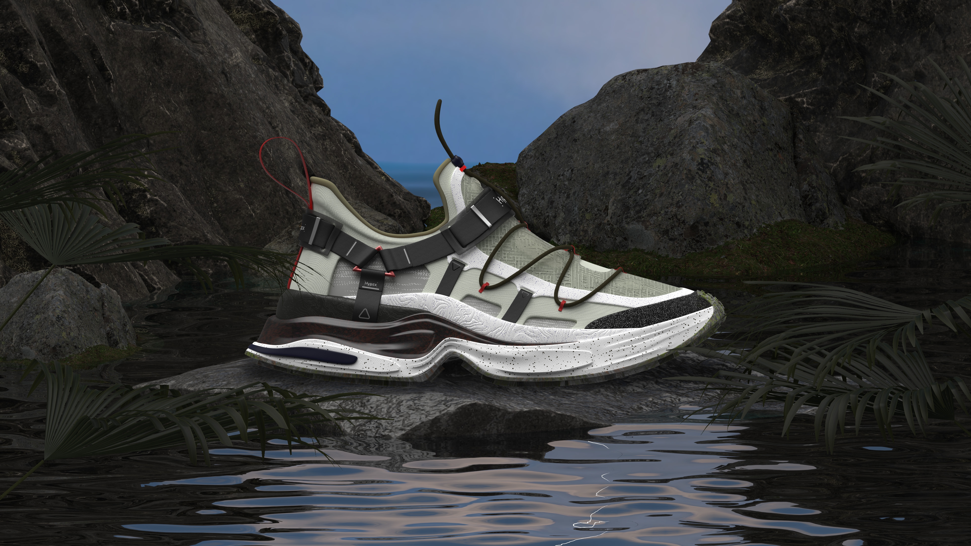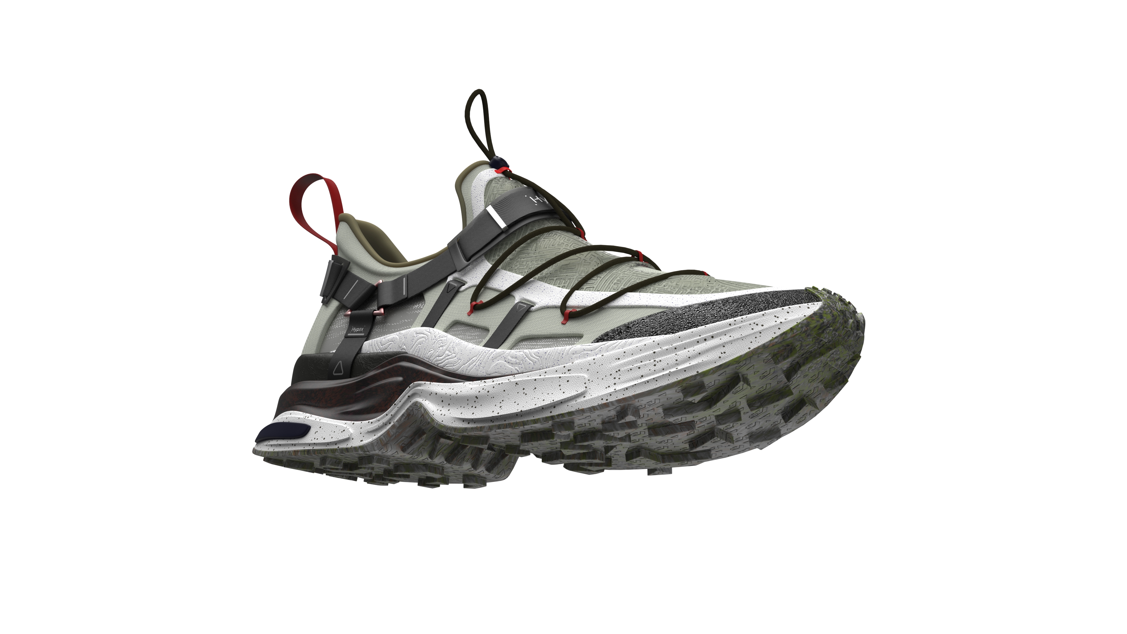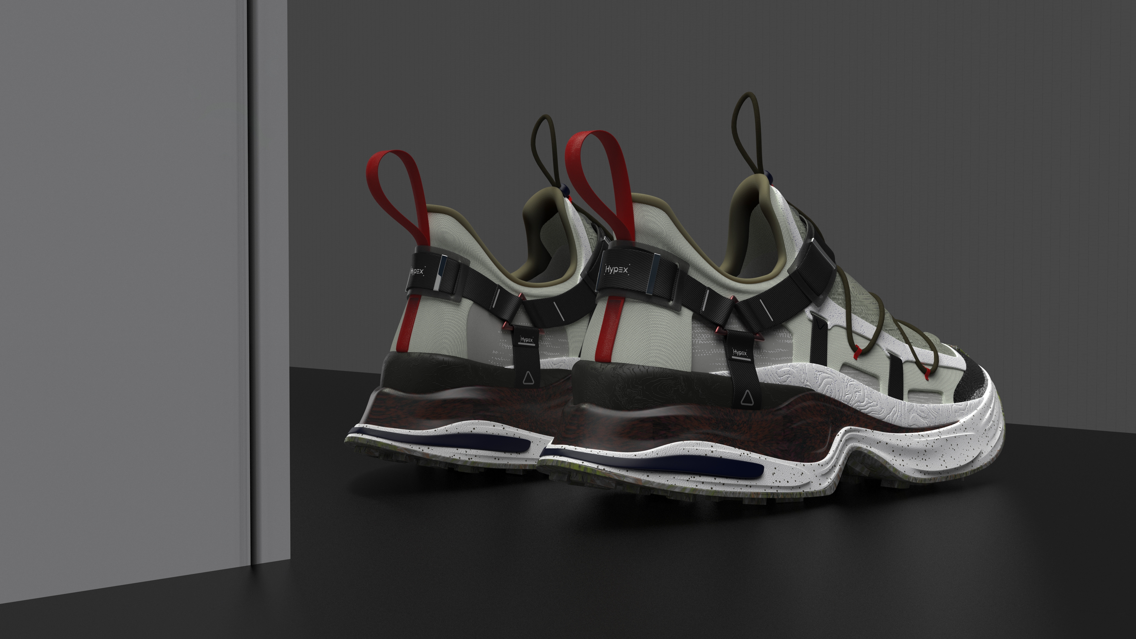 Description HYPEX is a creek shoe design that seamlessly blends outdoor functionality with hypebeast style. What sets HYPEX apart is its innovative incorporation of safety belt-inspired elements for secure foot lockdown, ensuring maximum stability even in challenging terrains. If the user want to loose the shoe, pull the metal pieces outward, with less elastic bands overlay, the flexibility goes higher; if the user want to tight the shoe, push the metal pieces inward, with more elastic bands overlay, the flexibility goes lower. Additionally, the visual language of gorpcore style enhances comfort and support, setting a new standard for urban river tracing enthusiasts. Crafted with speed-dry materials, a comfortable fitting, superior grip, and a sleek aesthetic, HYPEX stands out as the epitome of performance and style in outdoor footwear. Integrate with speed dry materials, ergonomics, and outdoor footwear trends underpinned the technical foundation of this project, ensuring HYPEX offers unparalleled performance and aesthetics.