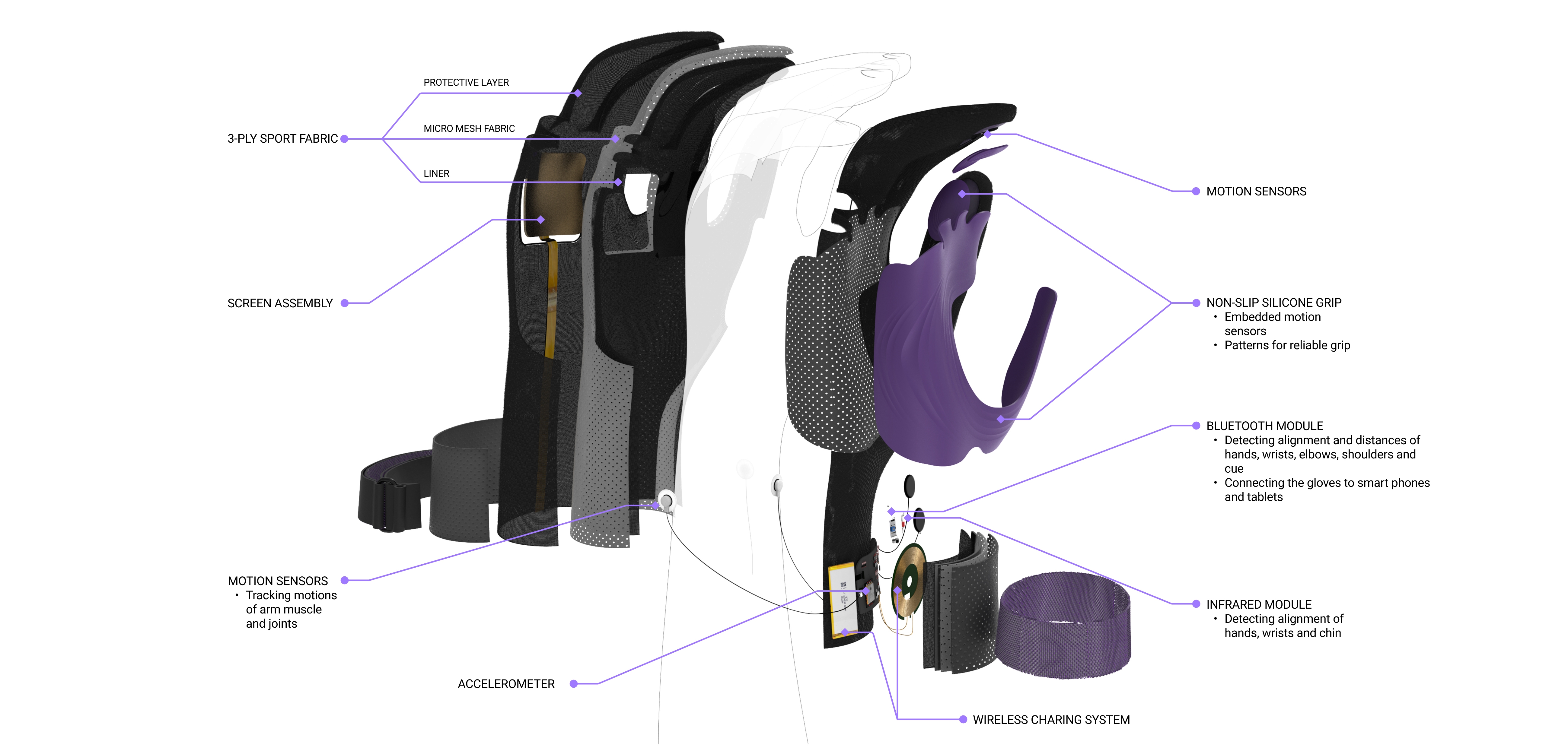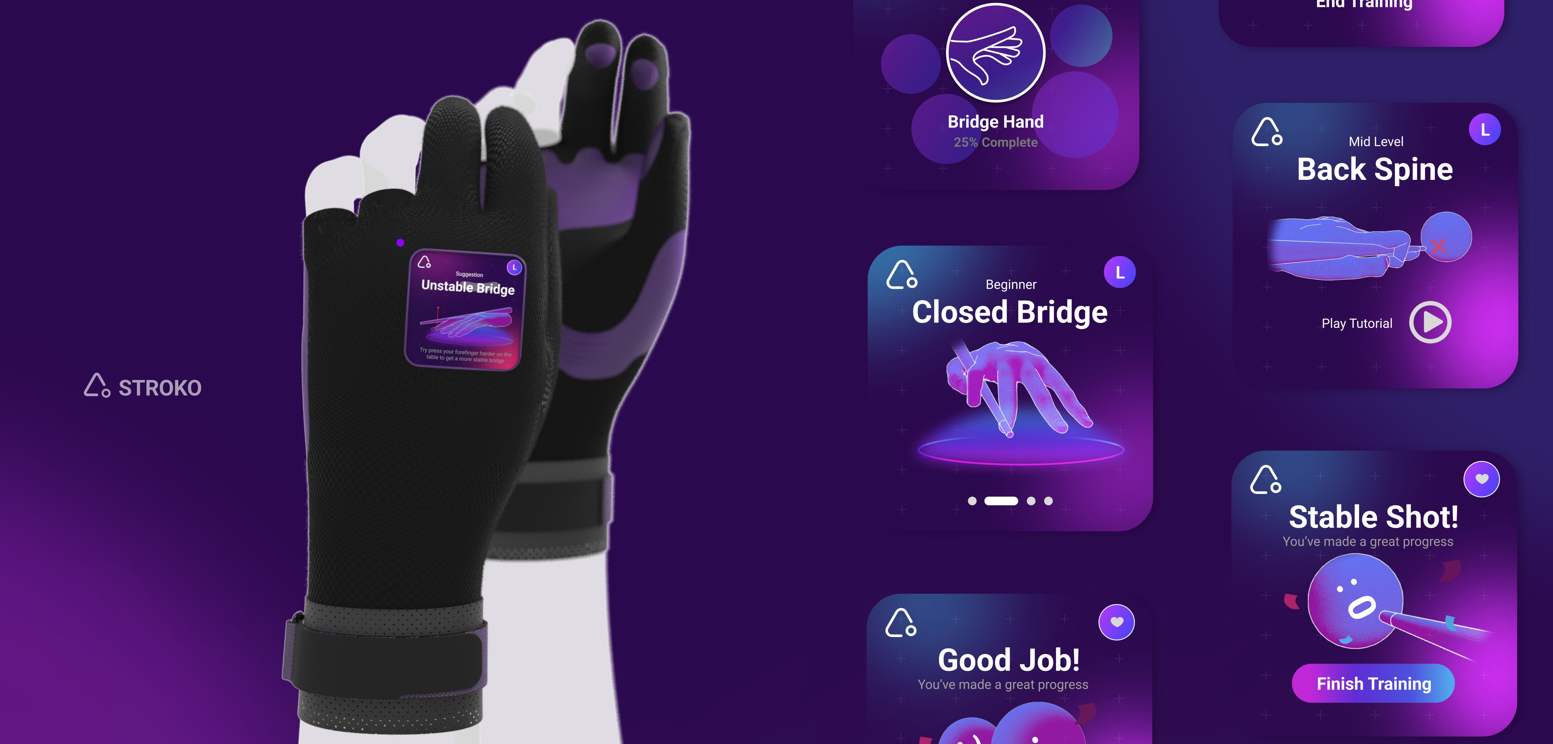 Innovation Stroko is a pair of smart gloves designed for billiard enthusiasts, offering a fresh approach to skill development and posture correction through gamification.