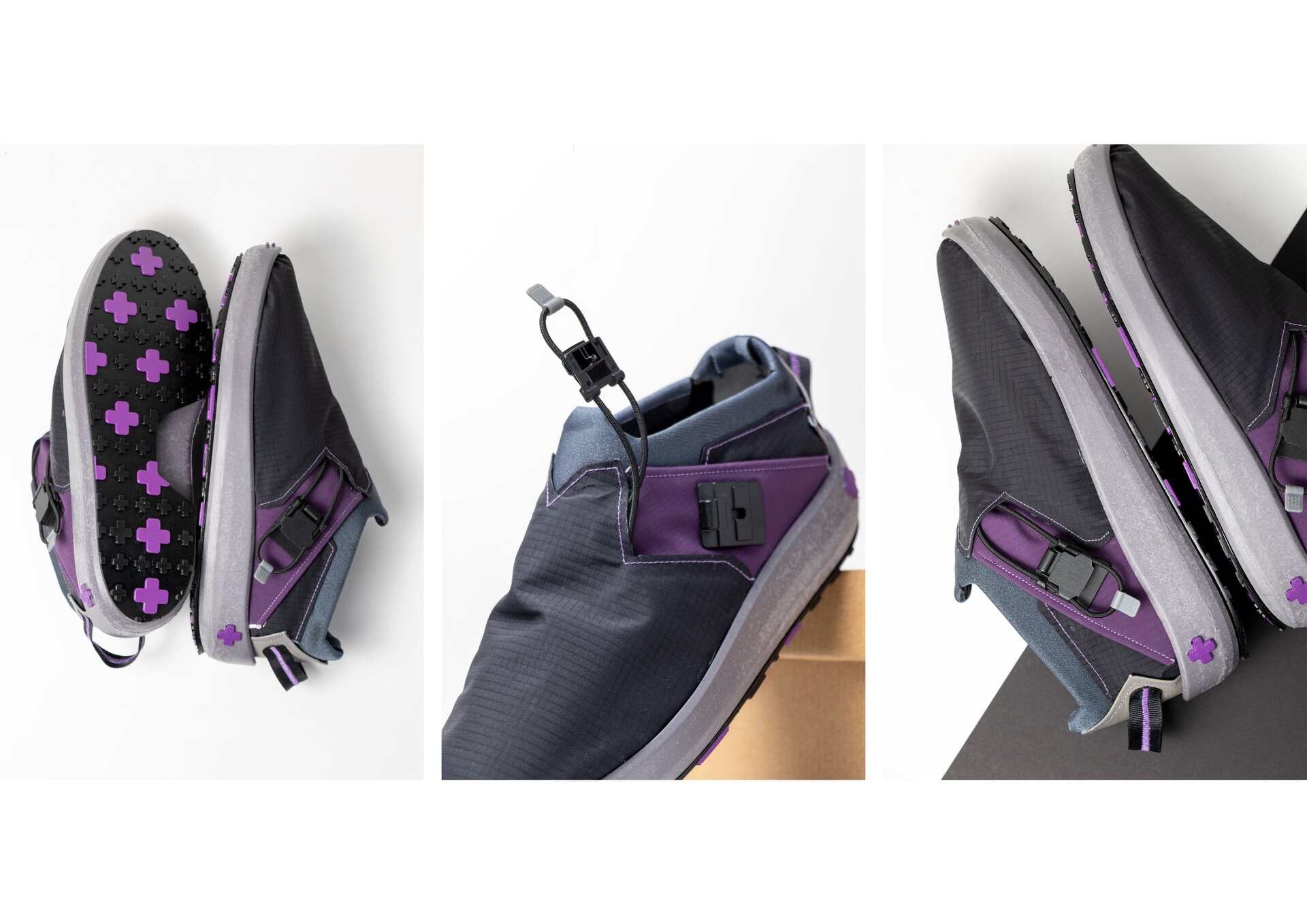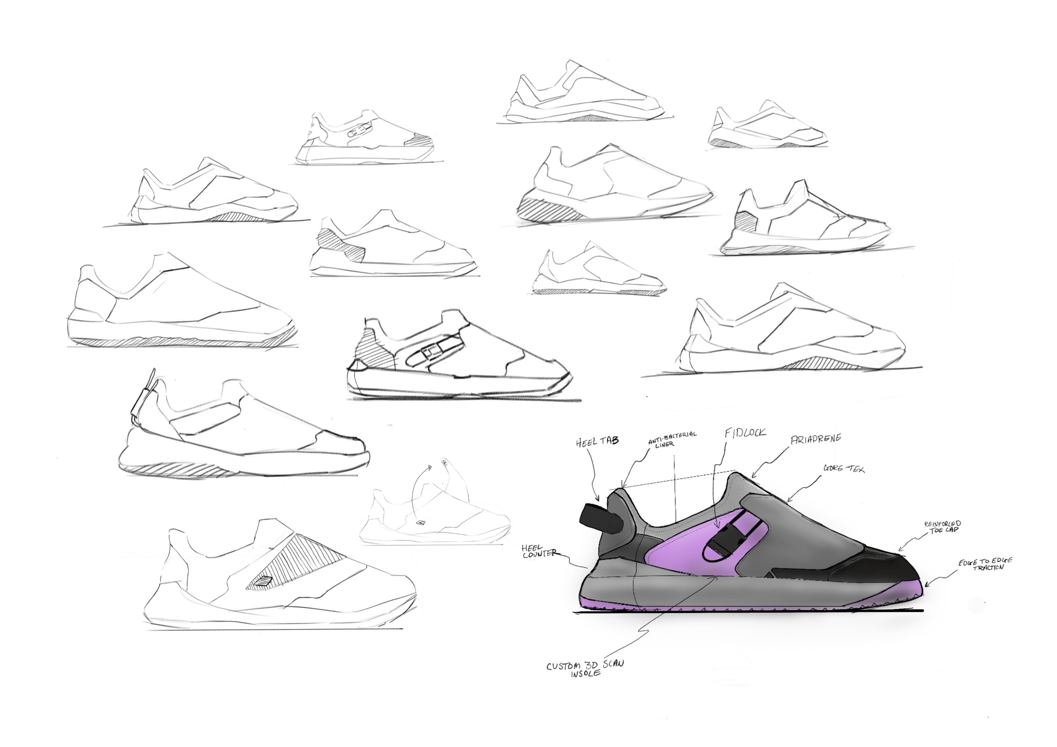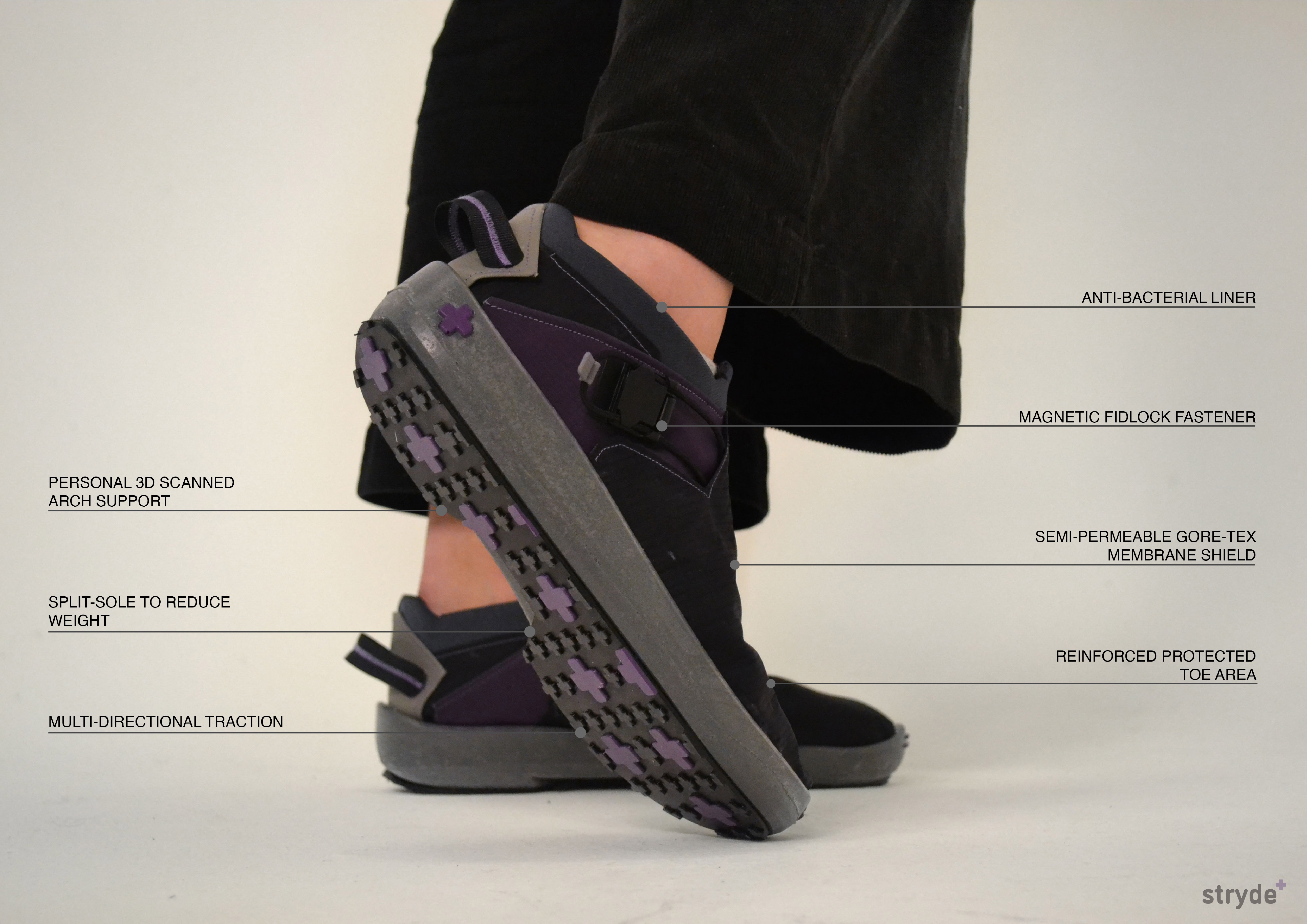 The design features of STRYDE that have been driven by user experience/characteristic insight and research include: An anti-bacterial liner to prevent odour and sweat. A magnetic FIDLOCK fastener for easy accessibility. A GORE-TEX shield for an easy to wipe fluid-proof surface. A reinforced toe area protects nurses from trolley wheels and falling medical equipment. A split sole design to reduce the overall weight of the shoe. 3D scanned personal arch support. Multi-directional traction for slippery situations.