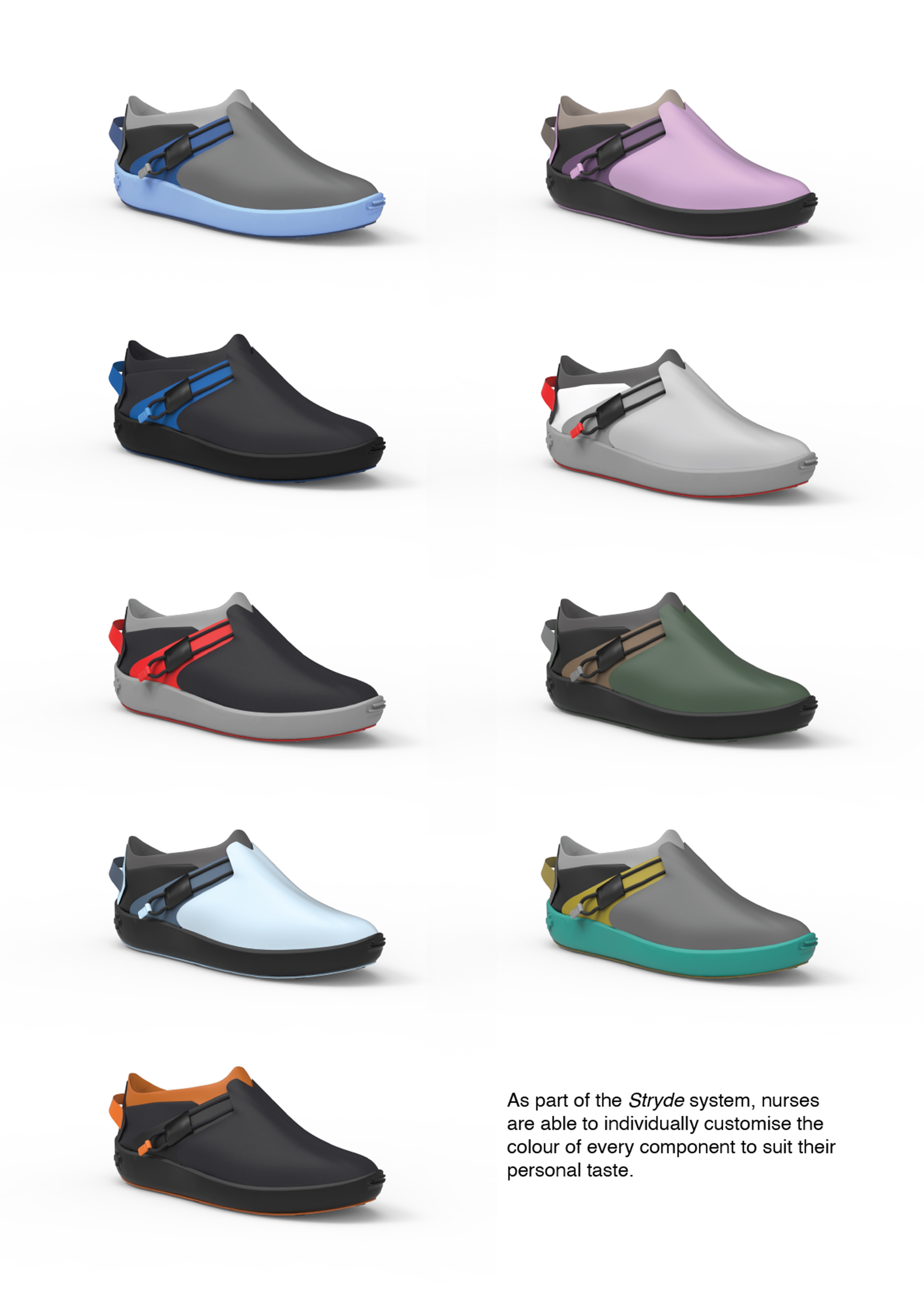 Through my own research, nurses have suggested there to be more "style" and "choices of colour", as nurses wear the same scrubs every shift. As footwear is one of the only items of clothing nurses have control over, some like to use their footwear style and colour to express their personality. As part of the STRYDE system, nurses are able to individually customise the colour of every component to suit their personal taste.