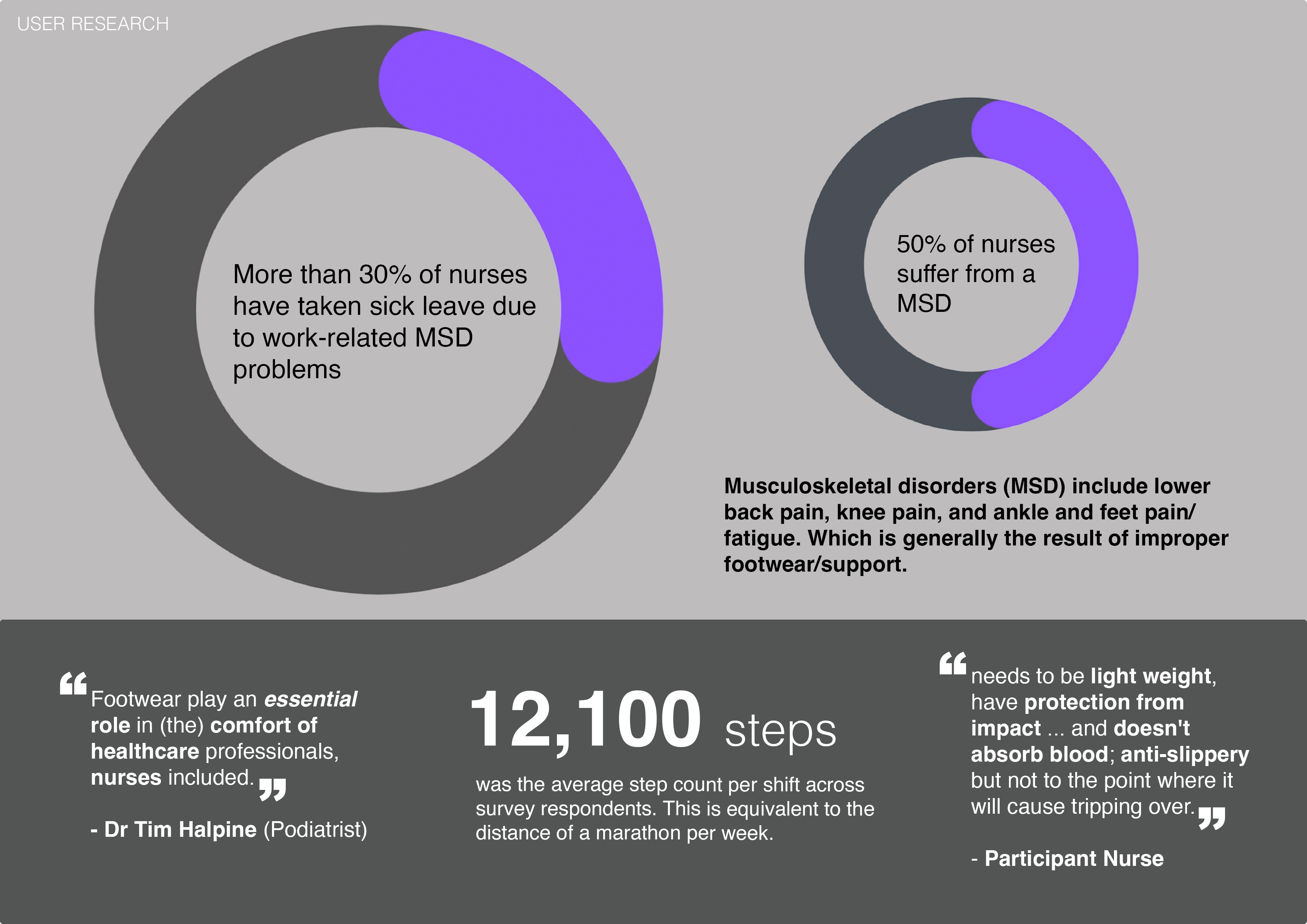 STRYDE's design features are inspired directly from insights gained through the involvement of nurses and the specific problems they encounter with their footwear while at work. With the midsole and outsole being injected moulded post-consumer recycled EVA compound rubber, alongside the 3D printed TPU arch insert, and the recyclable composite toe cap, STRYDE provides a footwear solution for nurses that improves functionality, comfort and is sustainably conscious.