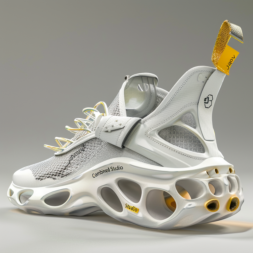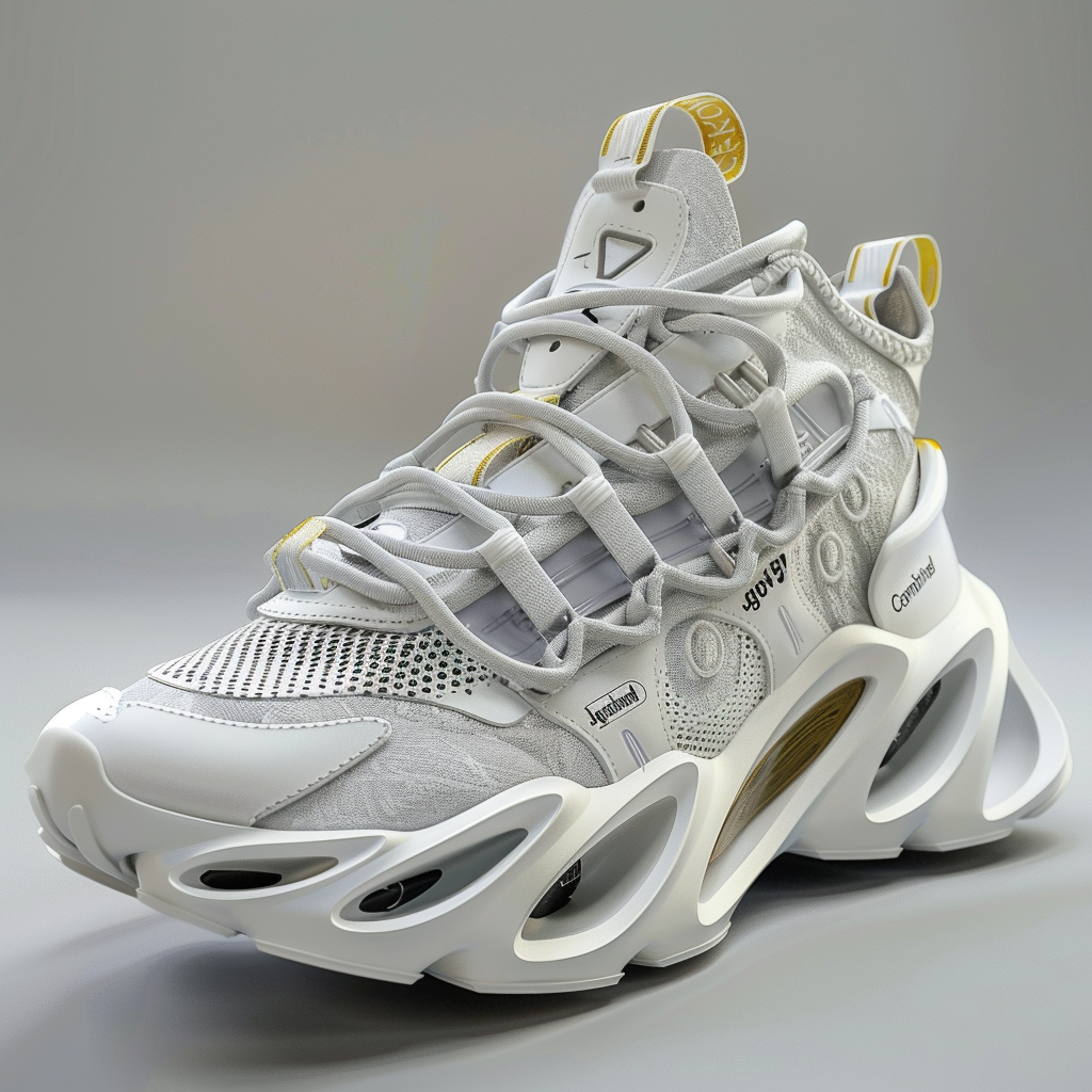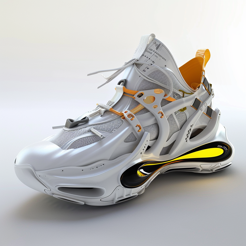 Description A futuristic sneaker deéign collection with sculptural and avant-garde style elements, featuring an air sole in white color with yellow accents on the outer edge. The main colors are silver and white, contrasting against its matte surface. The design includes intricate details like laceless straps and cushioned areas for comfort.
