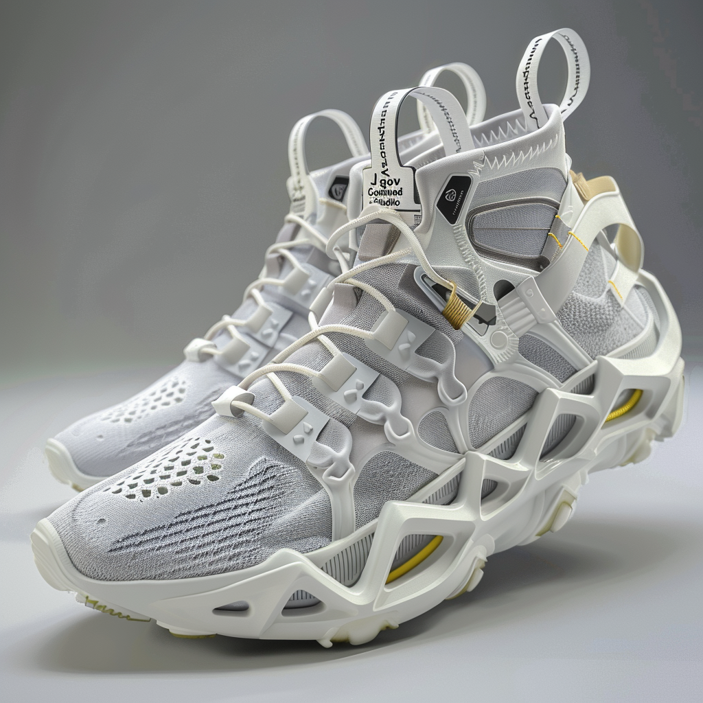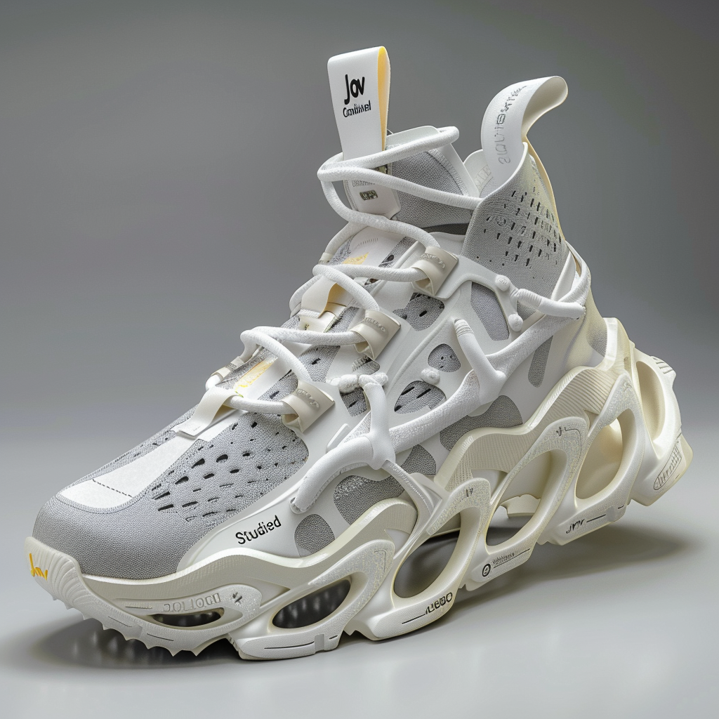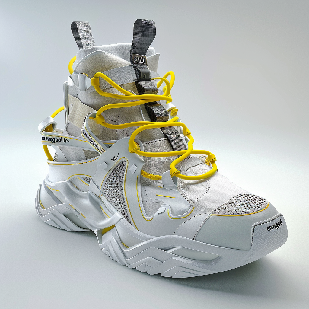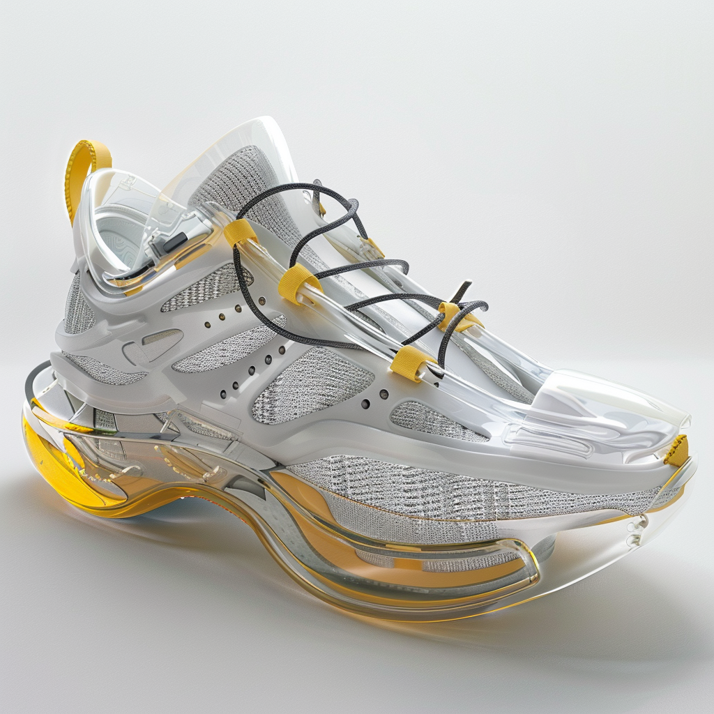 Description A futuristic sneaker deéign collection with sculptural and avant-garde style elements, featuring an air sole in white color with yellow accents on the outer edge. The main colors are silver and white, contrasting against its matte surface. The design includes intricate details like laceless straps and cushioned areas for comfort.