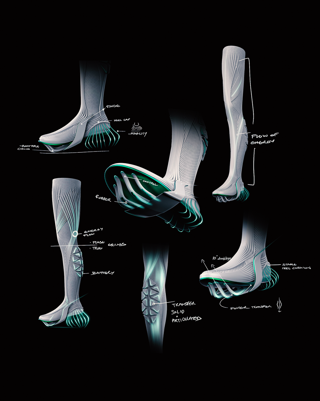 Product Detail Embrace is a vision for the future of the footwear medical industry. It’s a speculative design approach to enhanced mobility for Cerebral Palsy kids suffering from Foot Equinus. The condition of Equinus leads to imbalance of gait and in-toeing of the foot making walking difficult. Embrace approaches this condition with an adaptive brace which allows muscle stimulation on imbalanced movement while facilitating natural gait through posture control toe to heel mechanism. Embrace aims to achieve faster therapy and ankle foot brace recovery for kids suffering from Equinus while conditioning them to embrace their inability into capabilities.