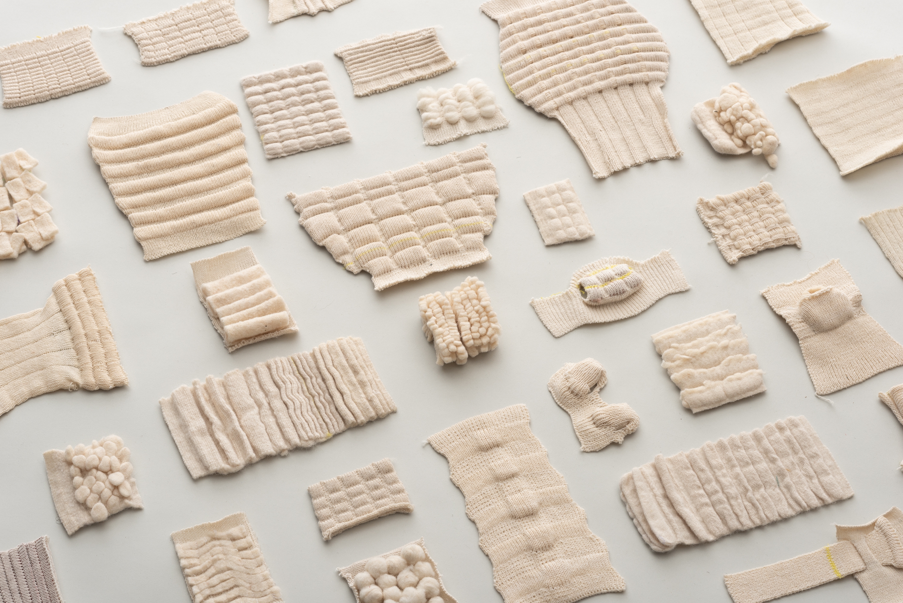The 3D knitting technique has enabled the development of a drop-free product, with felted wool integrated into the knit. The knitting technique developed allows the felted wool to be integrated into the knit in blocks, resulting in a flexible yet rigid surface.