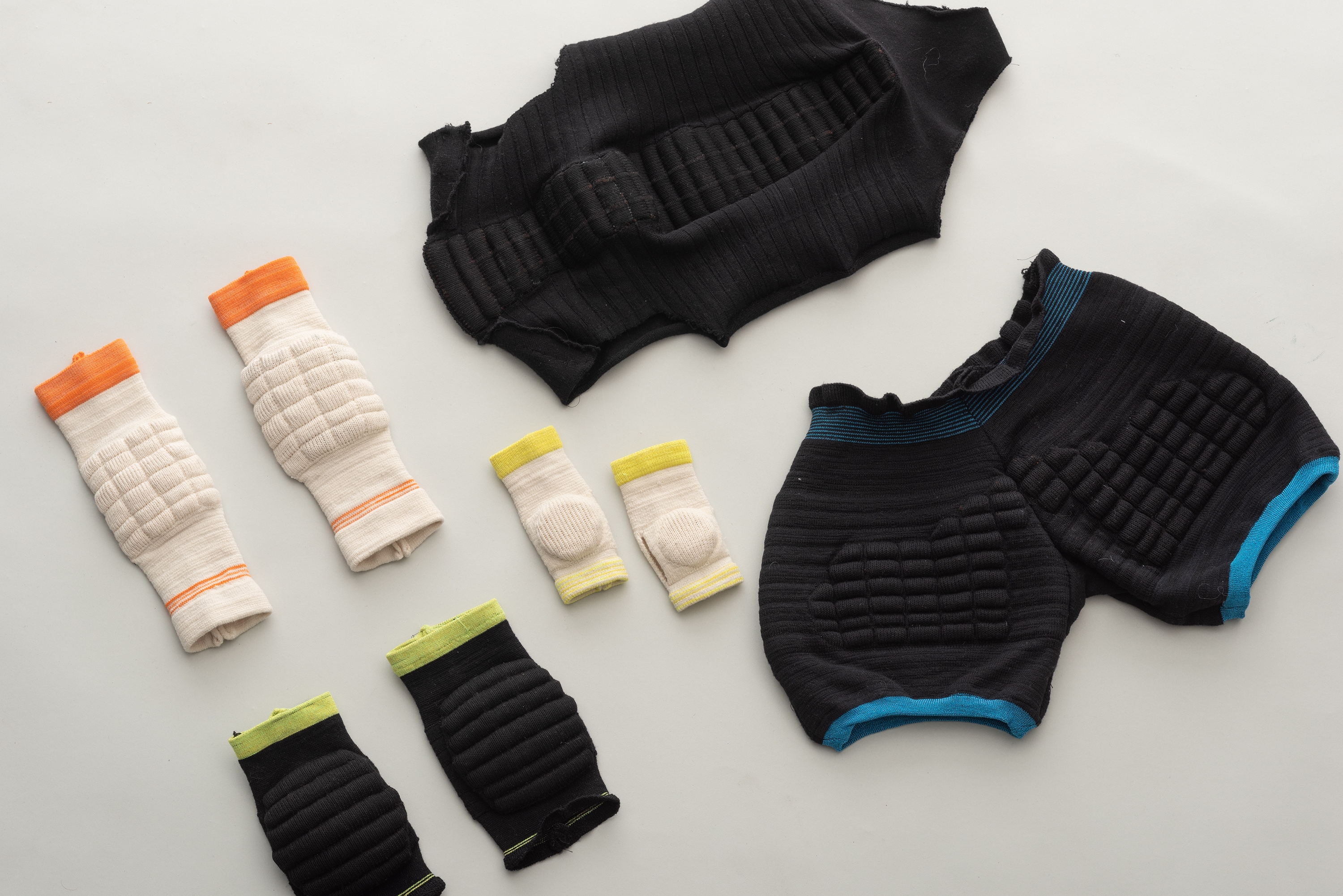 We conducted extensive textile research to find out how to integrate protective surfaces without altering the agility of the athlete. Our aim was to design accessories that are easy to layer over workout clothes and that don't restrict the athlete's movements.