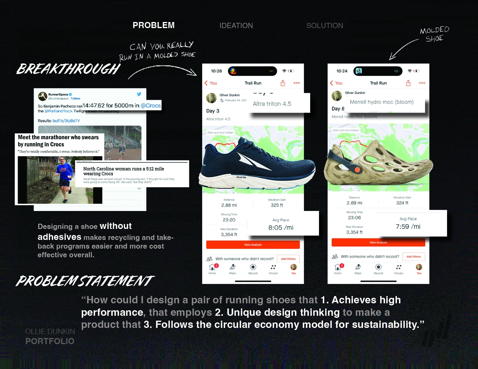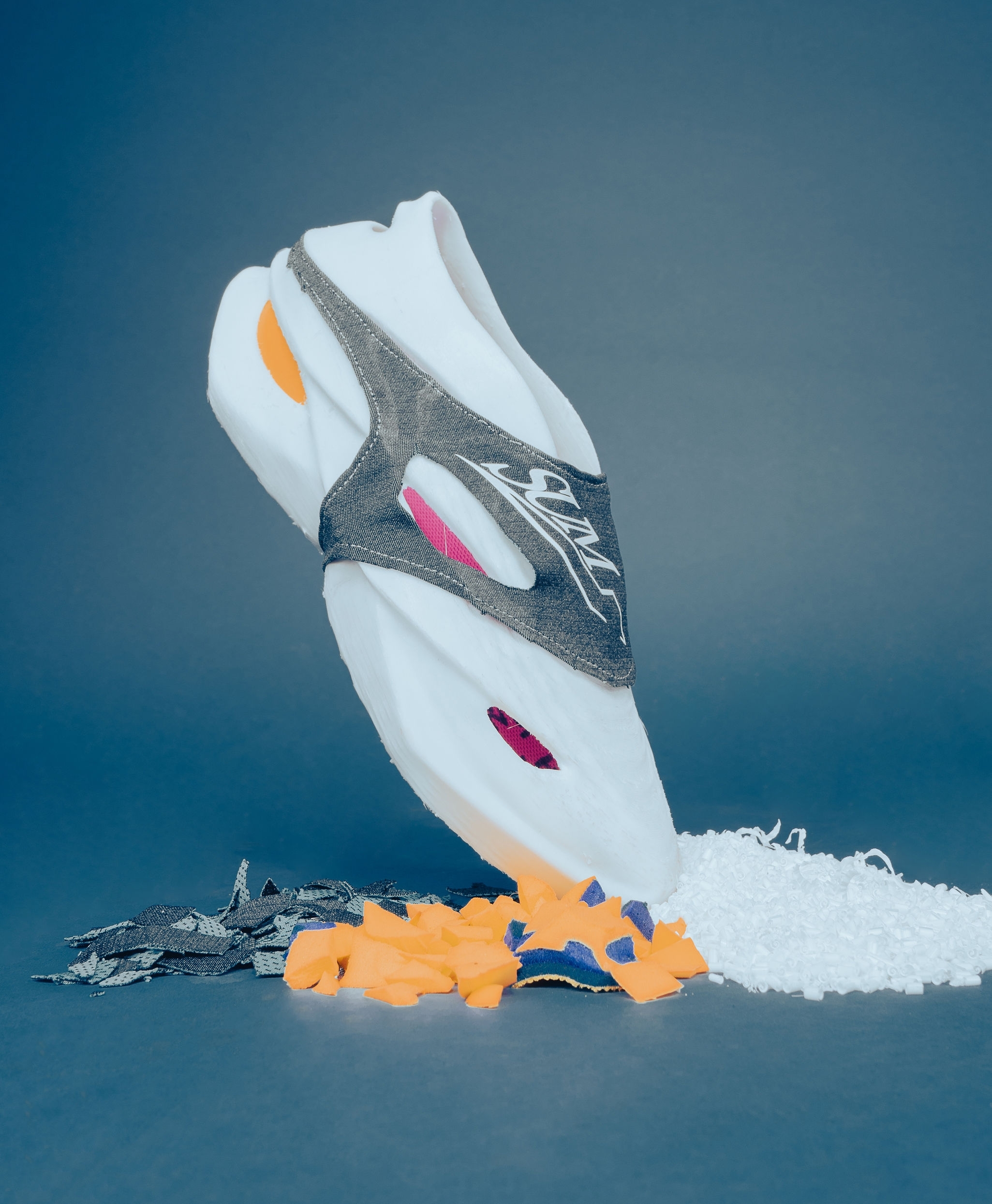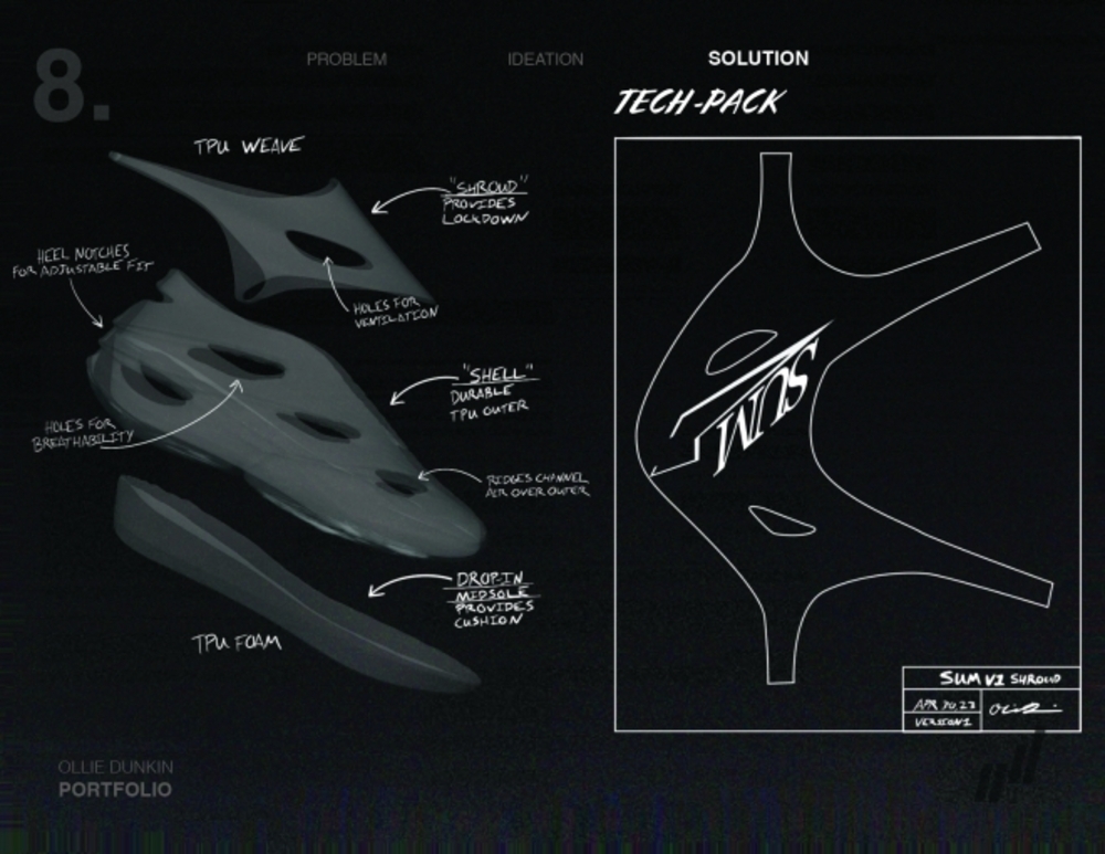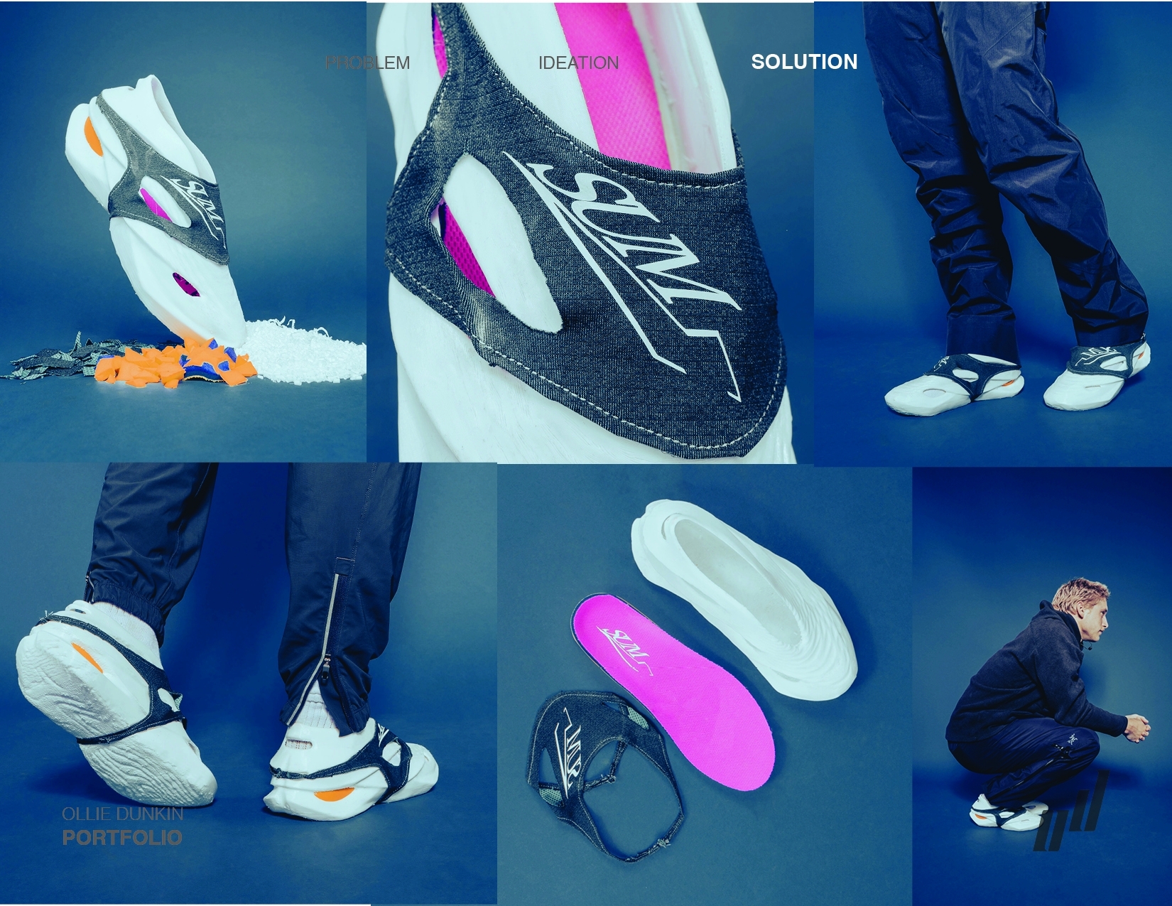 Description Sum Shoes:high-performance running shoes with three components—a shroud (lockdown), drop-in midsole (cushioning/bounce), and outer shell (structure/traction) constructed without glue recycling and repurposing material. The typical lifespan of a running shoe is about 300-400 miles (2-6 months) until they end up in landfills. Sum's Solution: return the shoes to the manufacturer for disassembly and recycling. TPU and knit can be transformed into reusable materials for shoe production or recycling programs like Nike Grind. Reducing waste, promoting sustainability in performance shoes.