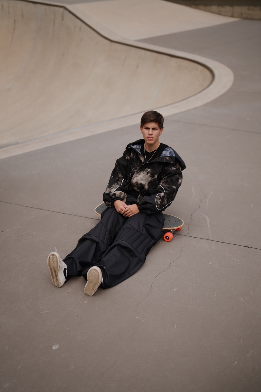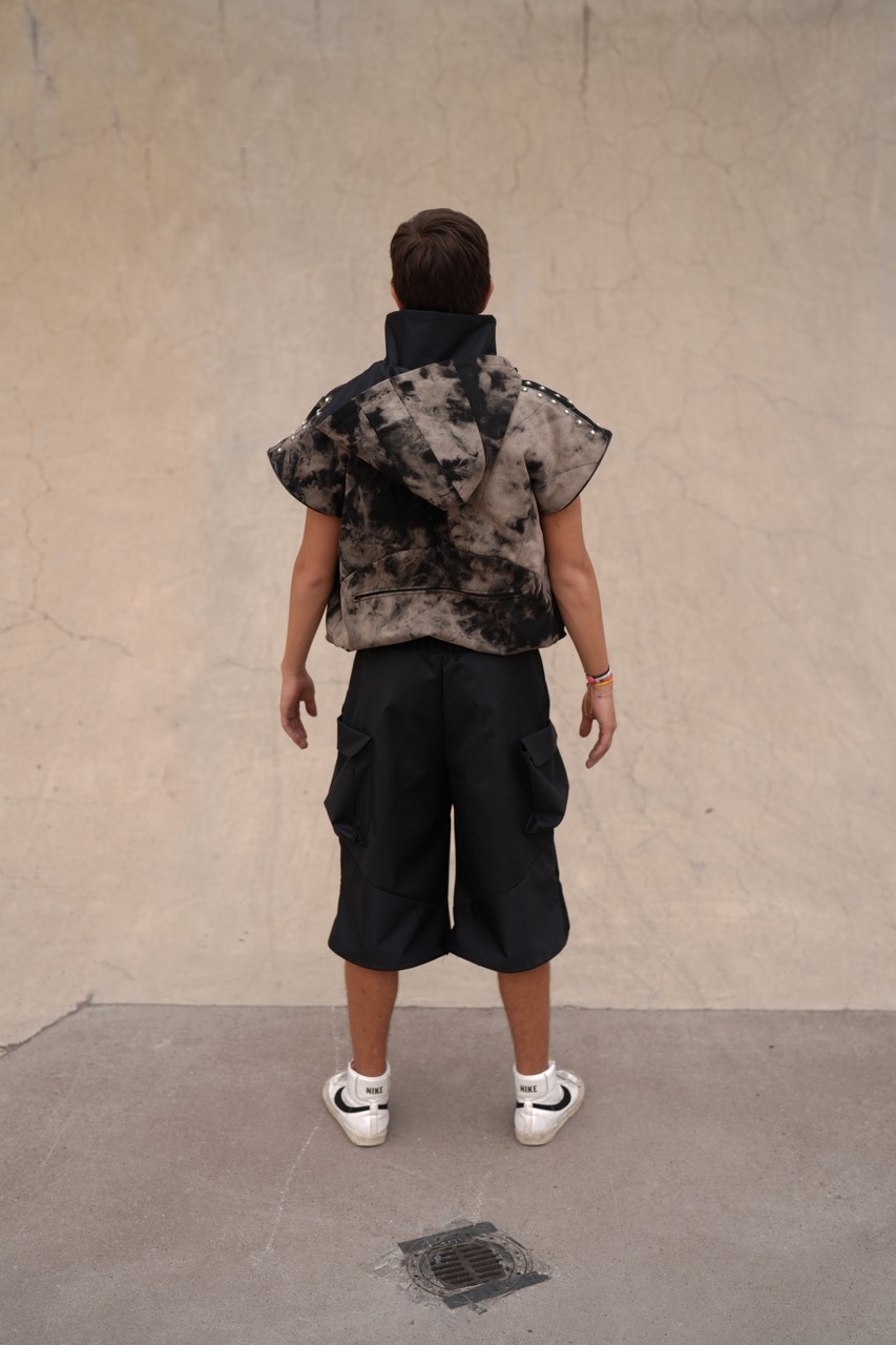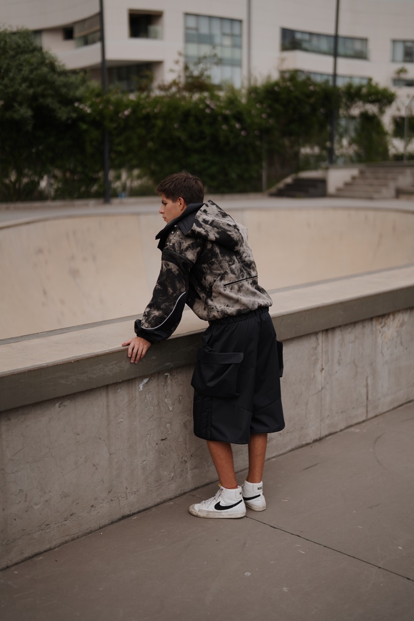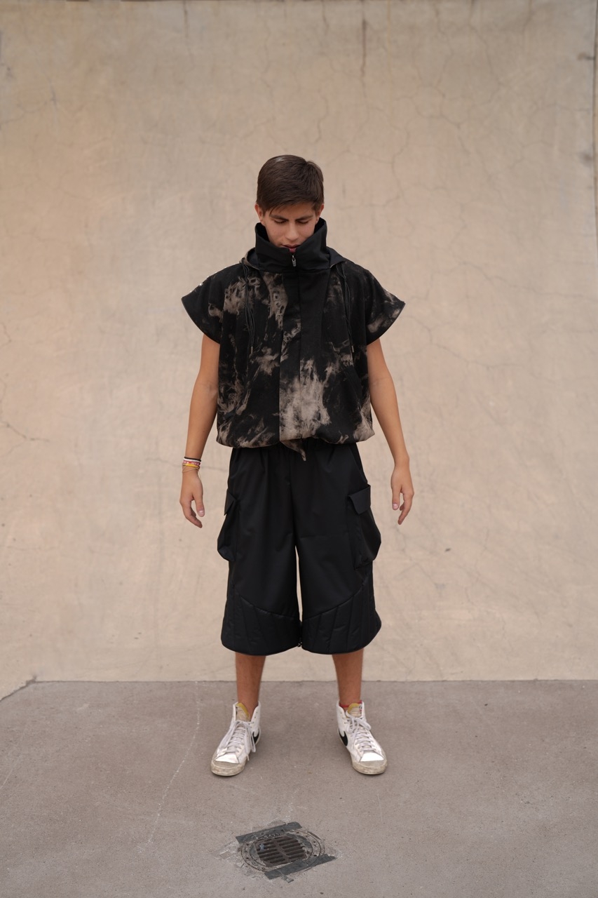 Description My project "SK Studios" aims to promote sustainable urban micro-mobility through fashion and textiles, by means of a safe, wearable and attractive garment for people who skate around the city. It consists of a bomber jacket with long sleeves and detachable sleeves, hat and elastic waistband. Long bloomers, with hip patch pockets, cargo and back pockets, with detachable legs to make bermuda shorts.