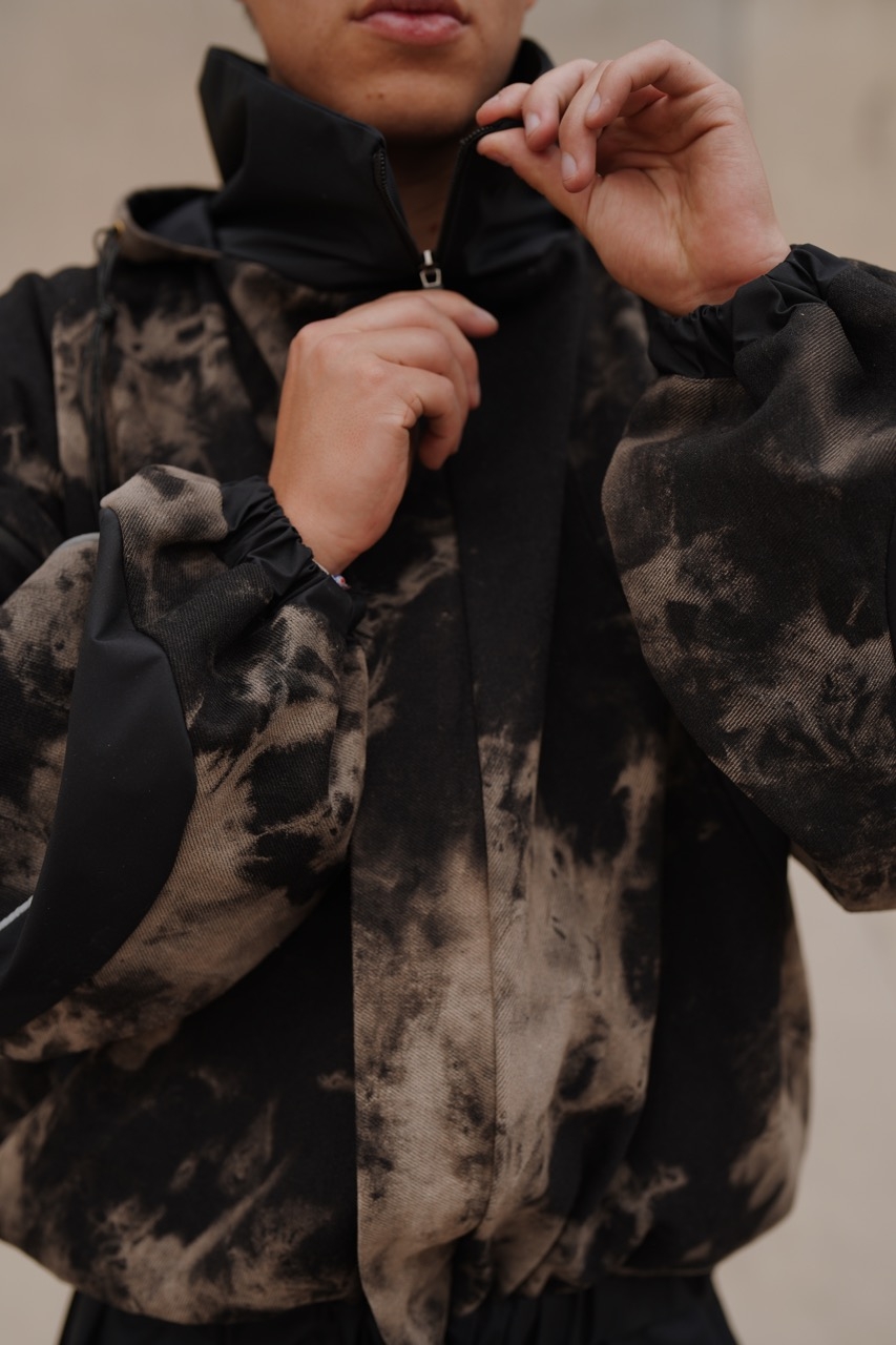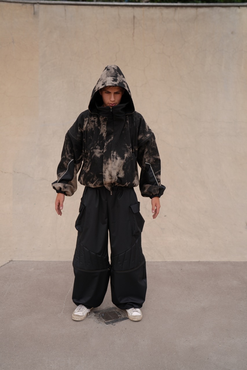 Specification Attire for young man size M. Color: Chlorine bleached black outer fabric, blue, black and grey printed lining, black trousers Fall Winter Season 2024 - 2025.