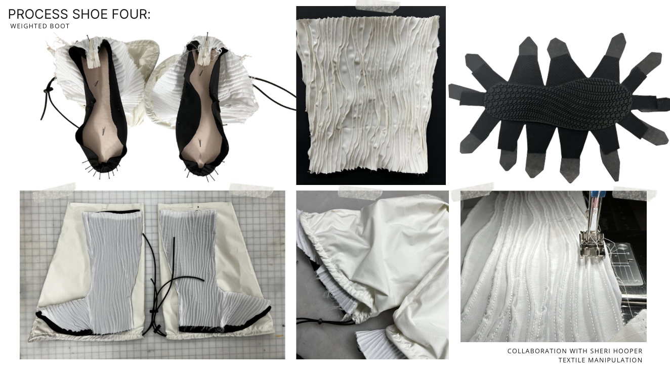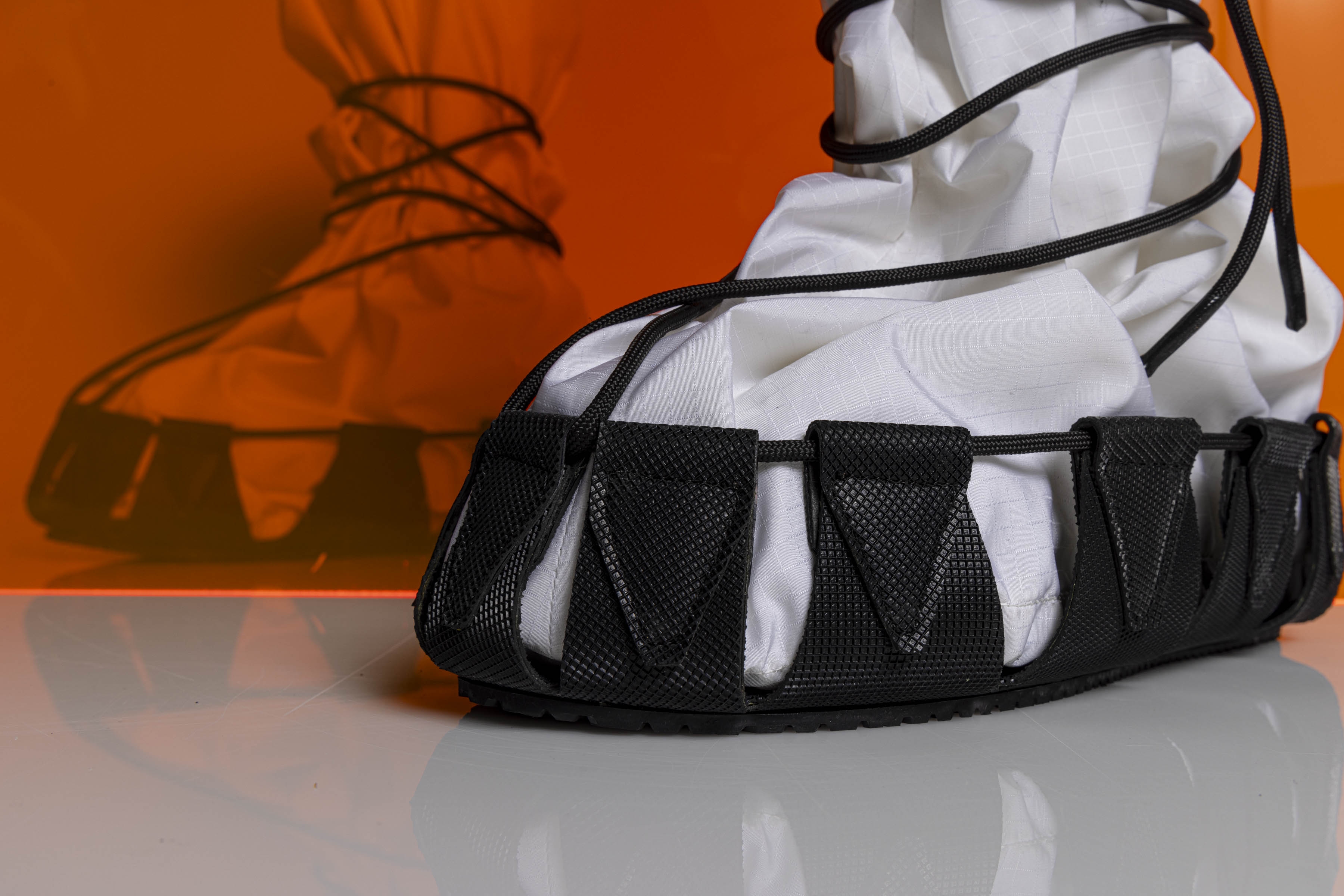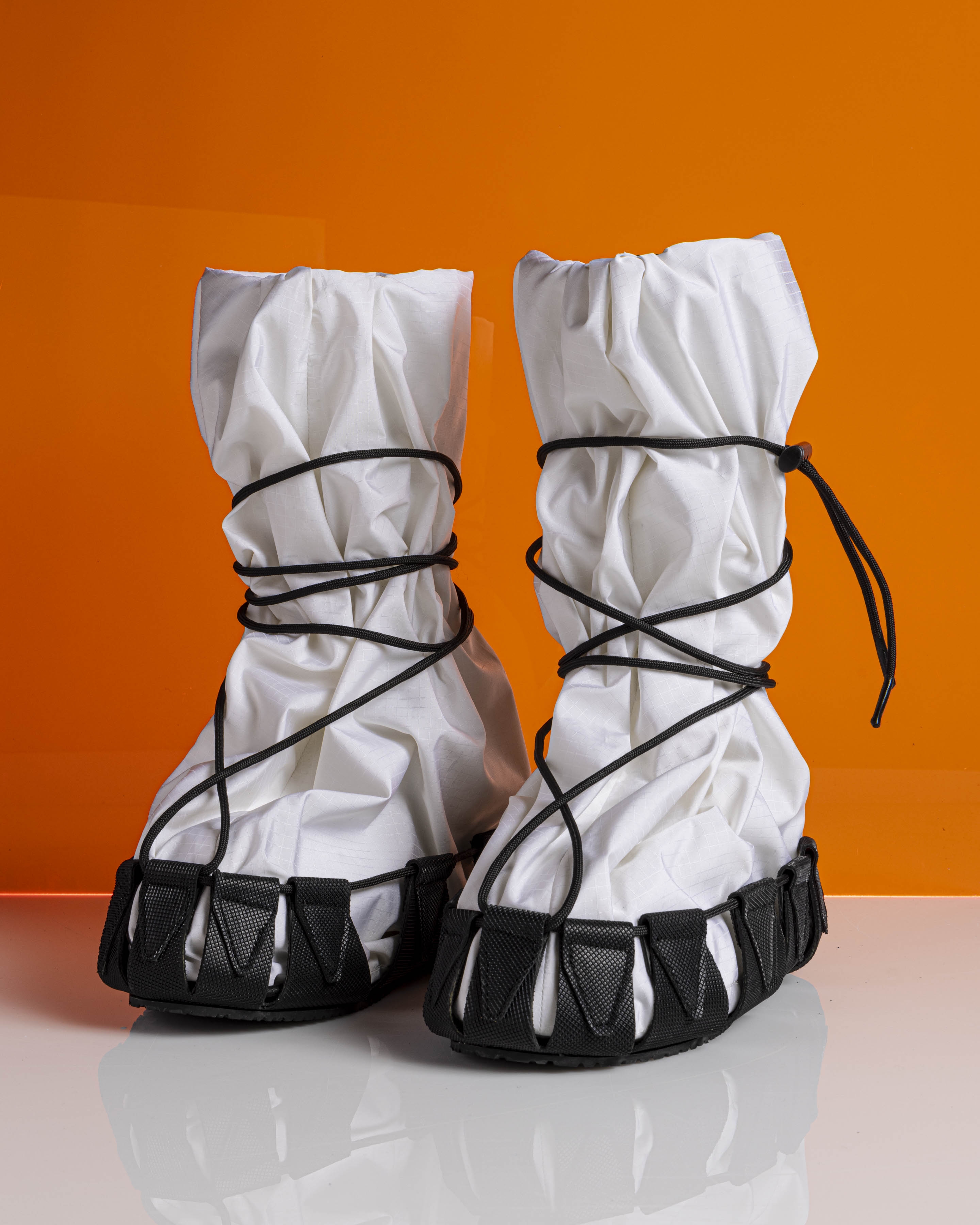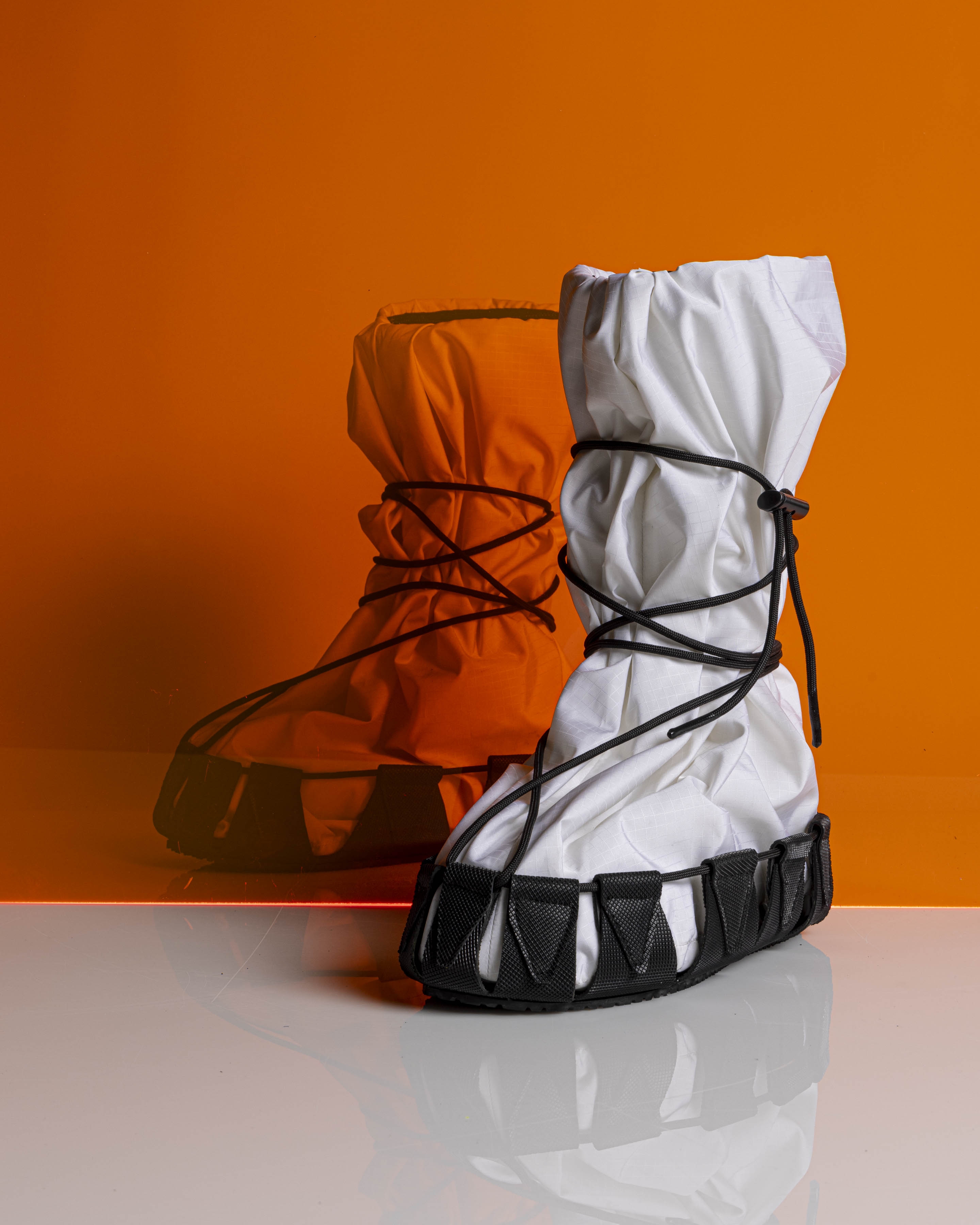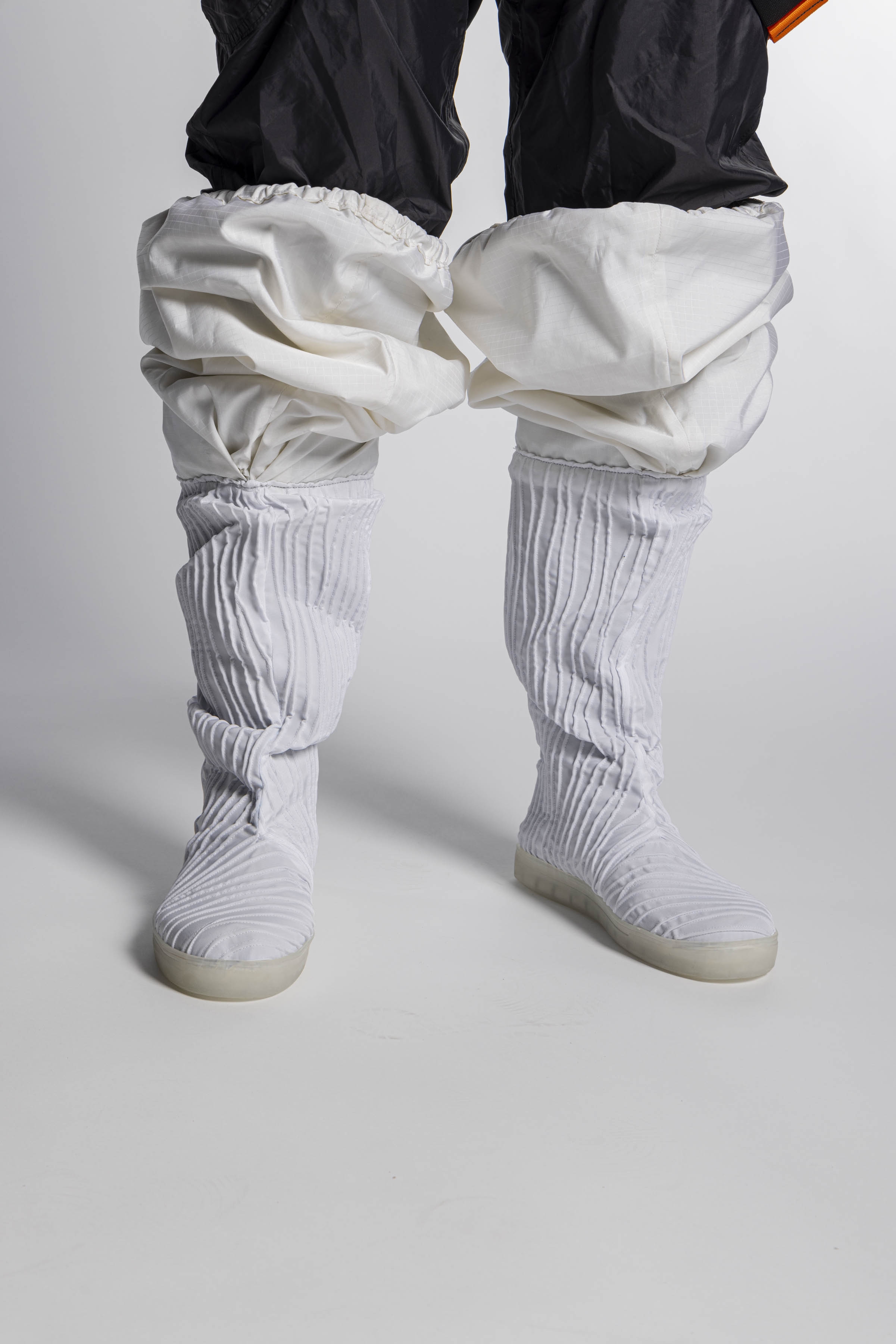 Tall white boot that can be extended for a breathable tight ware or brought down for a baggie waterproof fit with an external black sole ensuring the boot's protection against the elements. This design is customizable and sustainable. The client can decide what kind of boot they want to wear depending on the weather or look without changing their footwear. This eliminates the need for multiple pairs of boots, by creating versatility inside a multi use boot.
