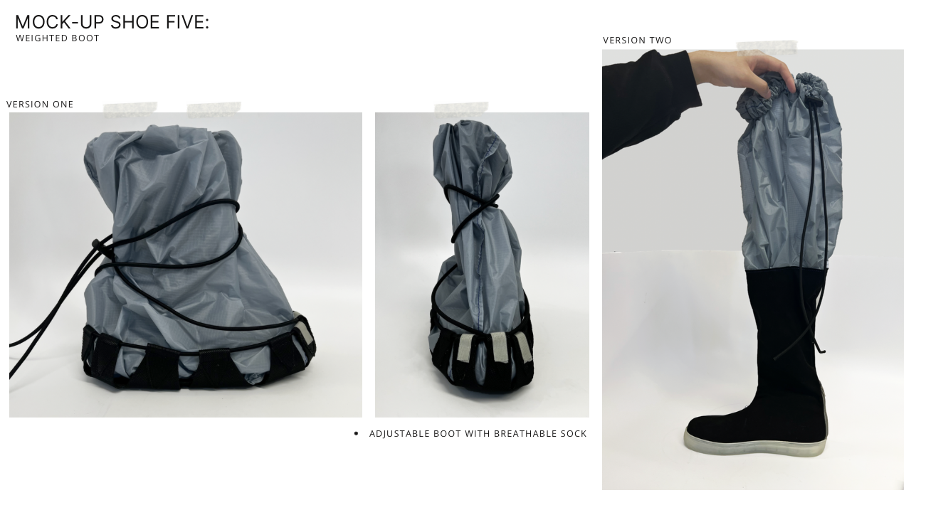 This product innovation comes with its customizability allowing the product to have a longer life leading to a more sustainable design. Having a snow boot that can not only protect against the elements but also allowing the boot to breathe and be reset. This allows the client to change their footwear depending on the terrain and weather. The outer upper is a baggie construction that can be worn over the inner upper and around the internal sole to ensure a waterproof fit. Or in less extreme conditions the outer upper can be pulled over the leg and above the knee to let the inner upper to breathe. The external soul is a thin strong piece of rubber that lays flat when not being worn for its packing convenience. But when worn and cinched over the foot it holds its construction with a strong cord that is secured by a toggle behind the foot. This multi function design gives control back to its wearer by letting them customize the boot they need, alleviating the requirement for multiple boots to meet different weather conditions.