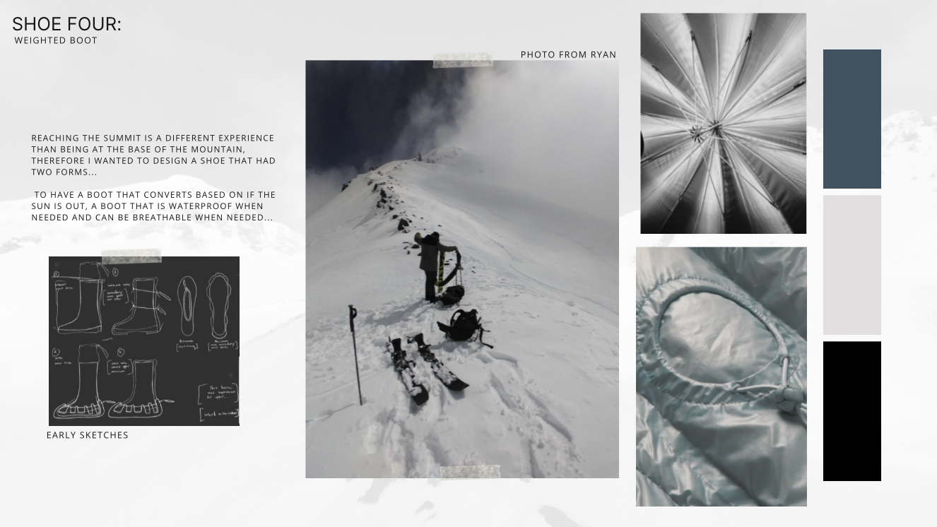 This boot is a lightweight unisex product that is designed to keep snow and water out while letting air in and heat in. These two different designs inside one product allow various customizable aspects to the client depending on the terrain or weather. This product will also be available in multiple different colors but the white resembles the purity and simplicity of this design.