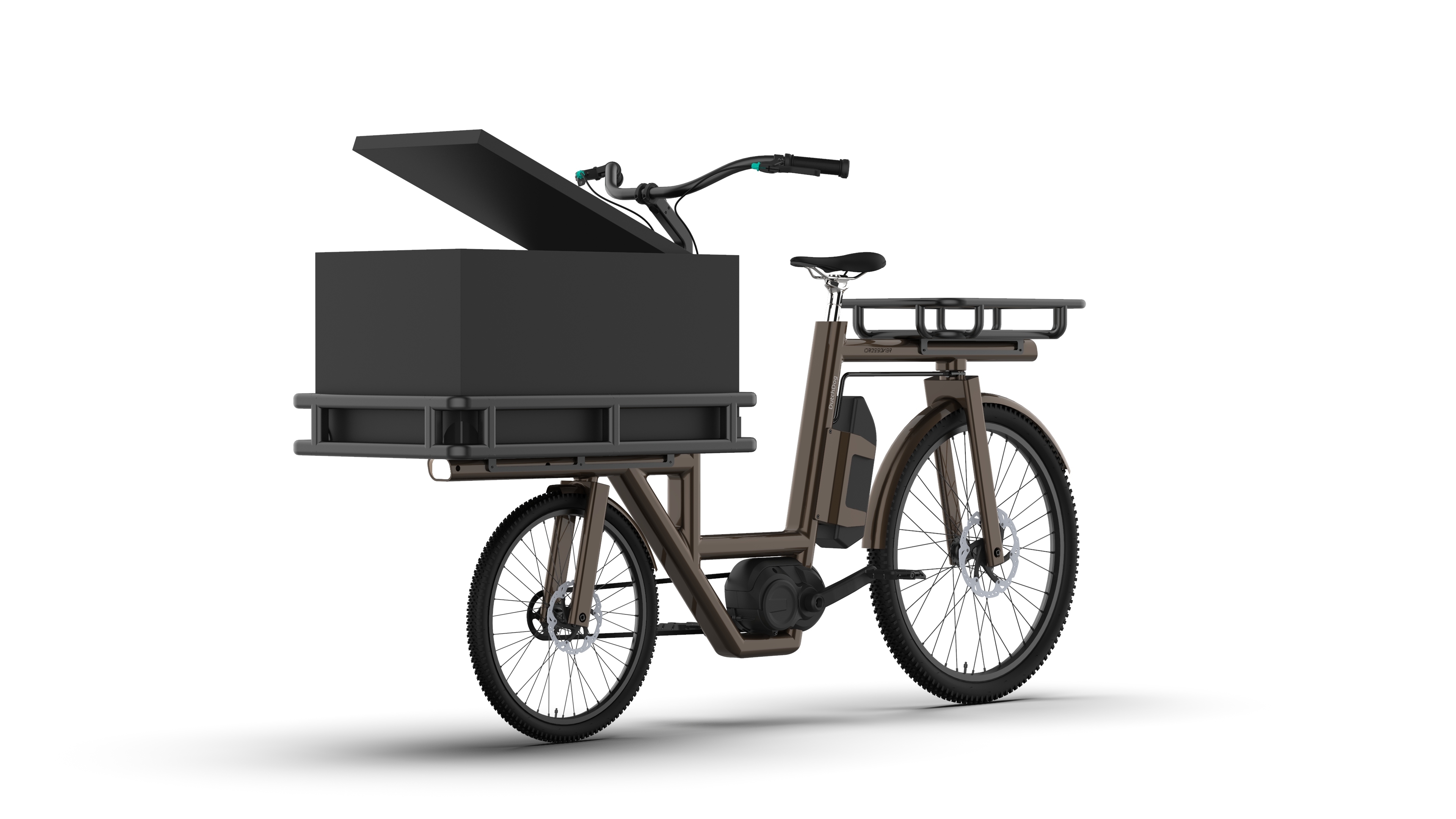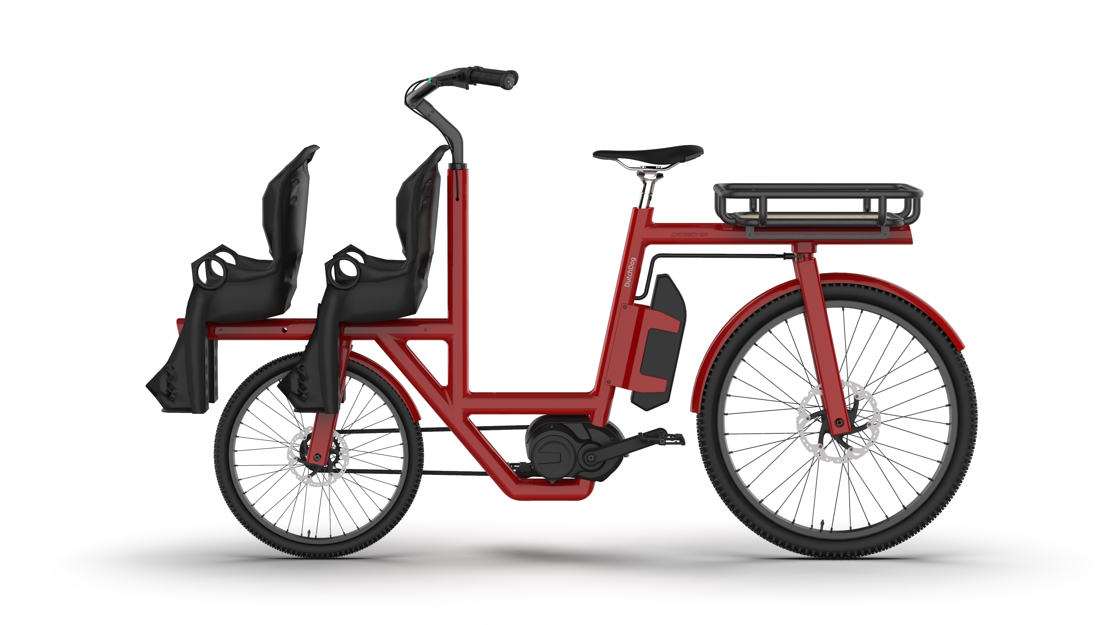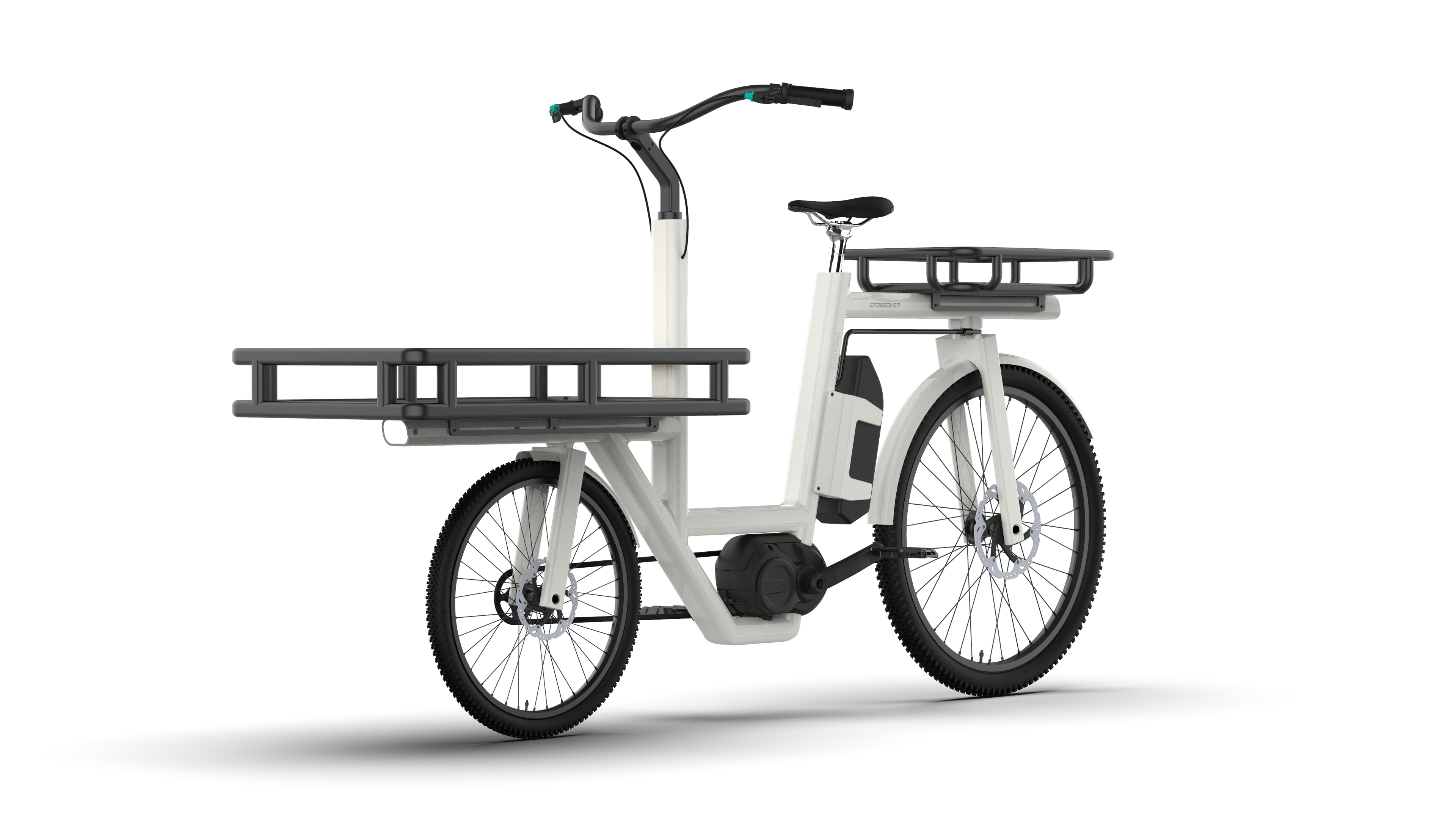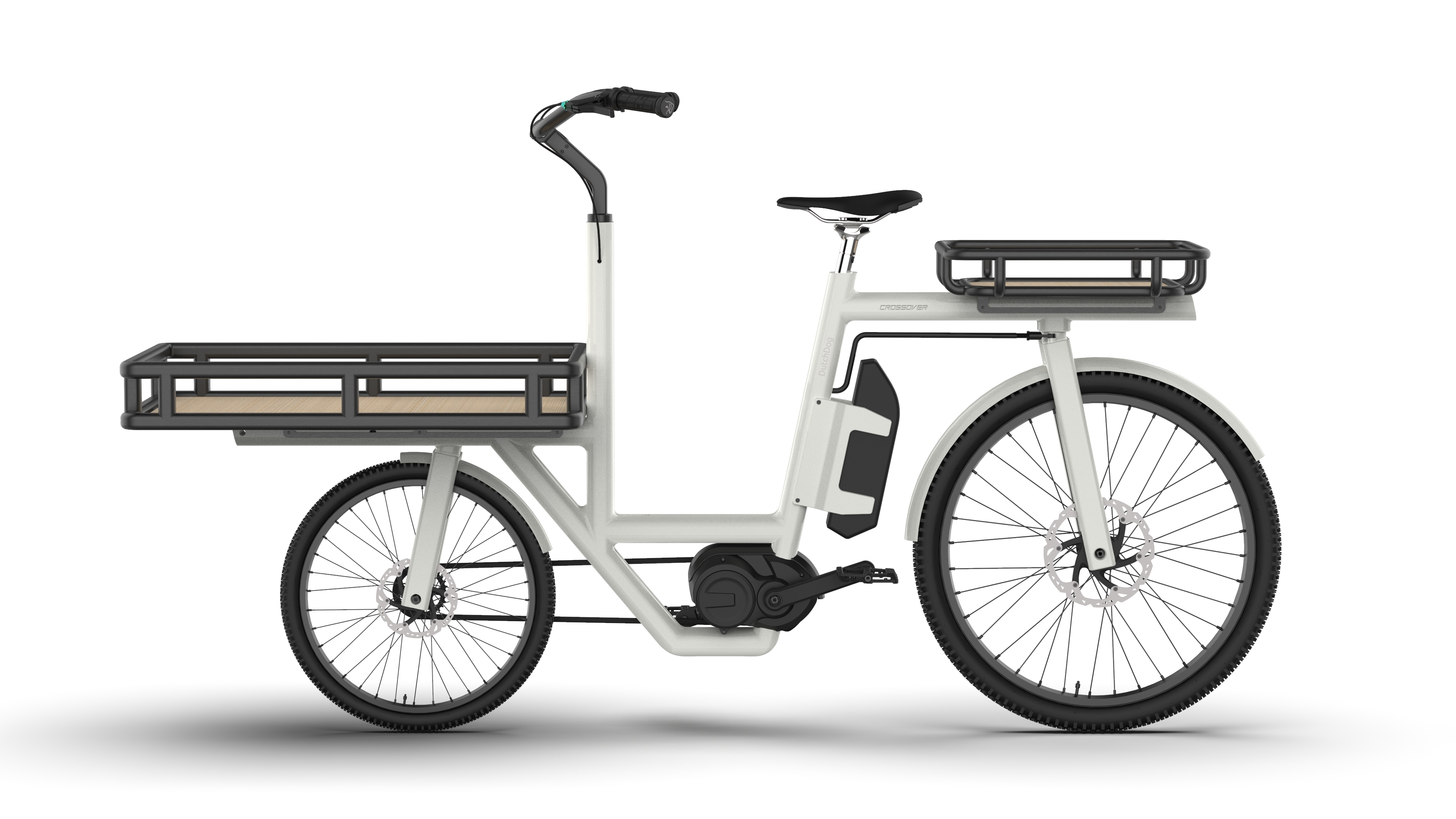 Product Detail The Crossover front-loading, rear-steering electric bicycle is designed for versatile, high-value cargo transport. It accommodates two children in child seats or on a bench with secure monkey bars, or can transport a pet in a cargo box equipped with a fold-down loading step. The modular cargo box is perfect for grocery runs or last-mile delivery.
