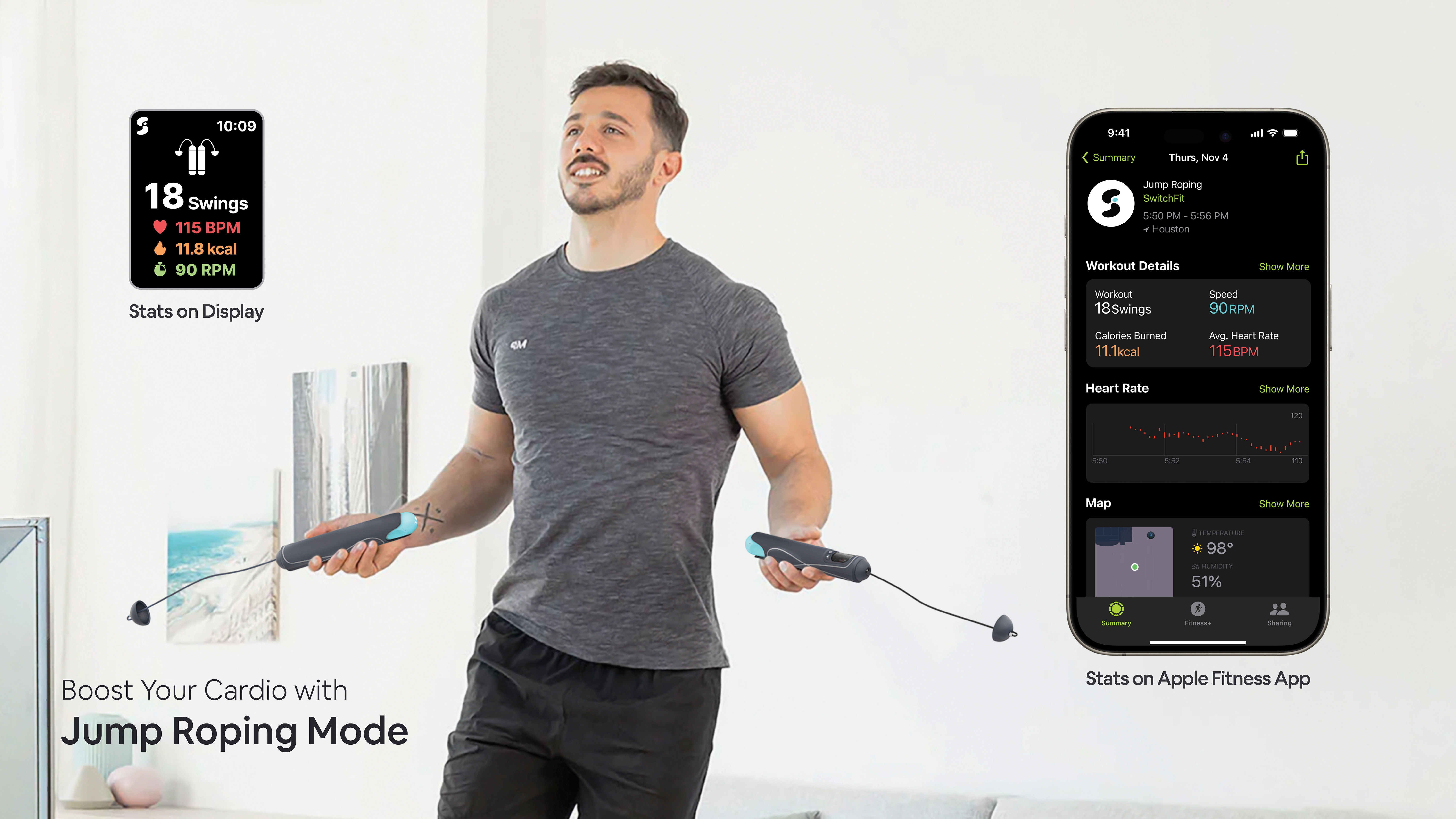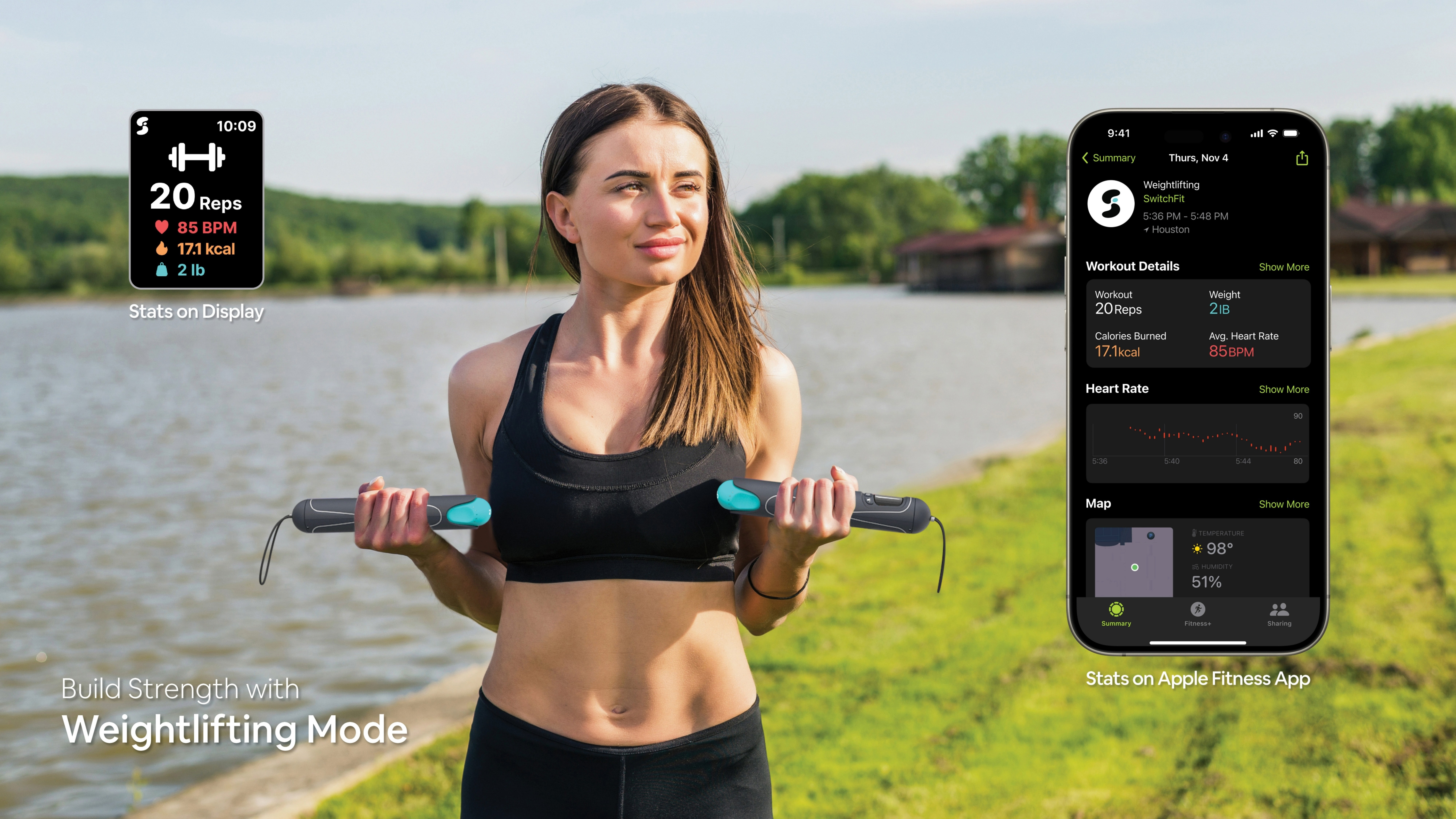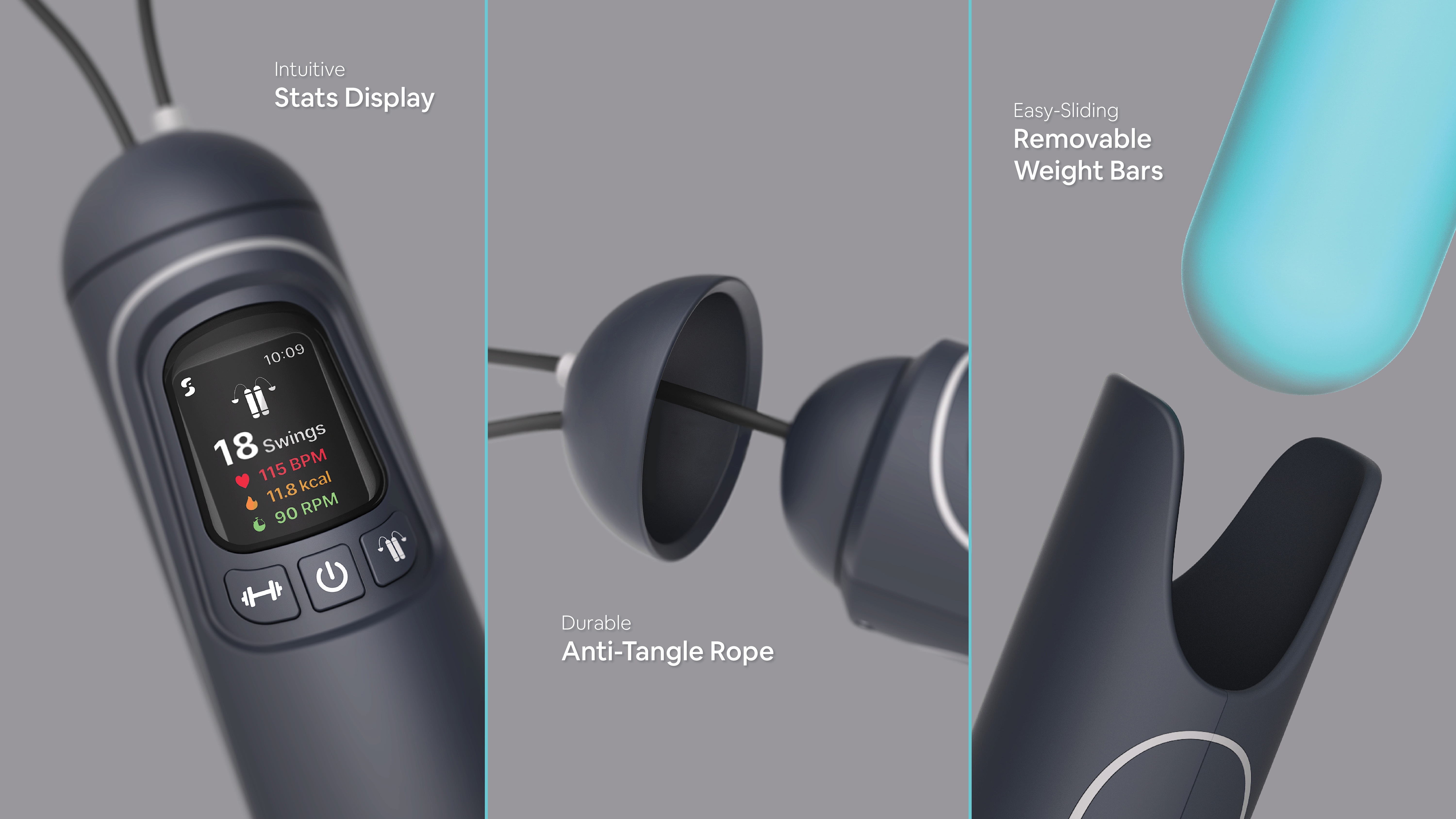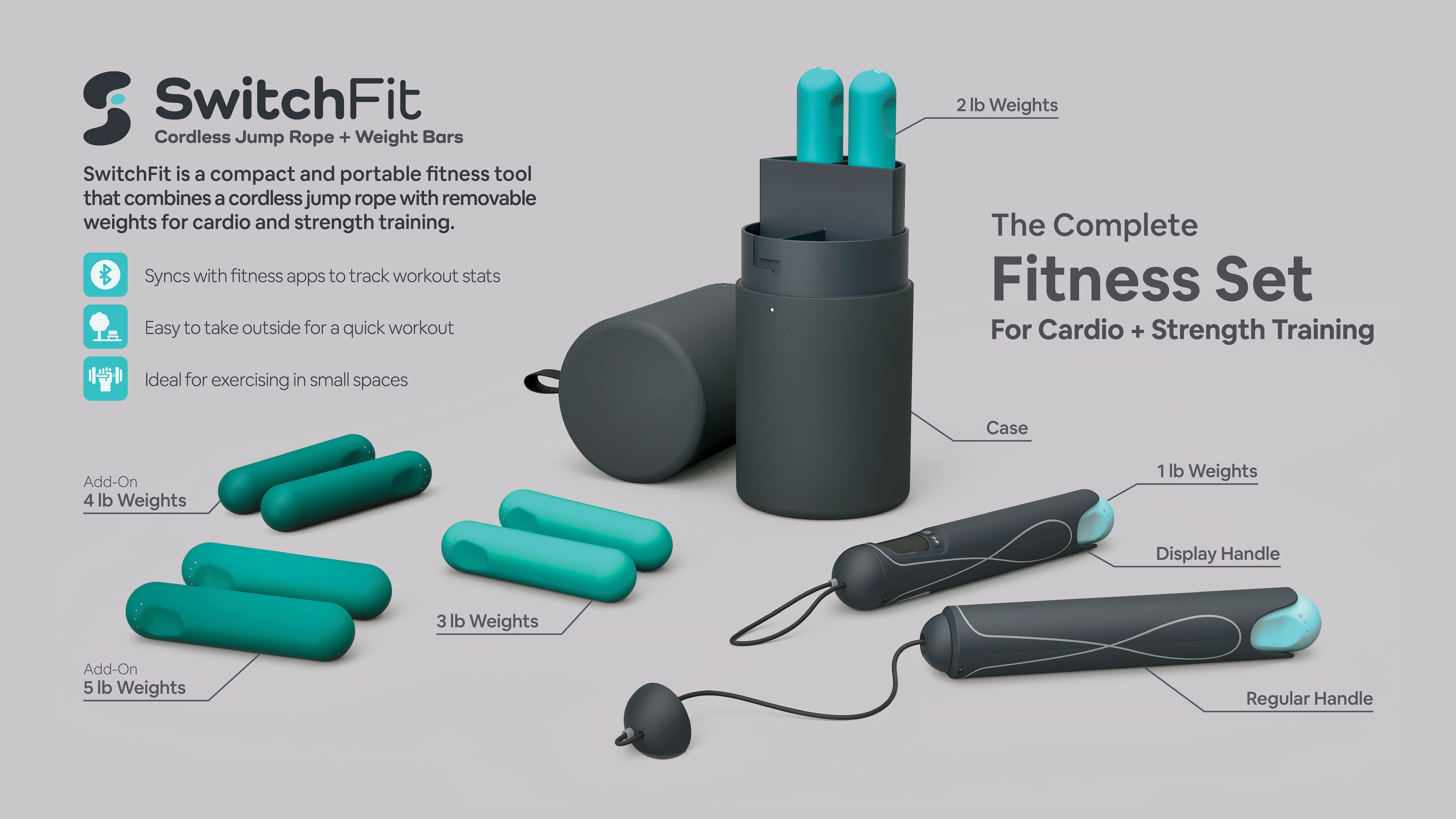 Description SwitchFit is a compact, portable fitness tool designed for urban lifestyles. It combines a cordless jump rope with removable weights, making it easy to transition between cardio and strength training in small indoor spaces or outdoor settings. The smart handle features a built-in display that tracks workout stats, offering two exercise modes: jump roping and weight lifting. Versatile and durable, SwitchFit adapts to various workout needs and seamlessly fits into busy routines. The set includes a portable case, two ergonomic handles, and small 1–3 lb weights, with optional 4 lb and 5 lb weights available for more intense workouts.