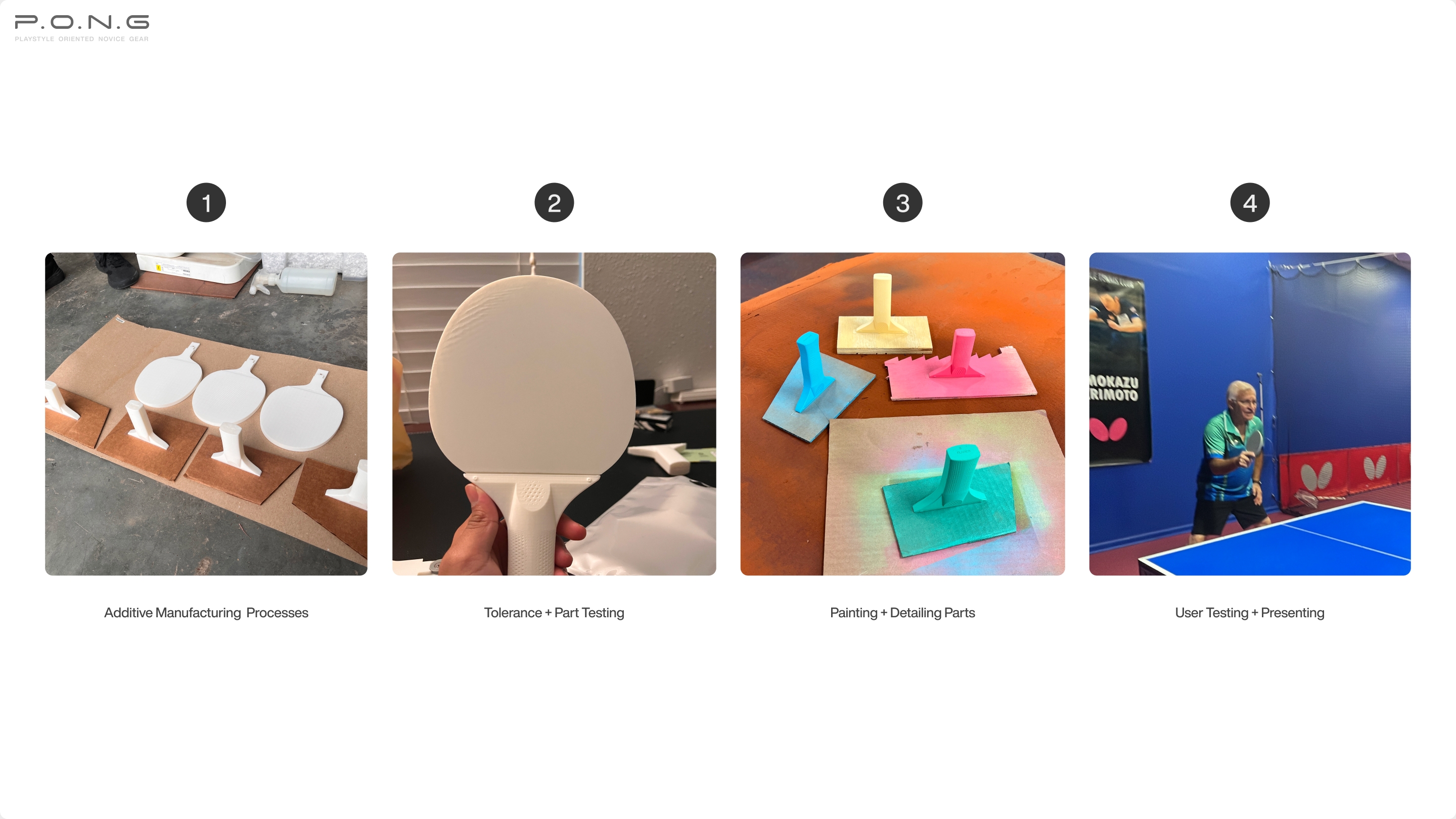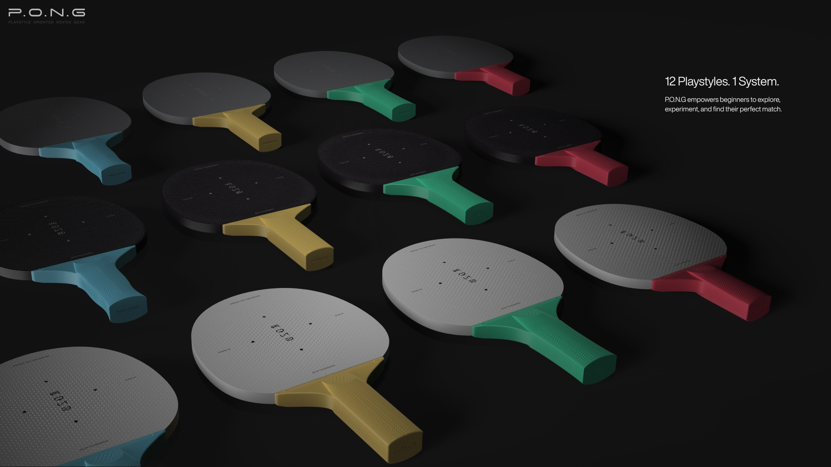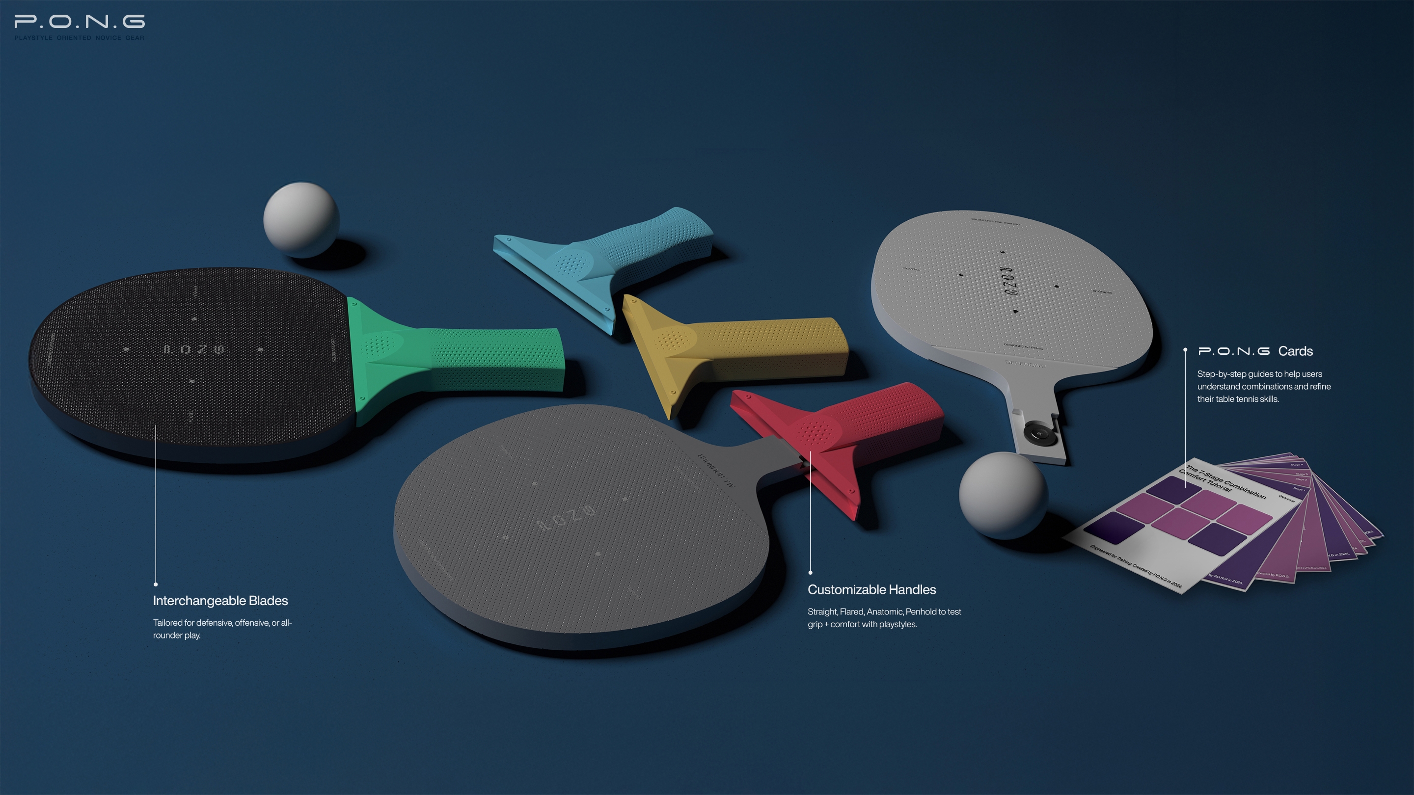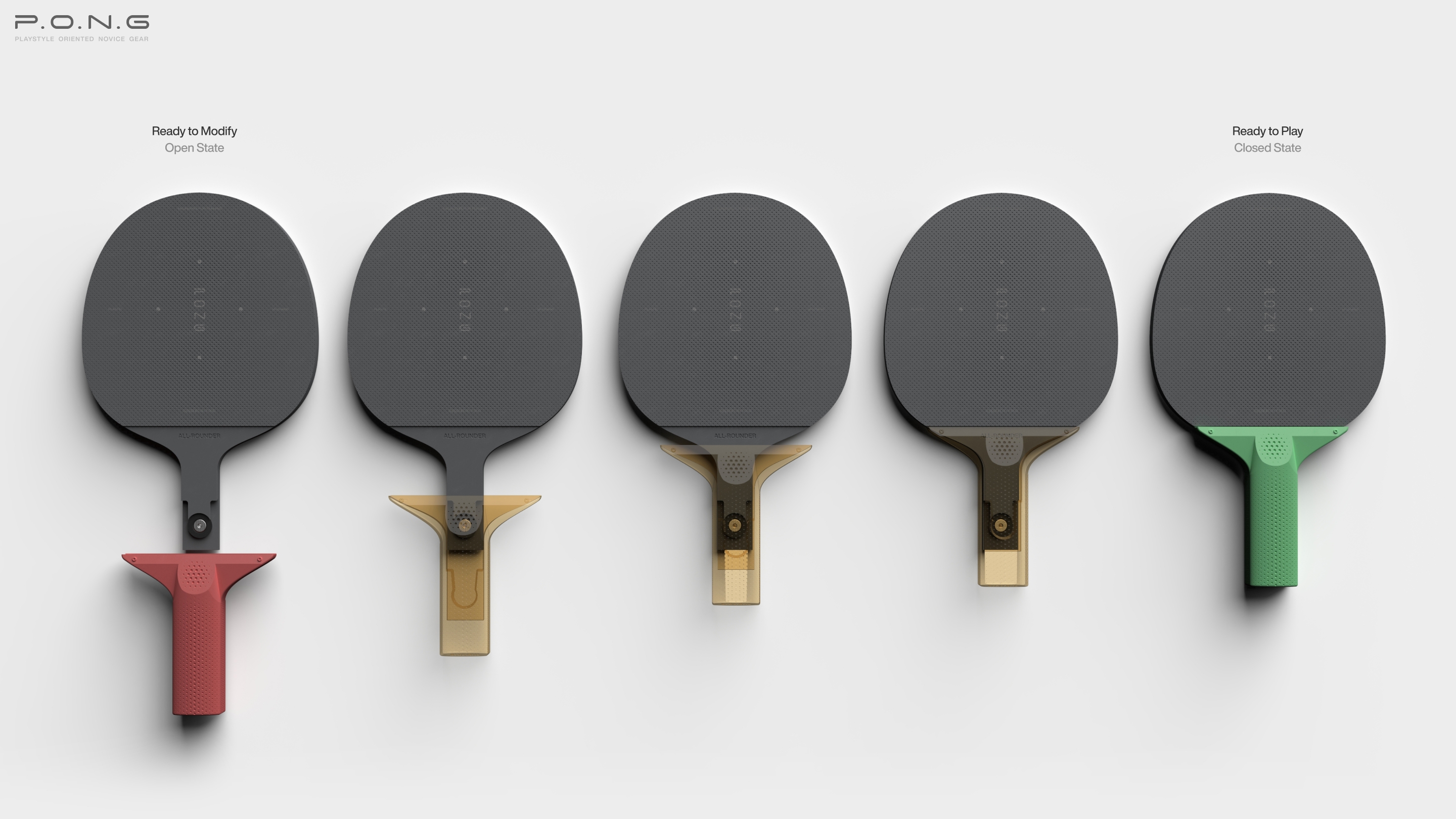 Description P.O.N.G (Playstyle Oriented Novice Gear) is an innovative table tennis training system designed for beginners to discover and refine their playstyle. By offering a modular blade and handle system, P.O.N.G allows users to experiment with 12 unique playstyle combinations, bridging the gap between learning and personalization. The system includes three blade types (Defensive, All-Round, and Offensive) and four handle variations (Straight, Flared, Anatomic, and Penhold), giving users a structured yet customizable experience. Designed to remove the trial-and-error costs associated with purchasing multiple rackets, P.O.N.G provides an intuitive way for players to explore grip comfort, shot precision, and playstyle adaptability. With a seamless attachment mechanism, ergonomic textures, and an integrated learning system through the 7-Stage Combination Comfort Tutorial, P.O.N.G transforms how beginners engage with the sport, creating an accessible and engaging pathway to skill development.