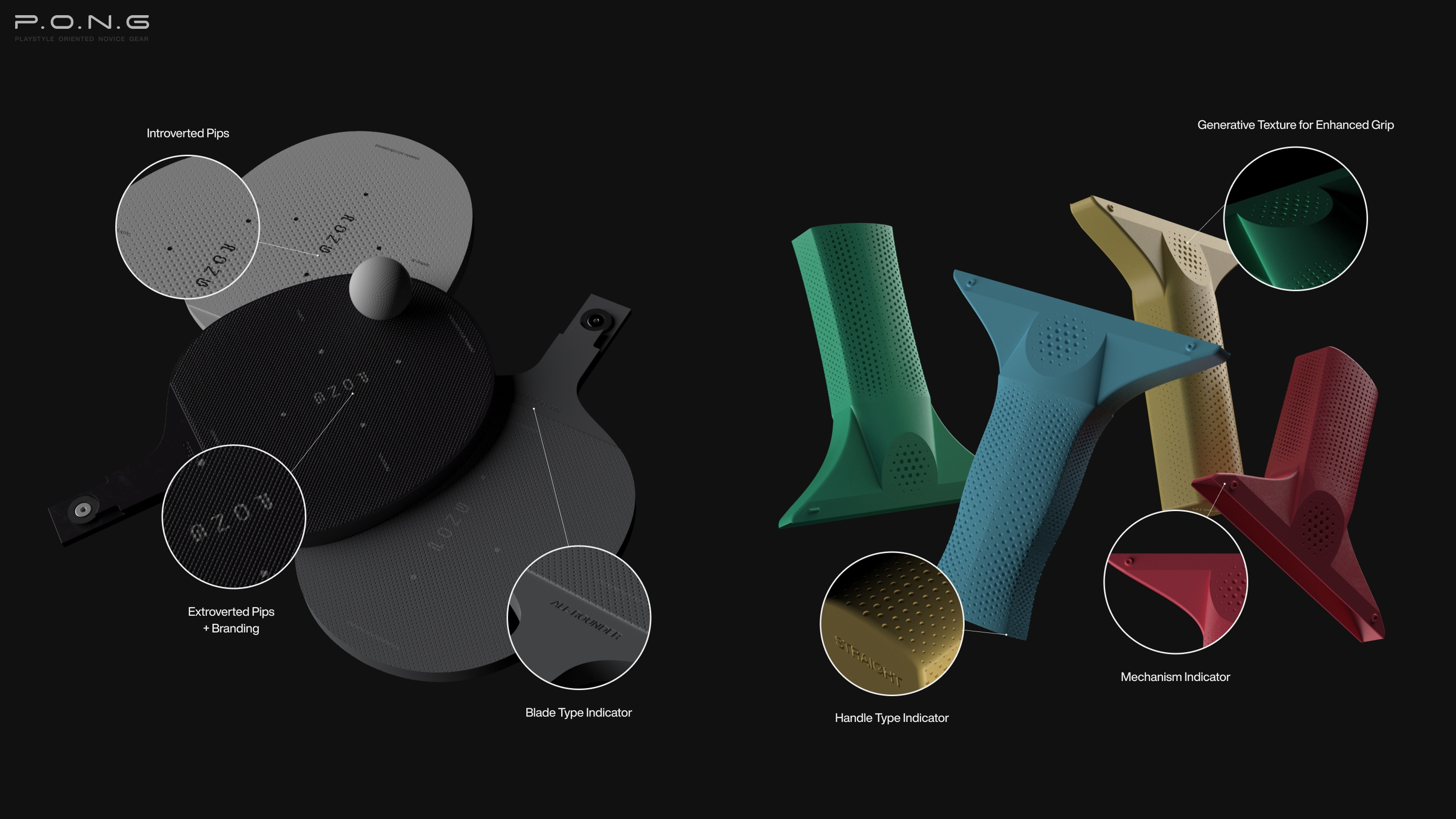 Product Detail P.O.N.G was advanced using NTOP to refine blade and handle textures, ensuring optimized grip, control, and maneuverability. The blade surface replicates traditional pips for enhanced ball contact, while the handle’s interactive texturing provides improved ergonomics. A functional prototype was created using 3D Printing, validating the modular design and interchangeability concept. The ClickLock mechanism, an engineering innovation, ensures a stable yet flexible transition between blades and handles without compromising playability.