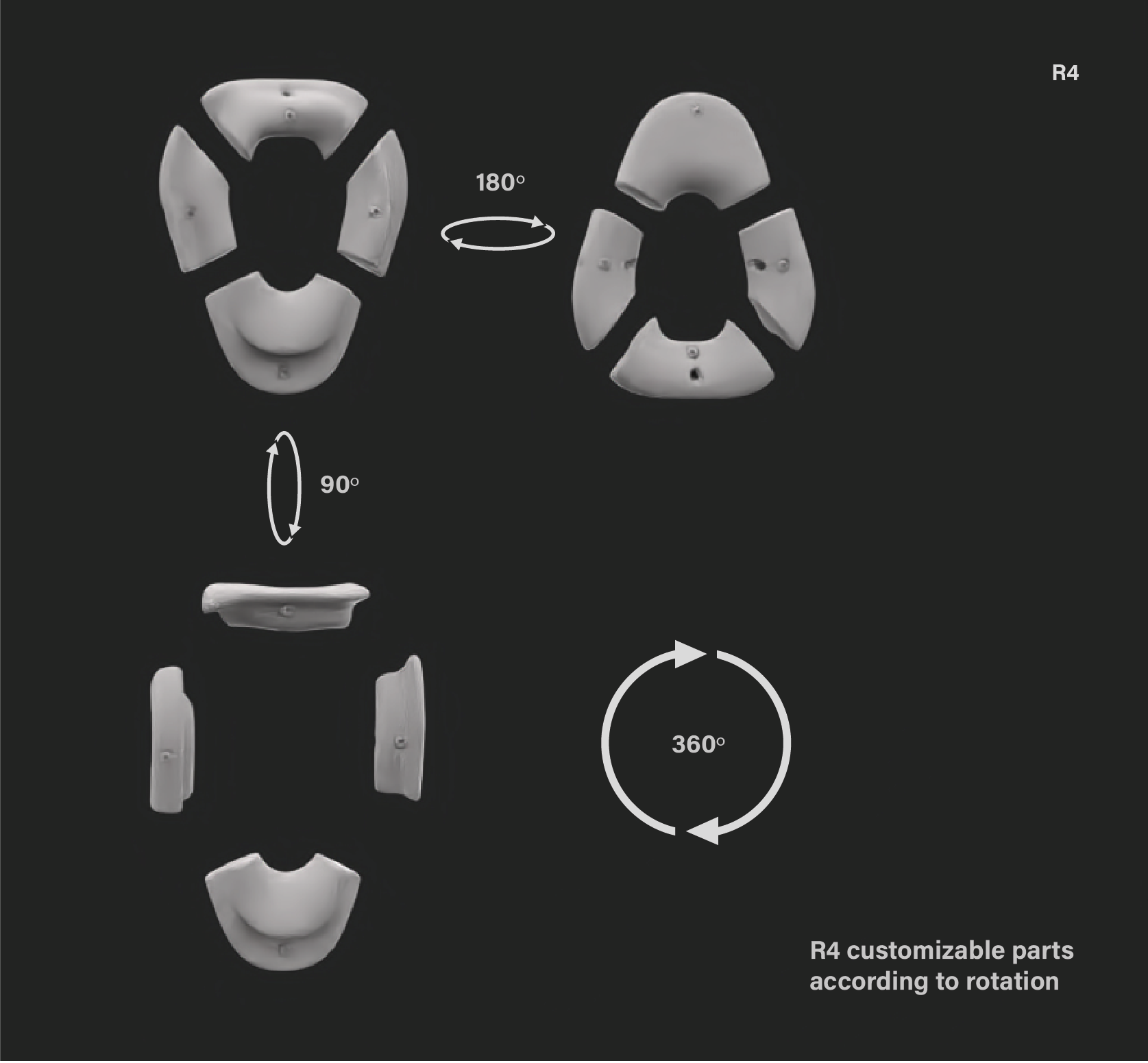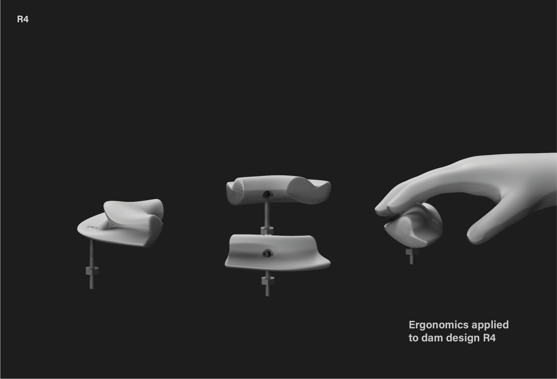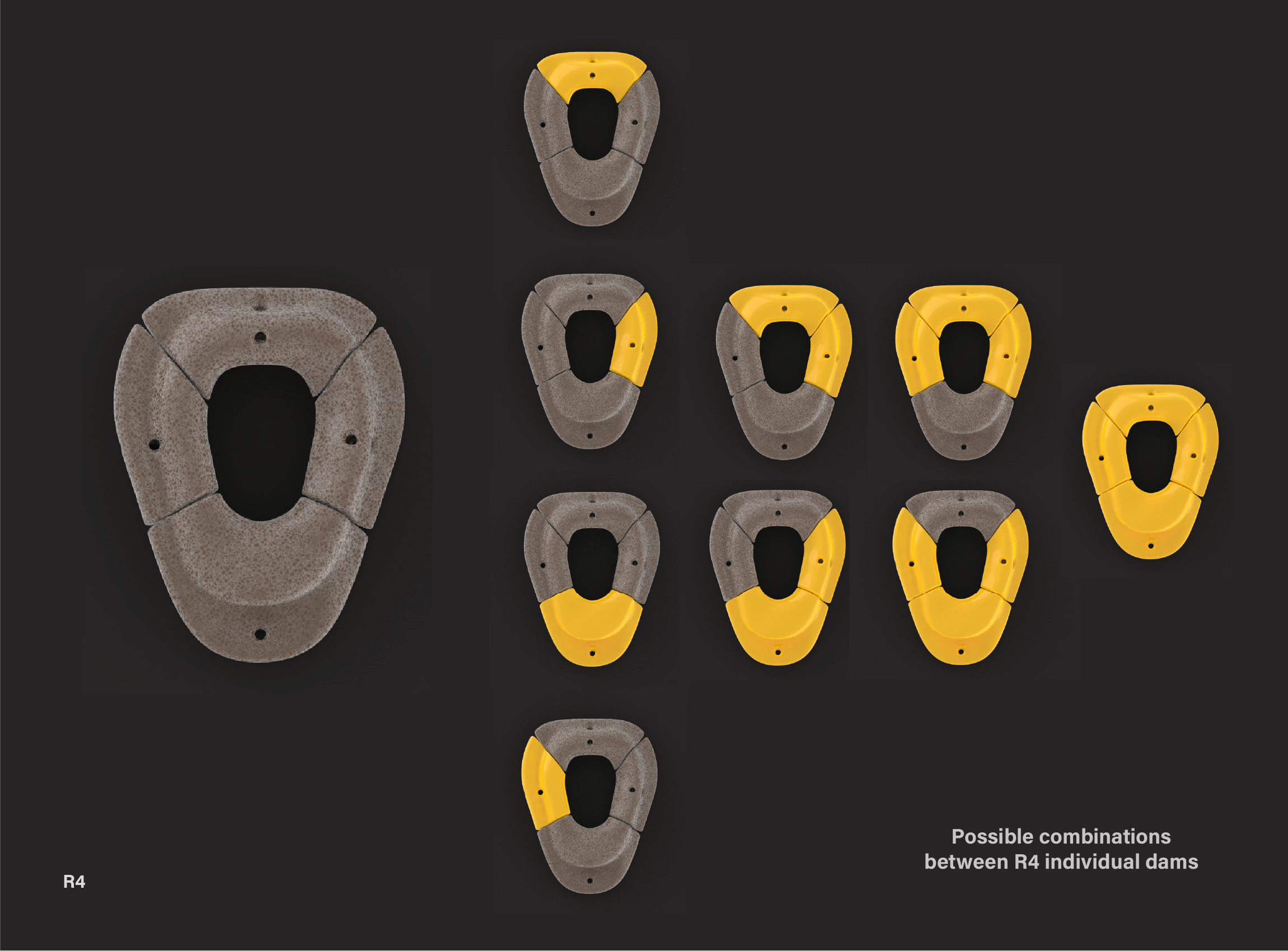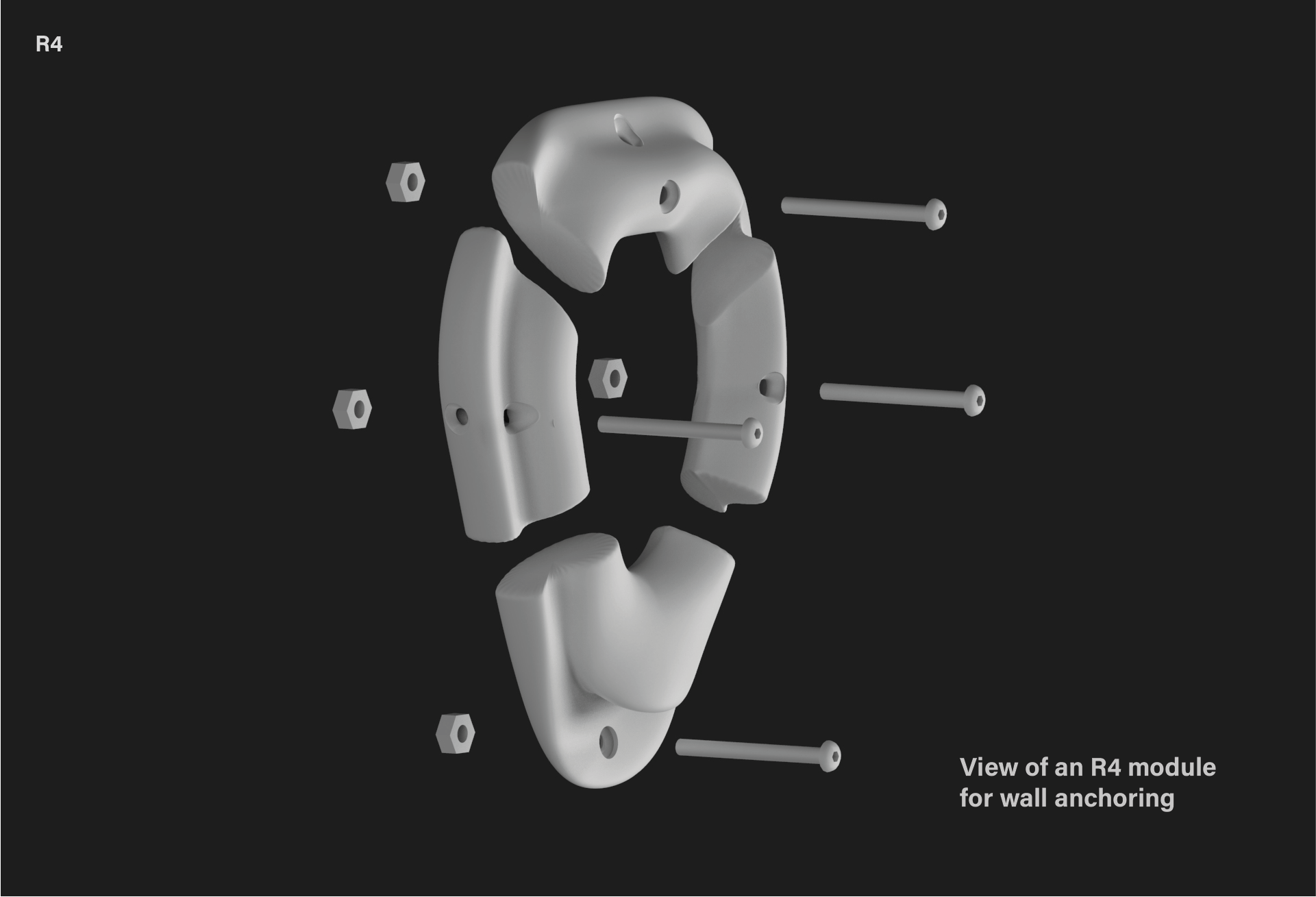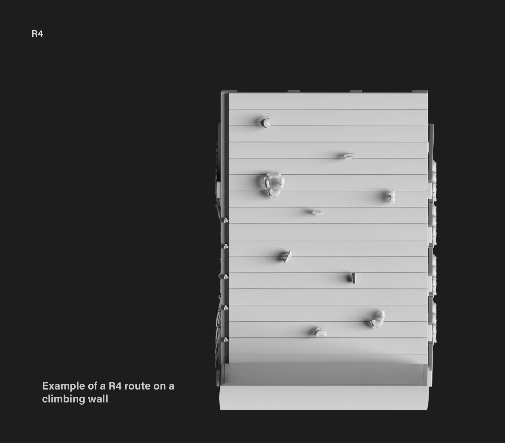 Specification The R4 climbing holds kit consists of eight holds (two complete modules), the necessary anchors (standard anchoring systems used in climbing walls) for installation and templates to facilitate wall mounting.The dimensions of each of the holds are less than (height x width x thickness) 150 x 150 x 60 millimeters and the weight of each piece varies depending on future tests with the material, but the aim is for them to be light and ergonomic to facilitate handling and installation.The colors and finishes of the R4 dams will be defined in the final design phase, taking into account both aesthetic and functional criteria to optimize grip and visibility.