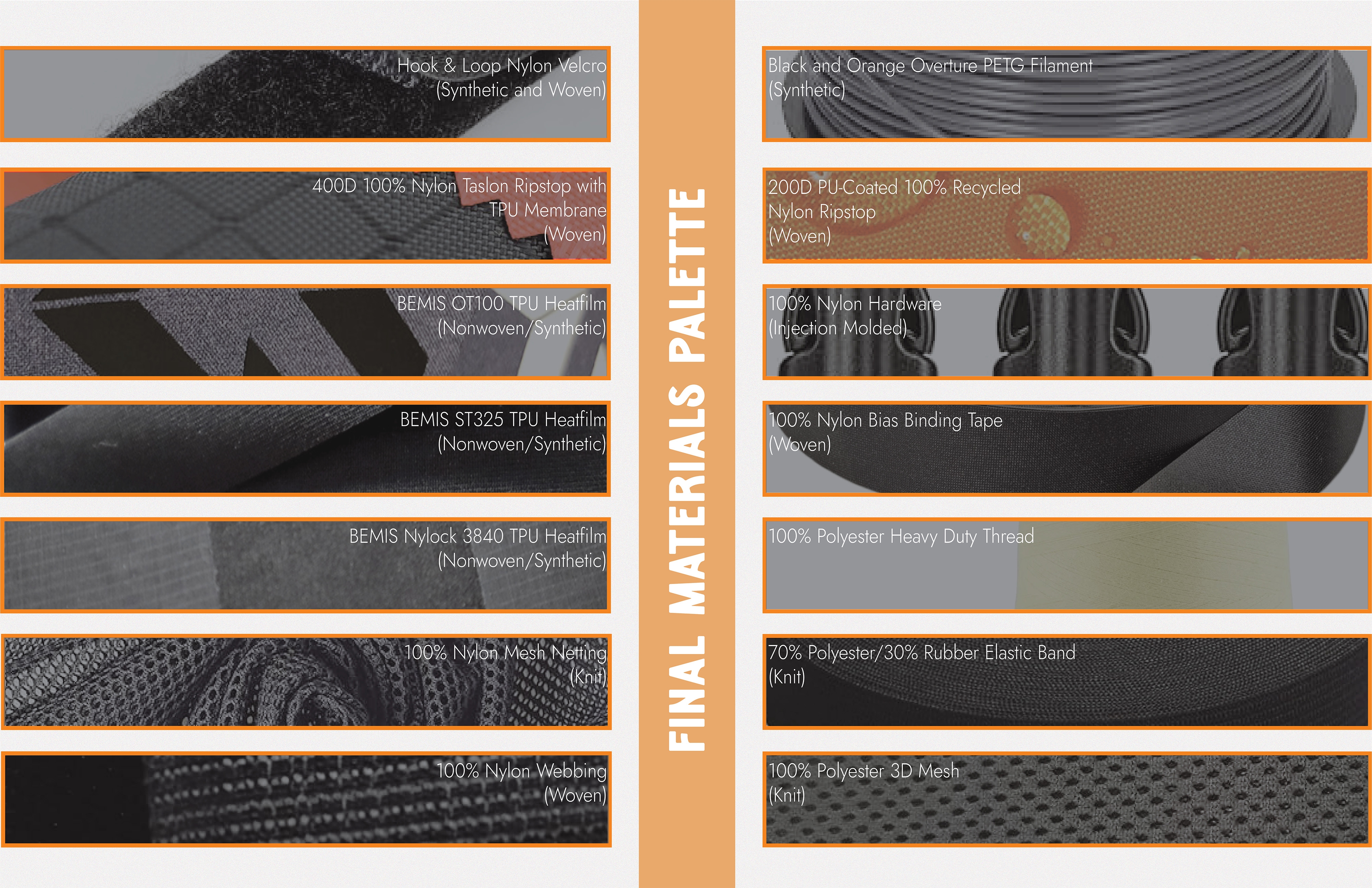 Product Detail Nylon Ripstop, BEMIS Nylock 3840, BEMIS ST360, BEMIS OT100, 100% Polyester Spacer Mesh, Hook & Loop Velcro closure, 100% Nylon injection-molded hardware, 100% Nylon mesh netting, 100% Nylon woven webbing, 100% Woven nylon double fold bias tape, 70% Polyester/ 30%Elastane Elastic band, Black PETG, Orange PETG