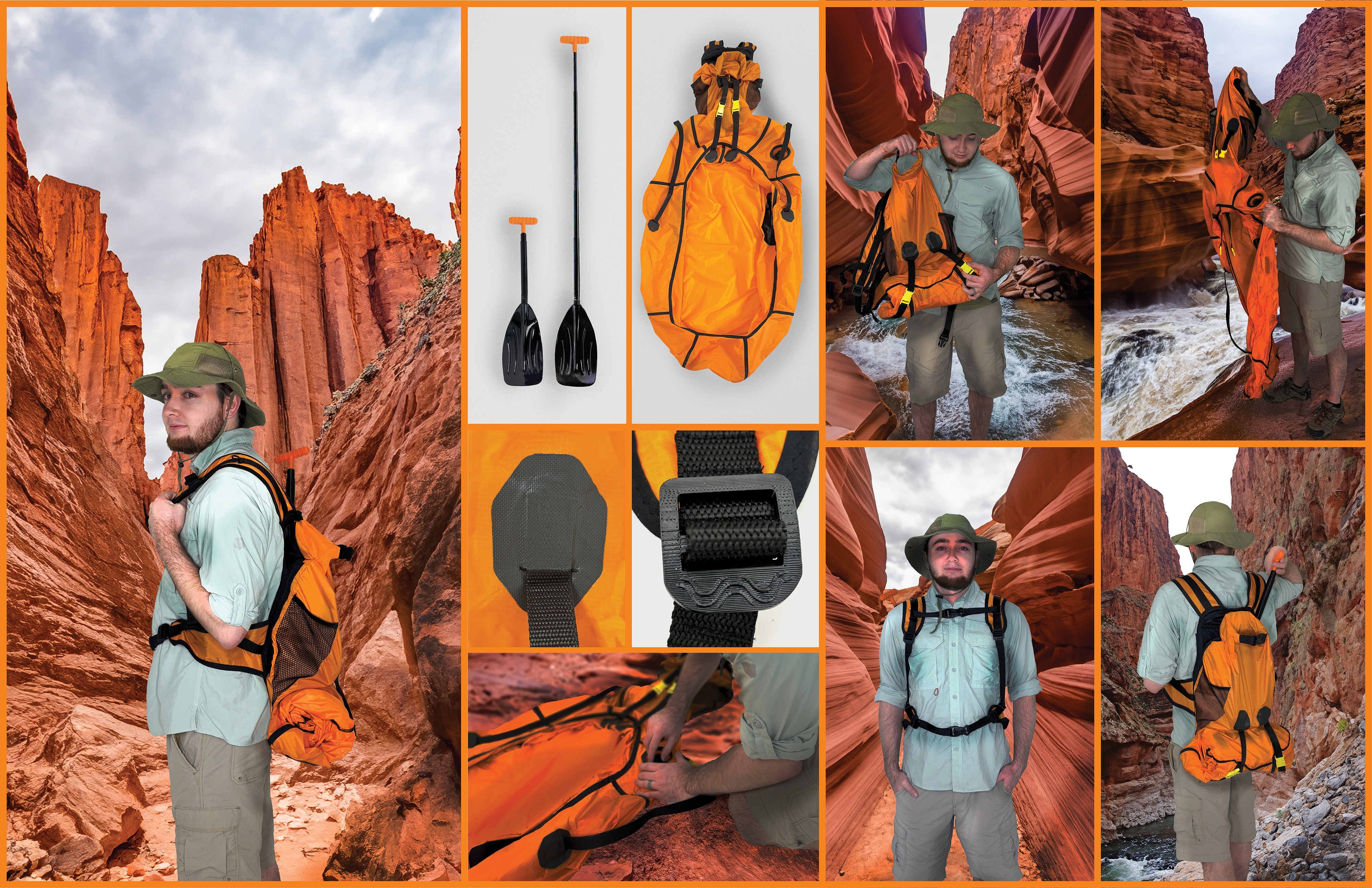 Description A casual 20L drypack with comfortable hip-belt and adjustable shoulder straps, and a removable inner pocket system. This pack quickly transforms into a single-person pack raft with modular pocket spaces for the inner pocket system to attach to. With a specially designed hidden back pocket, a stow-away collapsible oar helps the hiker navigate rough flash floods in the dangerous canyon environment.