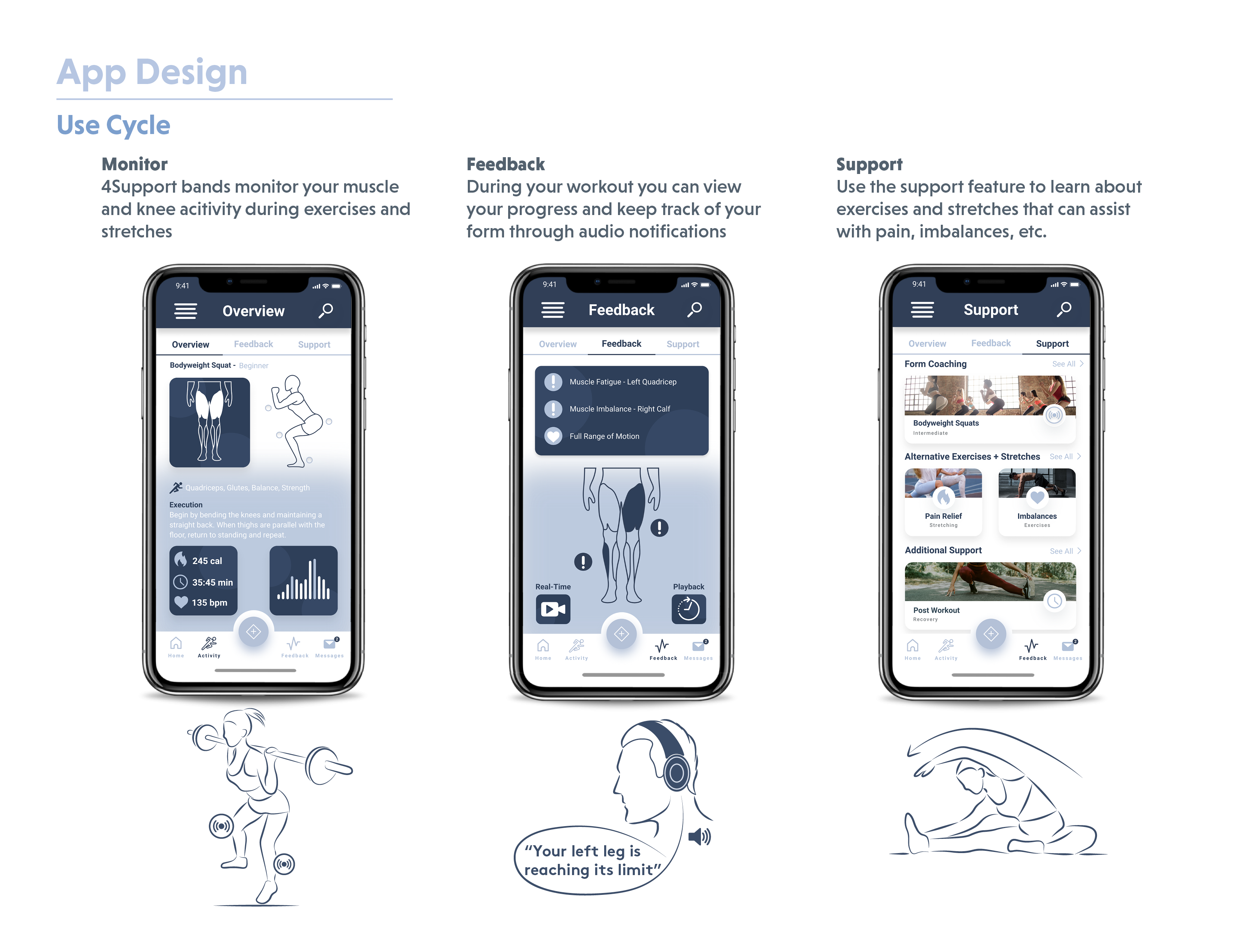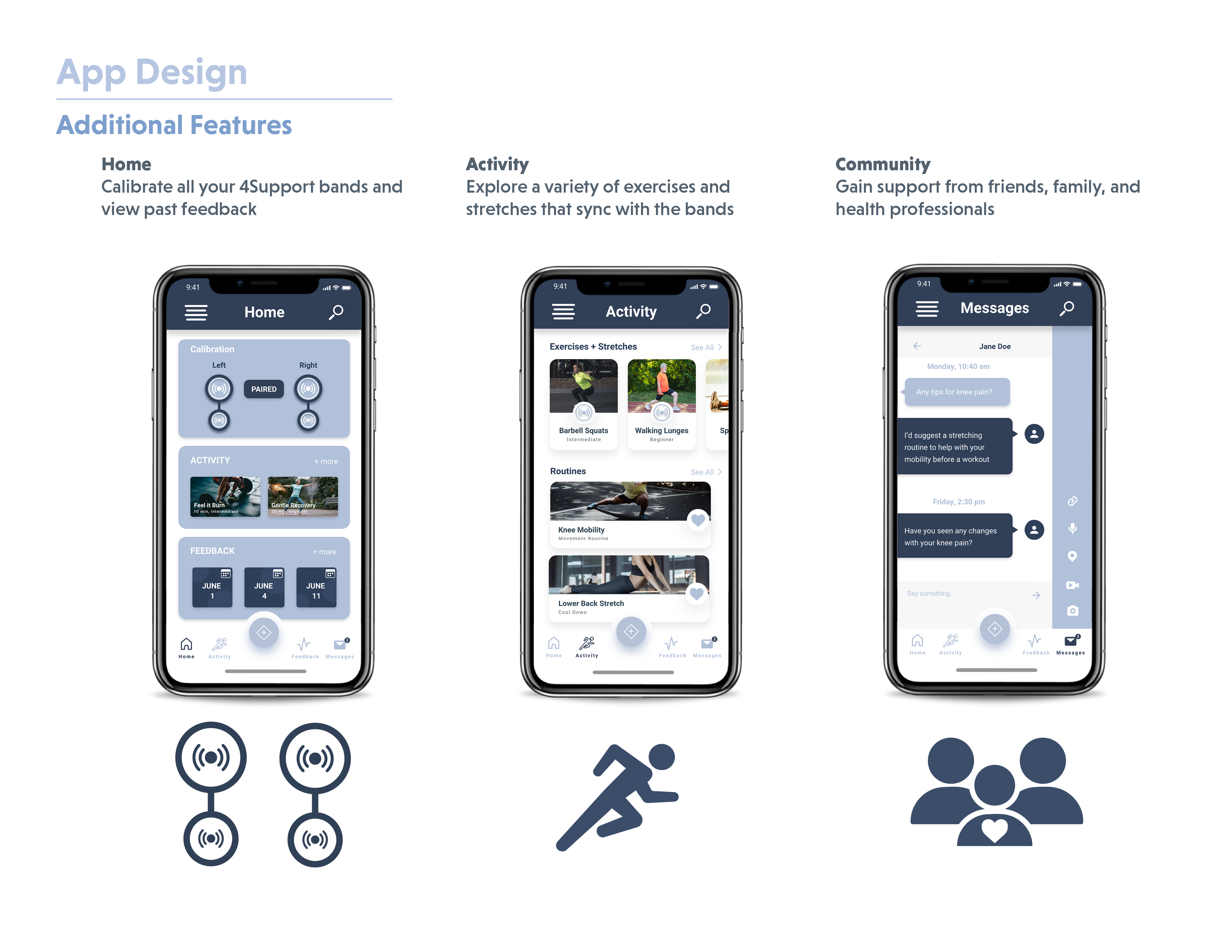 4Support is an innovative tool for injury prevention, rehabilitation, and confident strength training—particularly for older adults. By integrating advanced sEMG sensors that monitor muscle activation with IMU sensors that track knee movement, the system provides real-time insights into exercise form and muscle performance. This data, delivered through a connected mobile app, offers personalized guidance on managing muscle fatigue, correcting imbalances, and optimizing recovery strategies. Its design, featuring comfortable, sweat-resistant silicone bands and a flexible hinge with magnetic connectors, ensures a secure, reliable fit while enabling efficient data transfer. More than just a device, 4Support creates a community of support and shared progress, helping users understand their bodies and train safely as they age.
