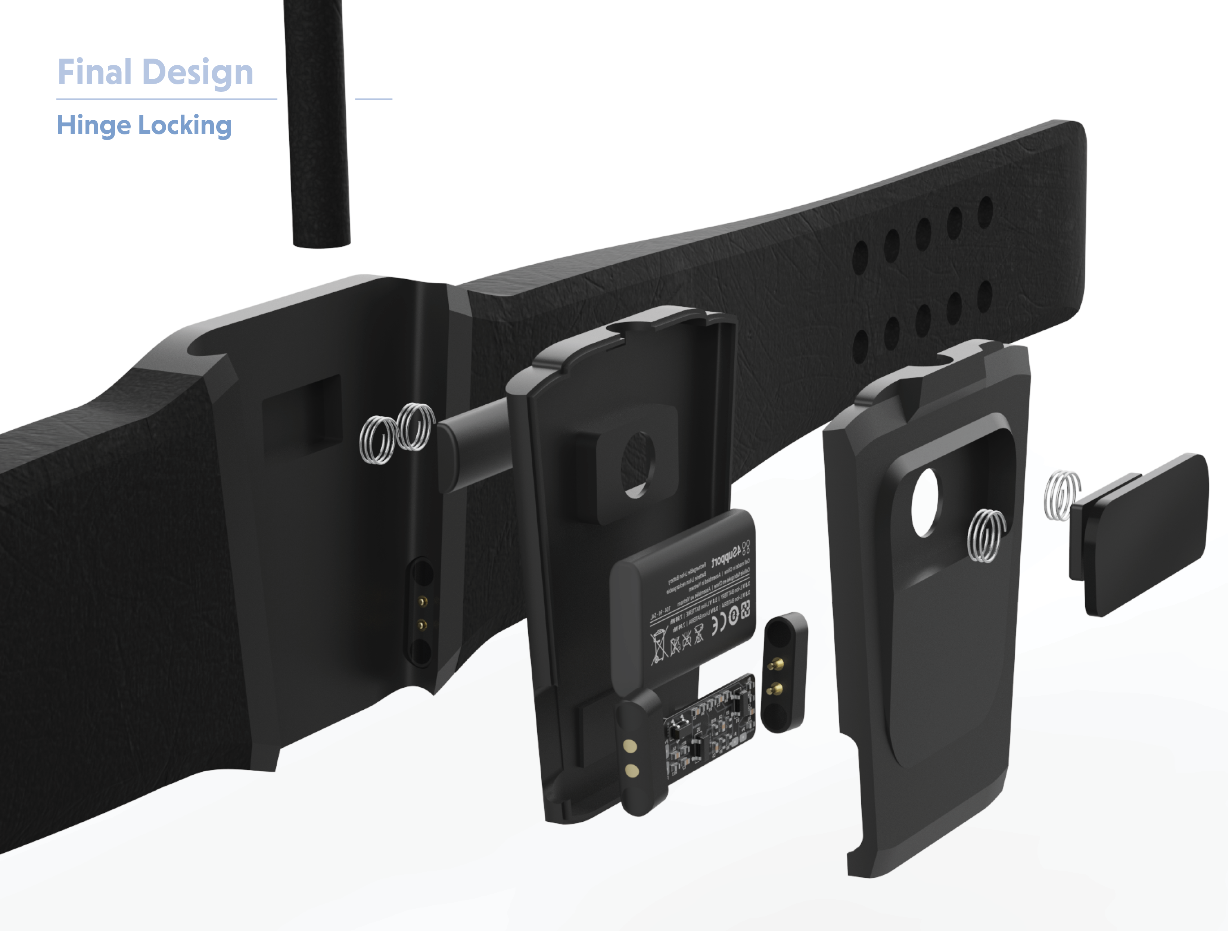 The 4Support system consists of four silicone bands designed for both comfort and sweat resistance, securely wrapping around the upper and lower sections of each leg. The lower band houses a secondary PCB that collects sensor data and transmits it to the primary PCB in the upper band. These bands are connected by a flexible hinge along the outer knee, integrating magnetic connectors that enable seamless power and data transfer through embedded wiring. Strategically placed sEMG sensors over the quadriceps, hamstrings, and calves monitor muscle activation, while IMU sensors positioned at the top and bottom of the knee track joint movement. Together, these sensors work in real time to gather and transmit data via a Bluetooth 4.0 chip in the primary PCB, providing users with valuable insights into their training, mobility, and recovery.